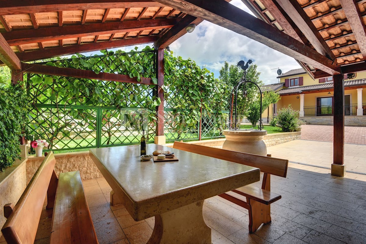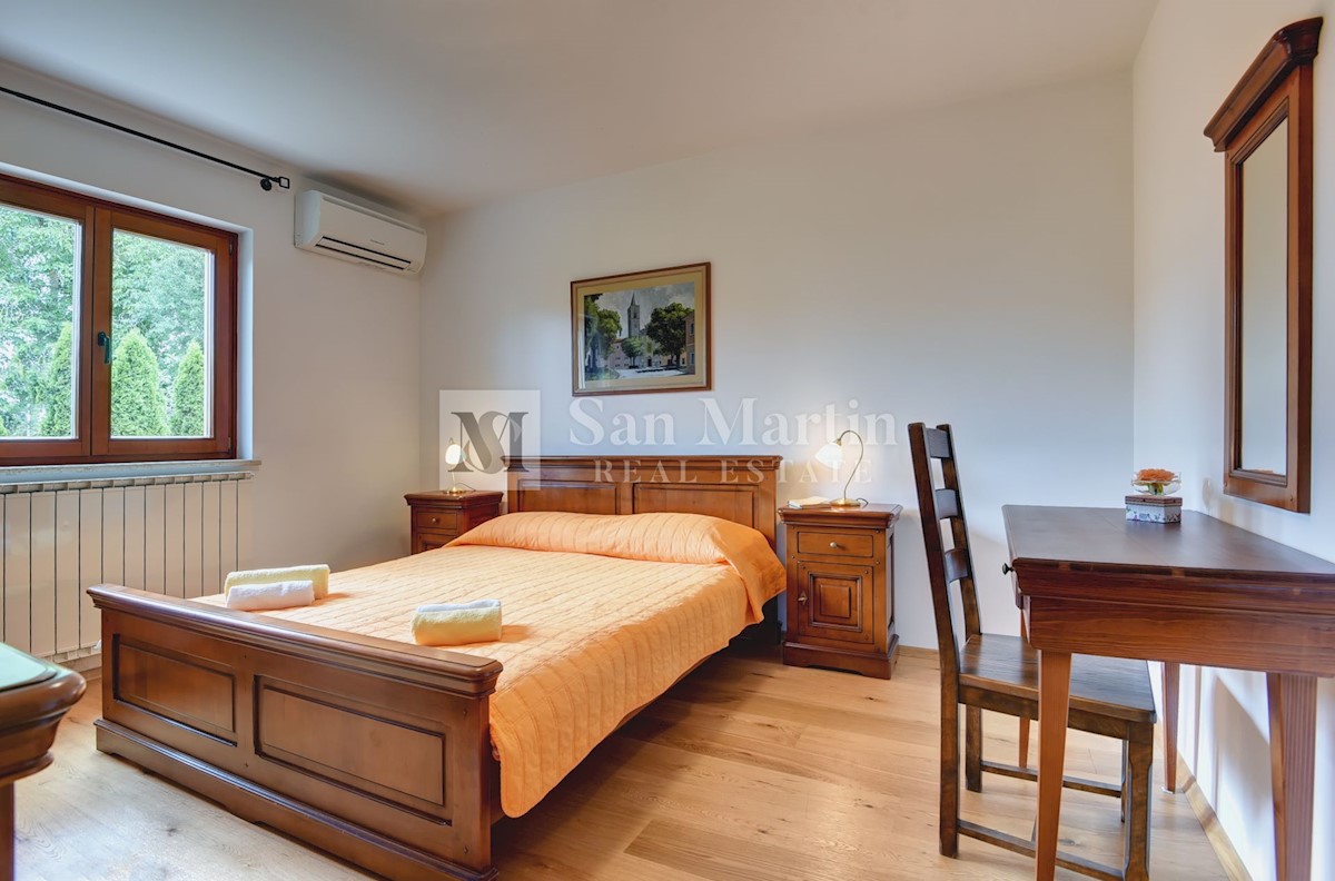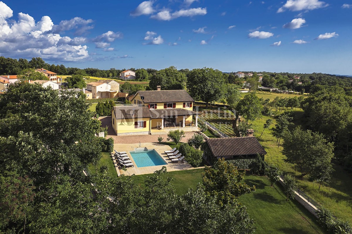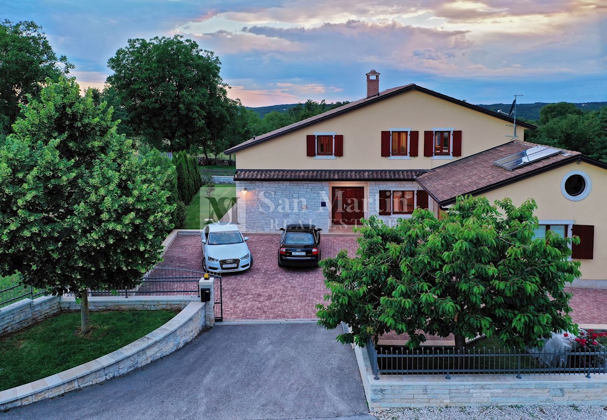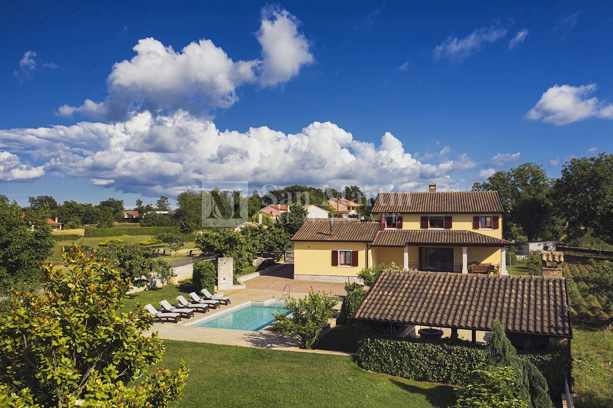 Istra, Poreč-okolica, kuća s bazenom na velikoj okućnici U lijepom mirnom mjestu okruženom zelenilom na okućnici od 1521 m2 smjestila se kuća ukupne površine 390 m2. Kuća se prostire na dvije etaže, ima podrum sa konobom, prostrani vrt u kojem se smjest
