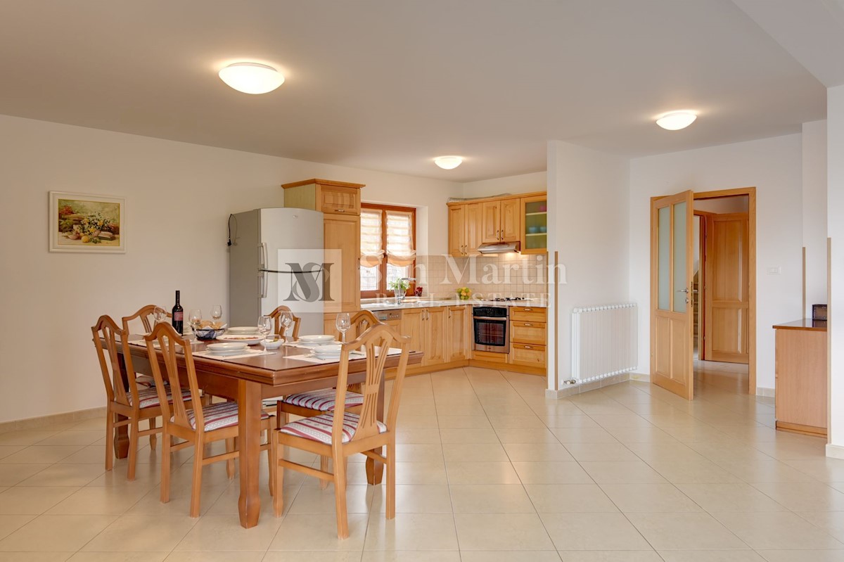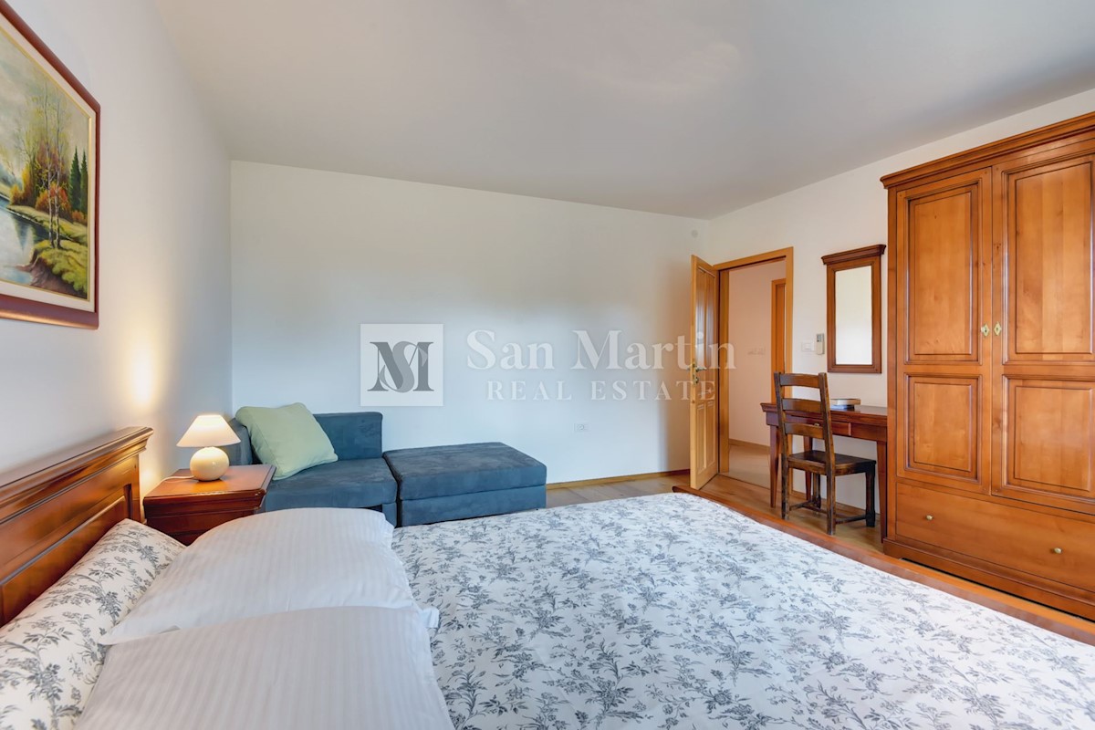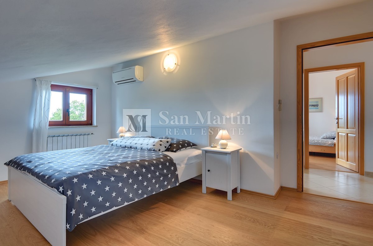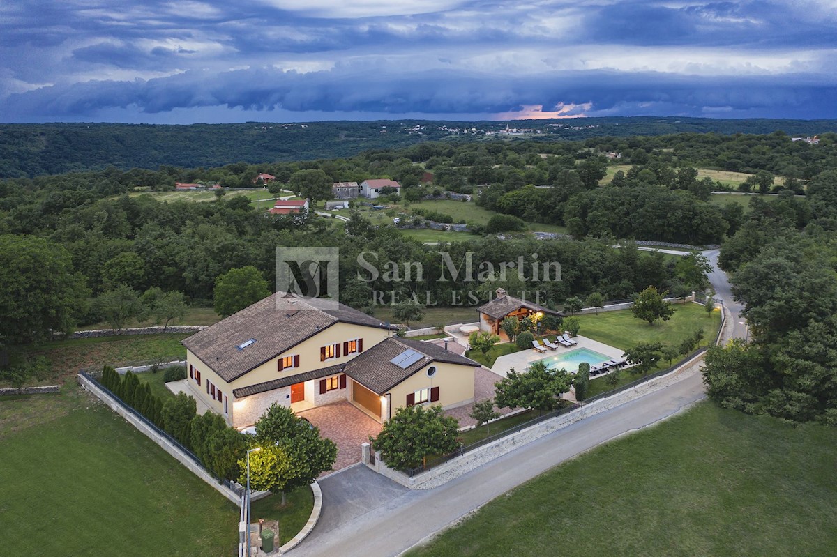 Istra, Poreč-okolica, kuća s bazenom na velikoj okućnici U lijepom mirnom mjestu okruženom zelenilom na okućnici od 1521 m2 smjestila se kuća ukupne površine 390 m2. Kuća se prostire na dvije etaže, ima podrum sa konobom, prostrani vrt u kojem se smjest