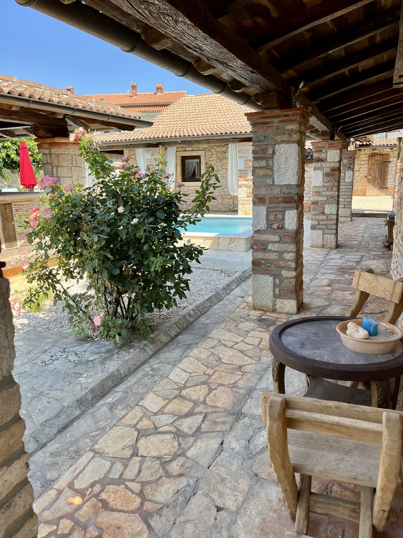 Prekrasna, renovirana kamena kuća s 3 stana, vrtom i bazenom - pogled na more - udaljenost samo oko 4 km od mora - na prodaju. Malo selo nalazi se na samo 2 km udaljenosti od naselja , gdje se nalazi pekara, frizerski salon, barovi/kafići, restorani i sup