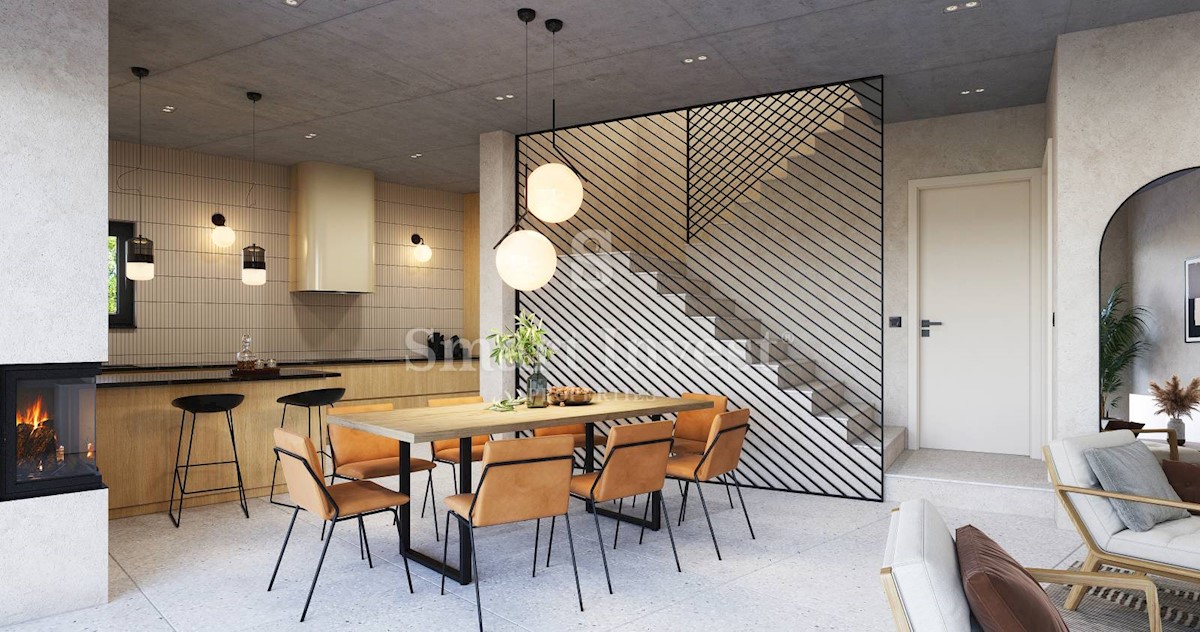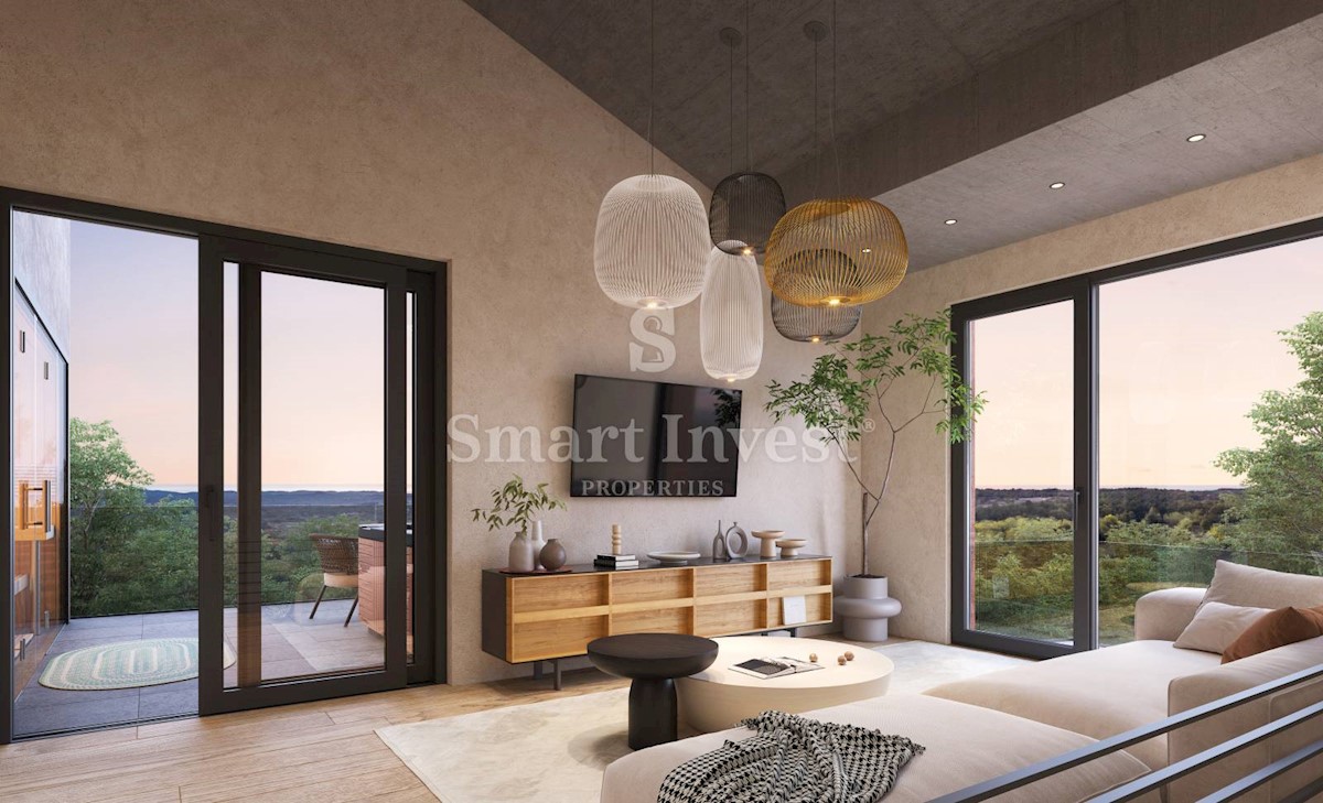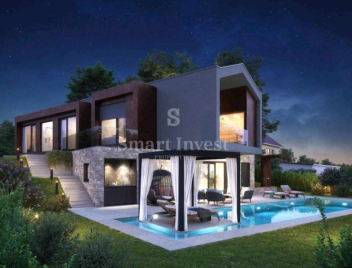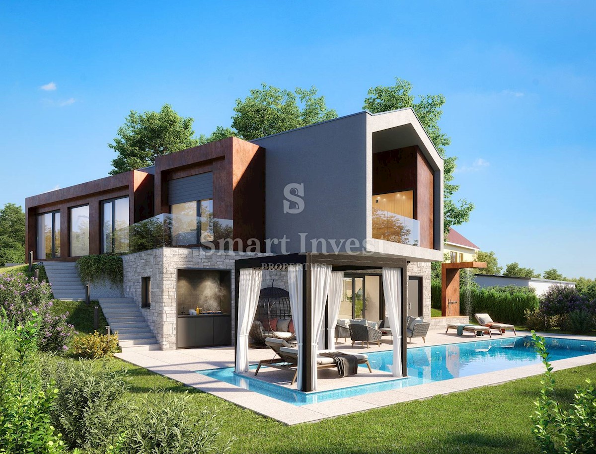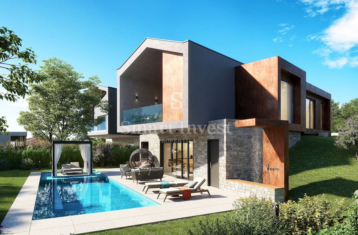 POREČ okolica, Ekskluzivna dizajnerska vila sa wellnessom, grijanim bazenom i pogledom na more na odličnoj mirnoj lokaciji udaljenoj 13 km od mora i centra Poreča. RASPORED I OPREMA Vila neto površine 200 m2 smještena je na zemljištu površine 873 m2, i