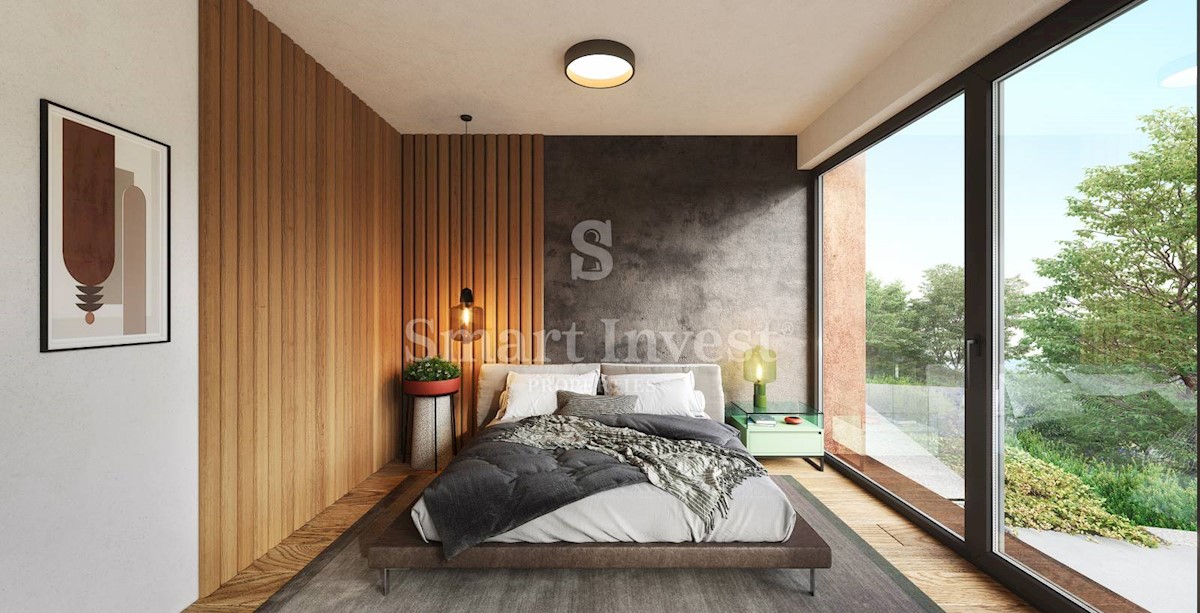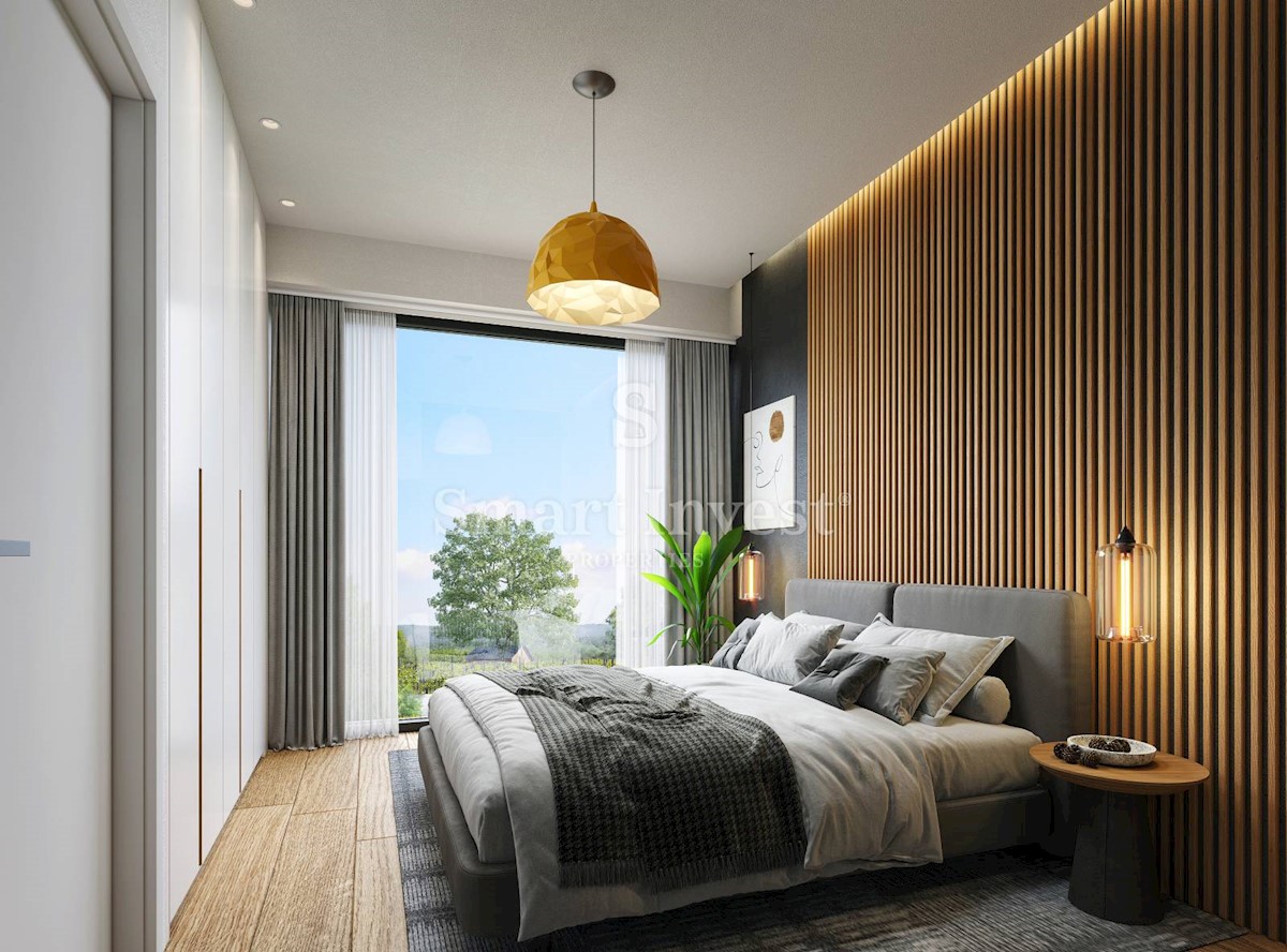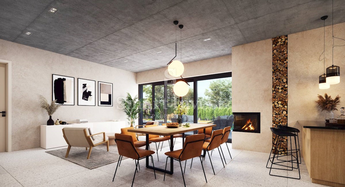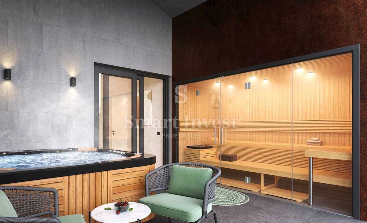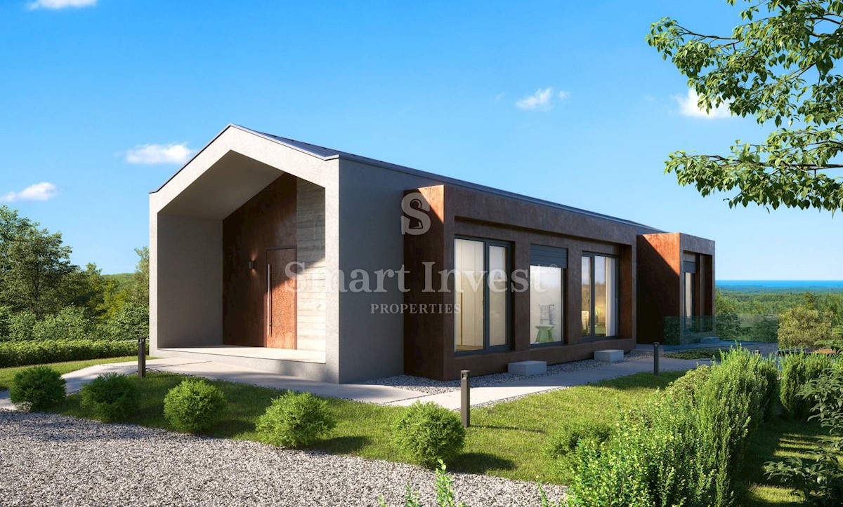 POREČ okolica, Ekskluzivna dizajnerska vila sa wellnessom, grijanim bazenom i pogledom na more na odličnoj mirnoj lokaciji udaljenoj 13 km od mora i centra Poreča. RASPORED I OPREMA Vila neto površine 200 m2 smještena je na zemljištu površine 873 m2, i