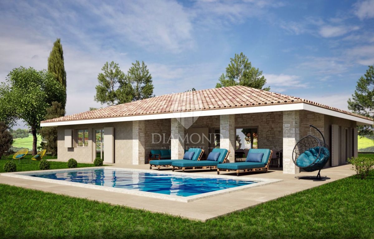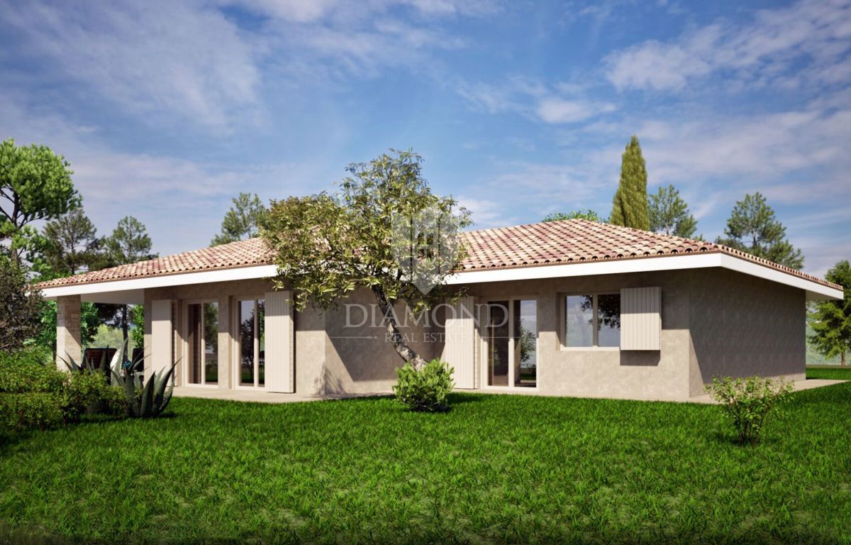 Poreč, okolica, impozantna niskoenergetska prizemnica sa pogledom na more! U neposrednoj blizini grada Poreča na samo 8 km udaljenosti od obale Jadranskog mora i plaža na top lokaciji sa pogledom na more prodaje se ova impozantna niskoenergetska prizemni