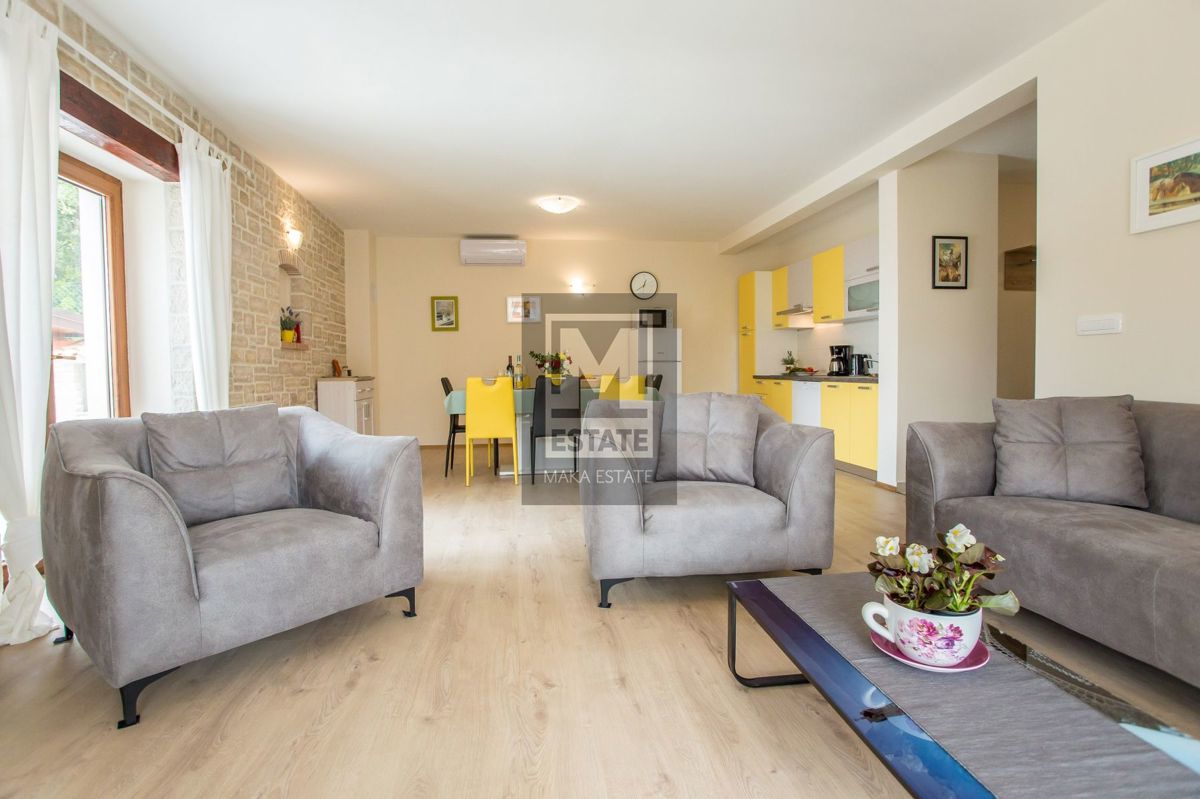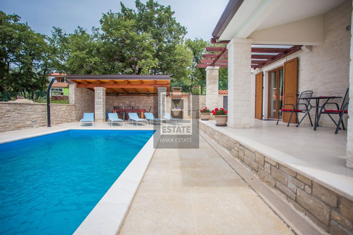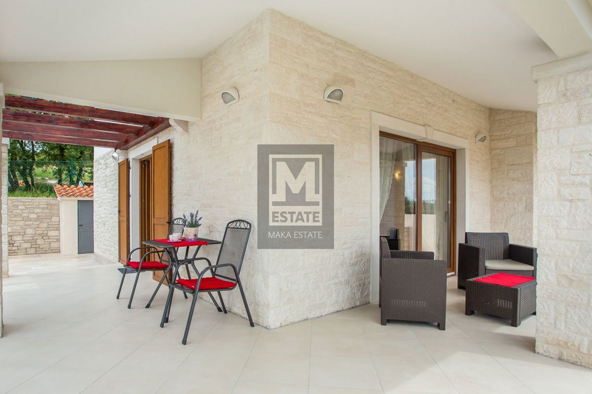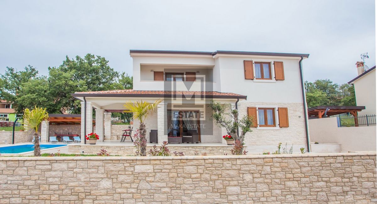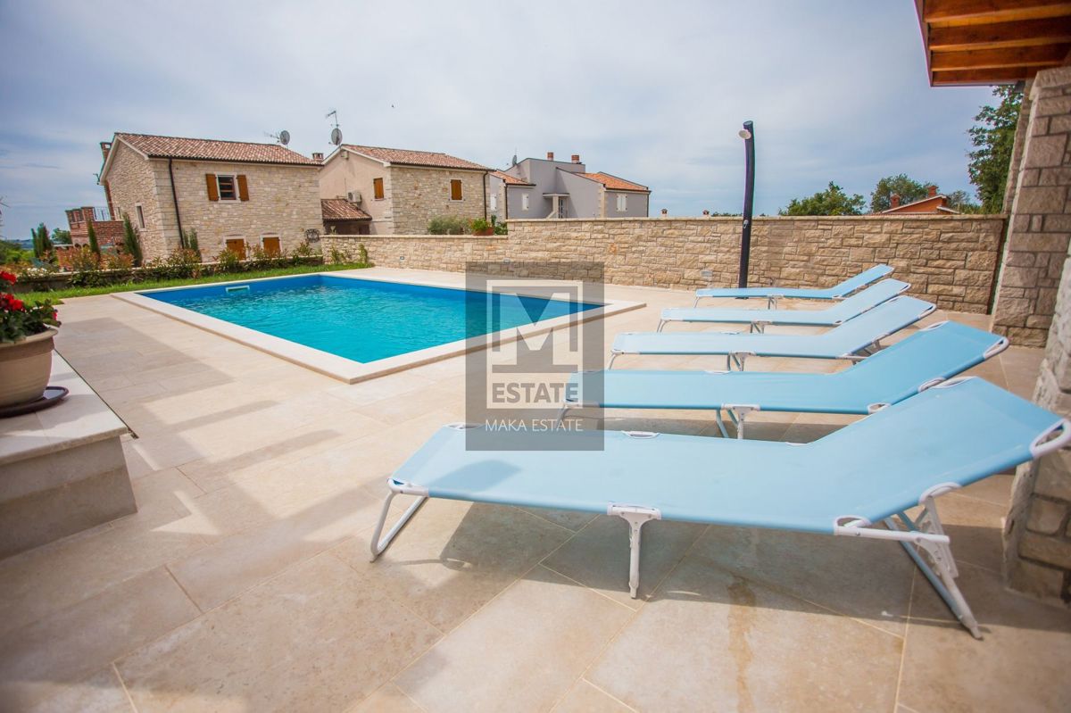 Poreč, okolica, Samostojeća kuća s bazenom i pogledom na more U mirnom okruženju udaljenom 7 kilometara od obale i prvih plaža, te 11 kilometara od živopisnog centra Poreča, smjestila se ova prostrana kuća na parceli od 464 kvadratna metra. Sa svojih 18