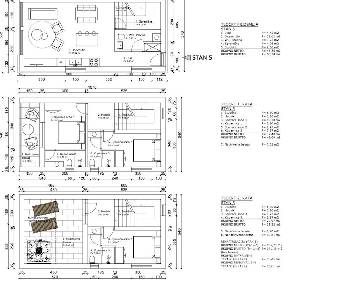 Kuća u nizu, novo gradnja, Poreč U prizemlju: kuhinja, dnevni boravak, wc-praonica, ostava Na katu: dvije spavaće sobe, dvije kupaonice Na drugom katu: jedna spavaća soba, jedno kupatilo Natkrivena terasa Parkirno mjesto Vanjskii bazen
