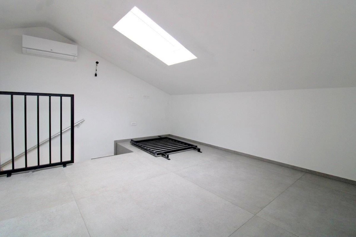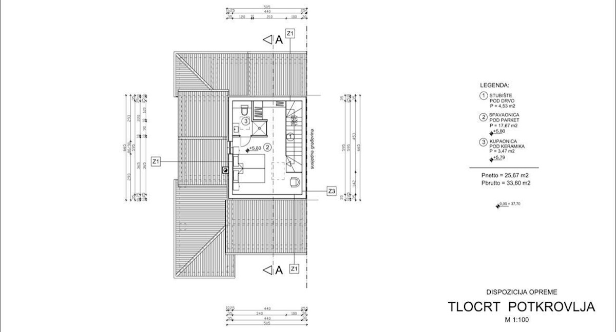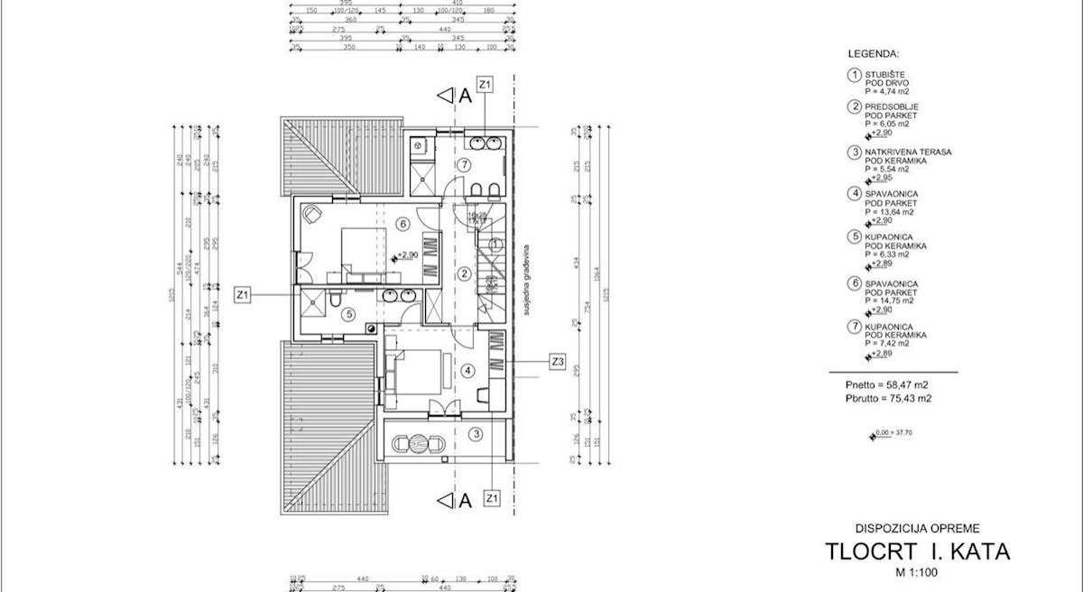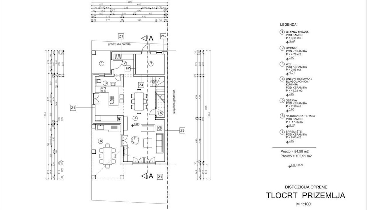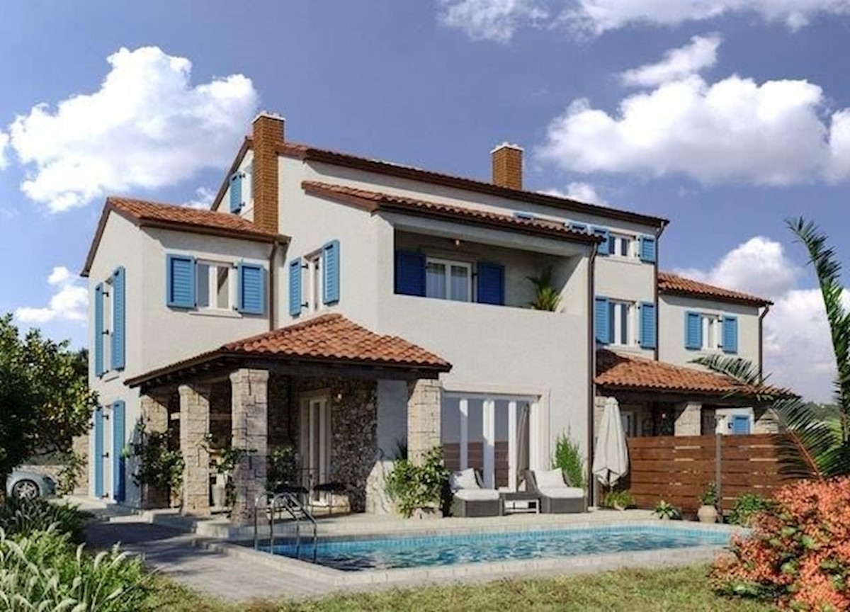 Dvojna kuća se nalazi na udaljenosti 1km od centra grada Poreča i mora, smještena je na zemljištu od 358 m2 i njena stambena površina je 168,72 m2.Kuća se sastoji od tri etaže.U prizemlju se nalazi ulazni hodnik, WC, kuhinja sa blagovaonom i veliki dnevni