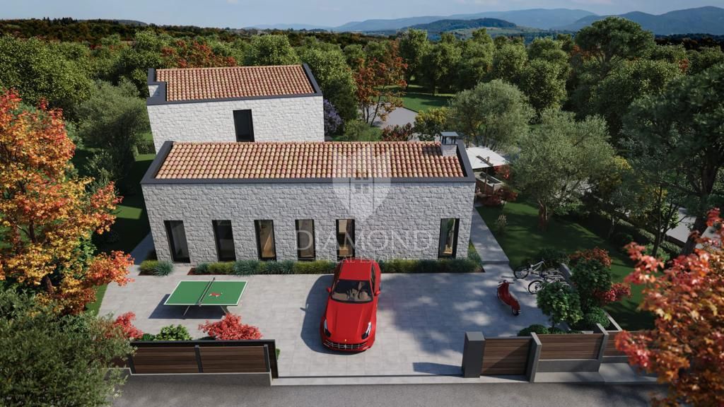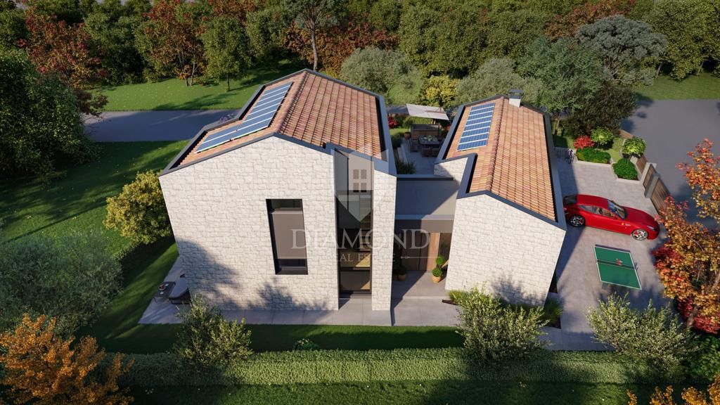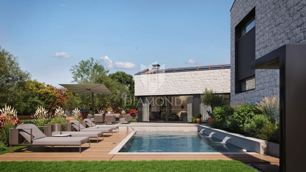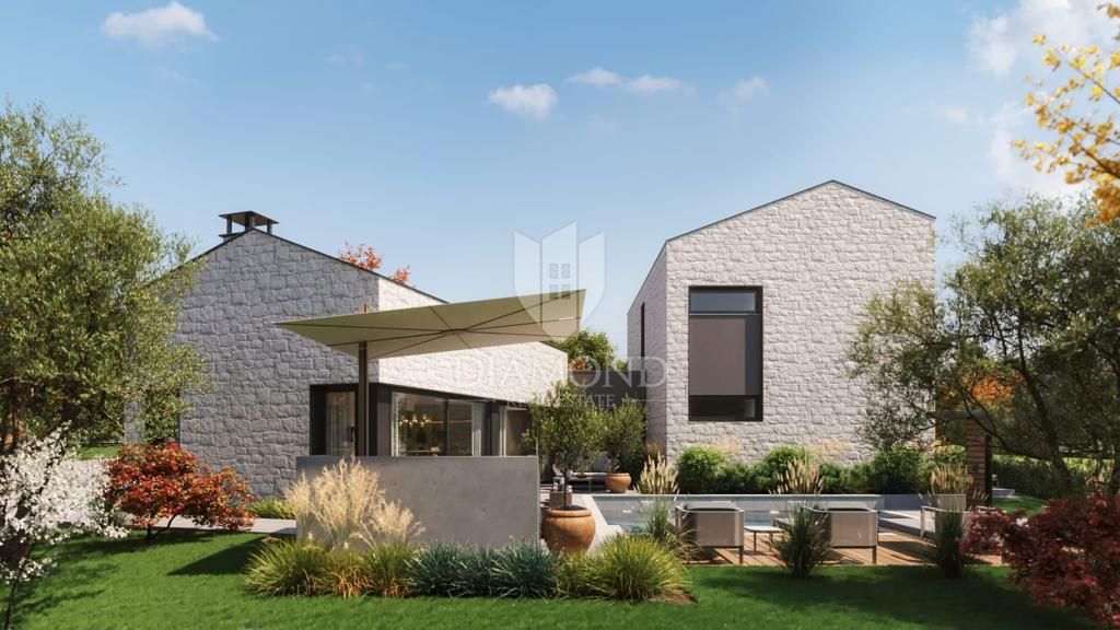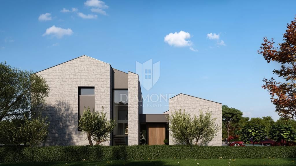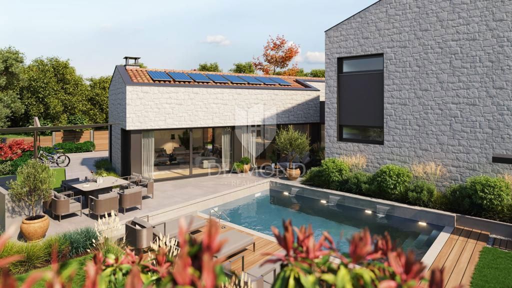 Moderna kamena vila sa bazenom u okolici Poreča Na samo 5 km od Poreča nalazi se ova moderna kamena vila u izgradnji. Njezina ukupna površina iznosi 207m2 i sastoji se od ulaznog hodnika, open space kuhinje sa blagovaonicom i dnevnog boravka koji vodi n