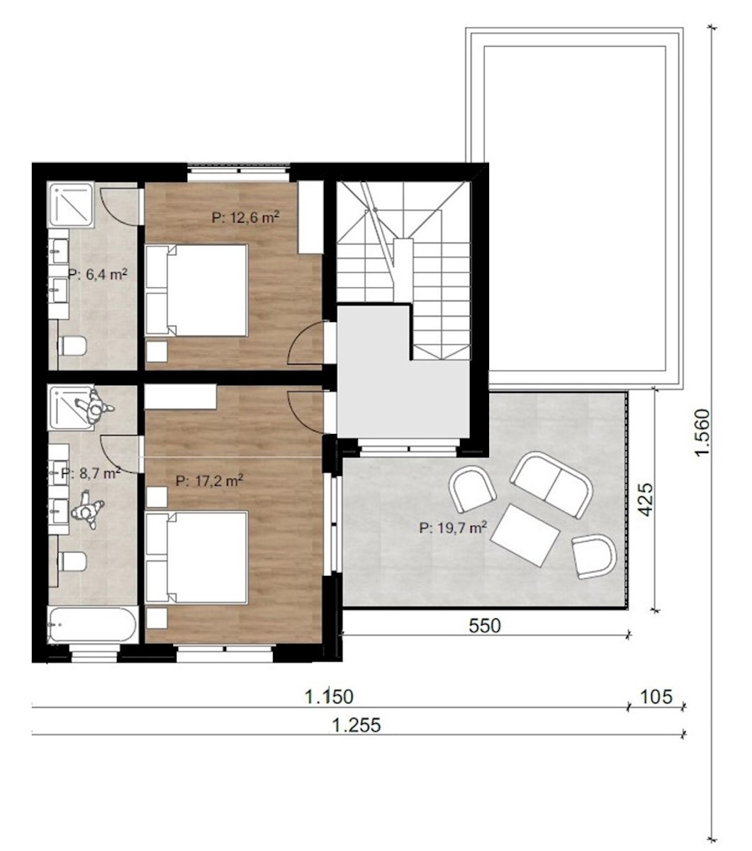 Prodaje se moderna dvojna kuća u izgradnji površine 131 m², sastoji se od dnevnog boravka, kuhinje, blagovaonice, terase, spavaće sobe, kupatila, spremišta, hodnika i ostave u prizemlju te hodnika, 2 spavaće sobe, 2 kupatila i terase na katu kuće. Kuća im
