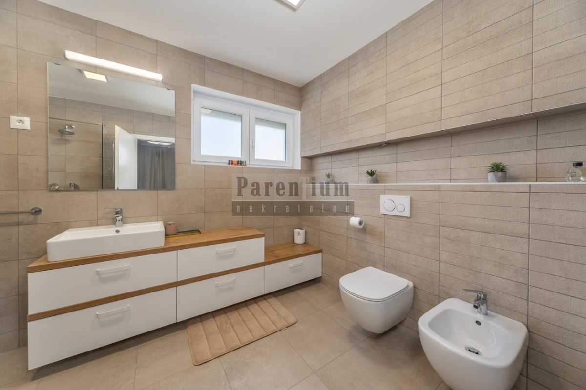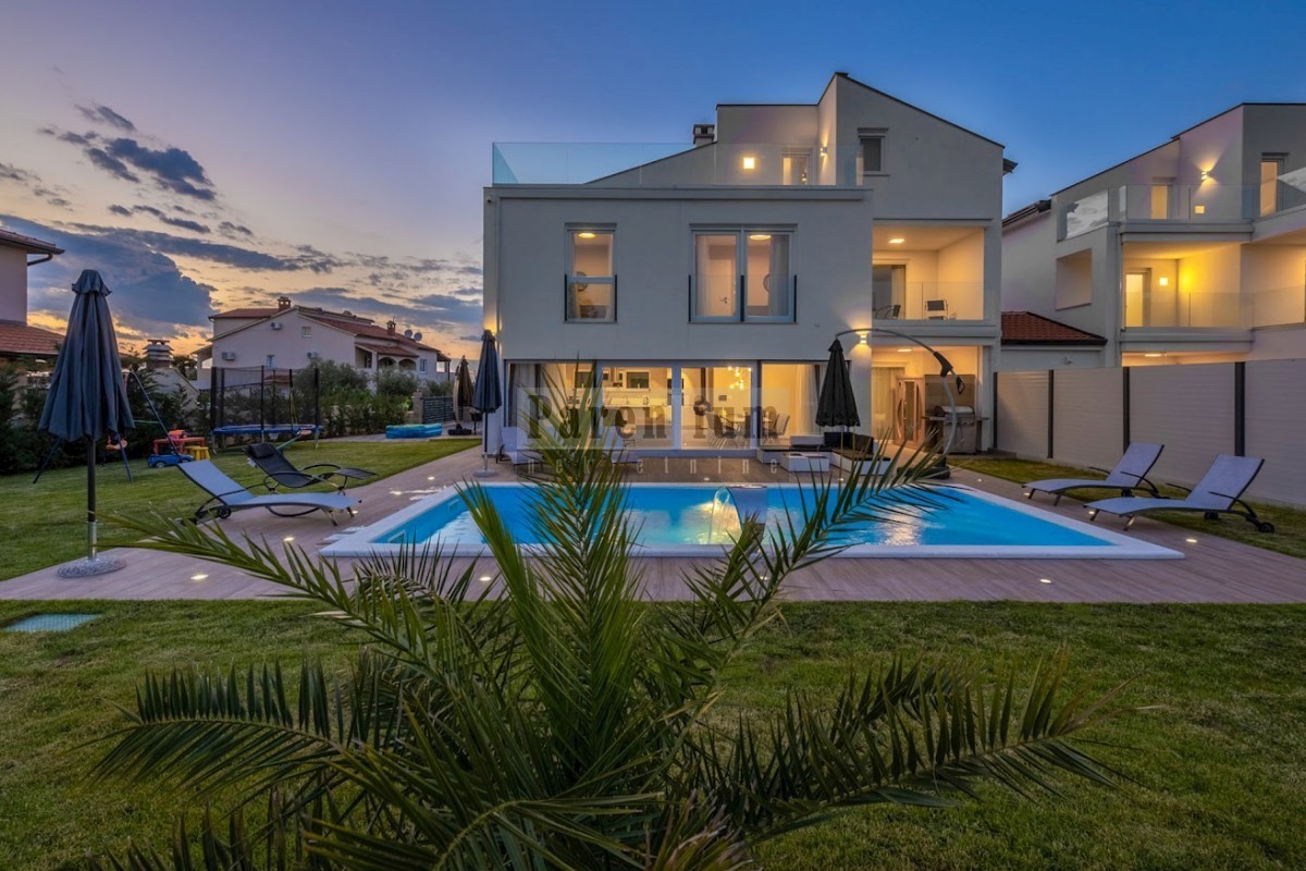 Poreč, Prodaje se ova lijepa dvojna kuća, sa pogledom na more. Kuća je udaljena 5 km od mora i 6 km centra grada. Smještena u mirnom naselju. Vila se sastoji se od 6 spavaćih soba , 4 kupaonice, jednog wc-a za goste , kuhinje, blagovaone, dnevnog borav