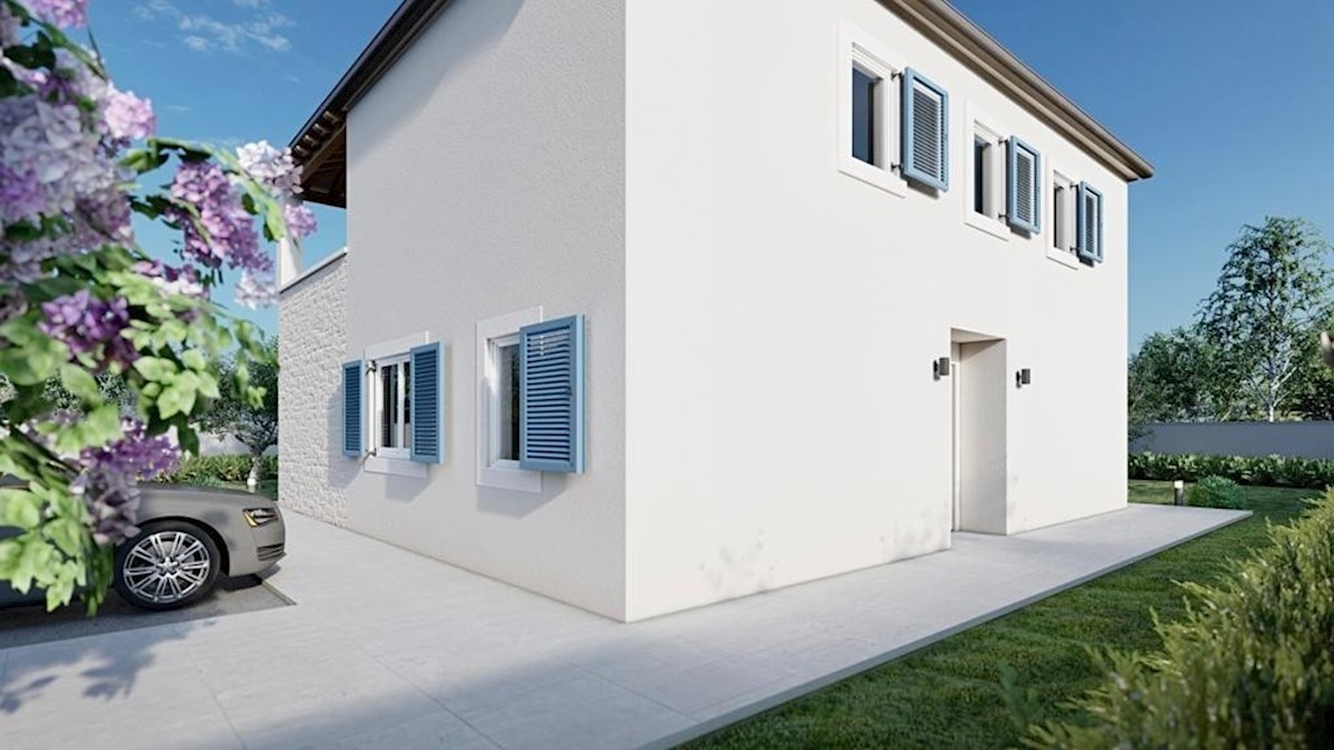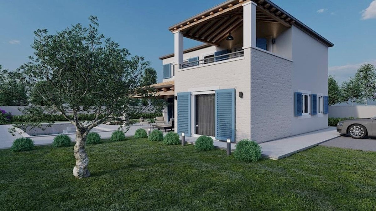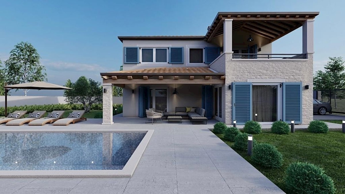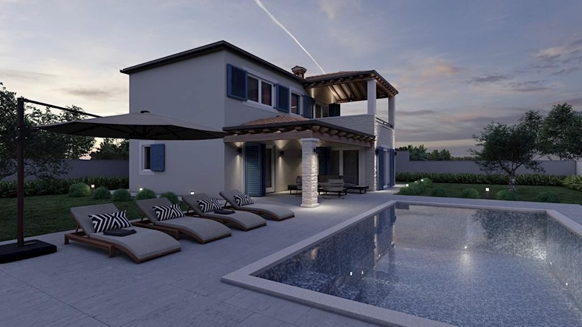 Poreč, okolica- na prodaju nova vila sa bazenom površine 163 m2 koja se prostire na parceli površine 745 m2. Nalazi se cca 7 km od mora, a prva trgovina i kafić udaljeni su cca 3 km- Kuća se sastoji od ulaznog hodnika, open space dnevnog boravka ,kuhinje