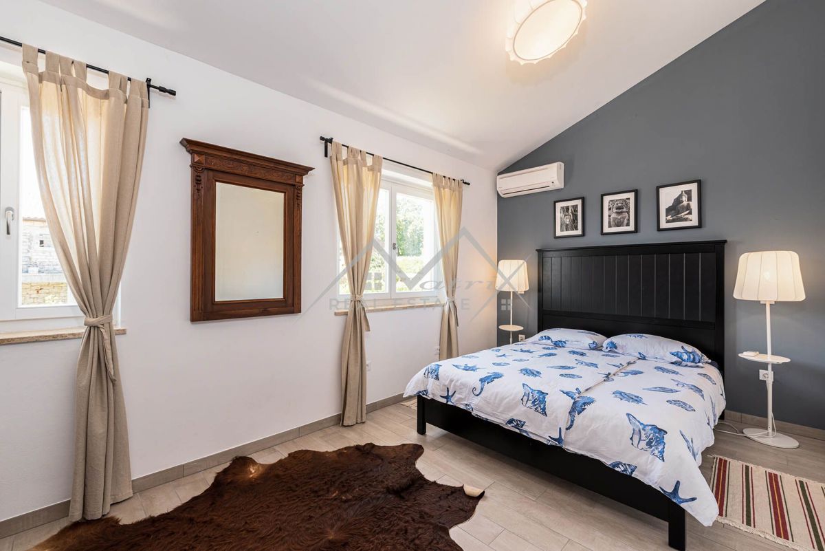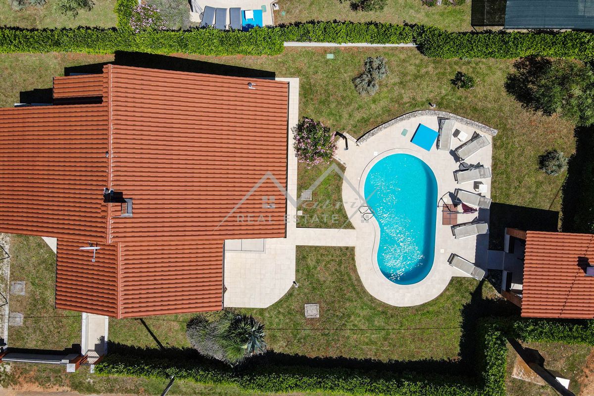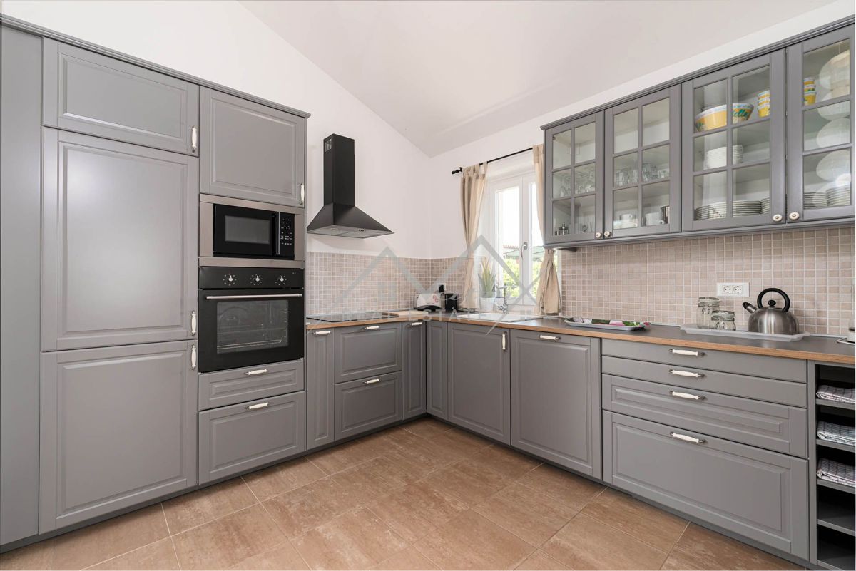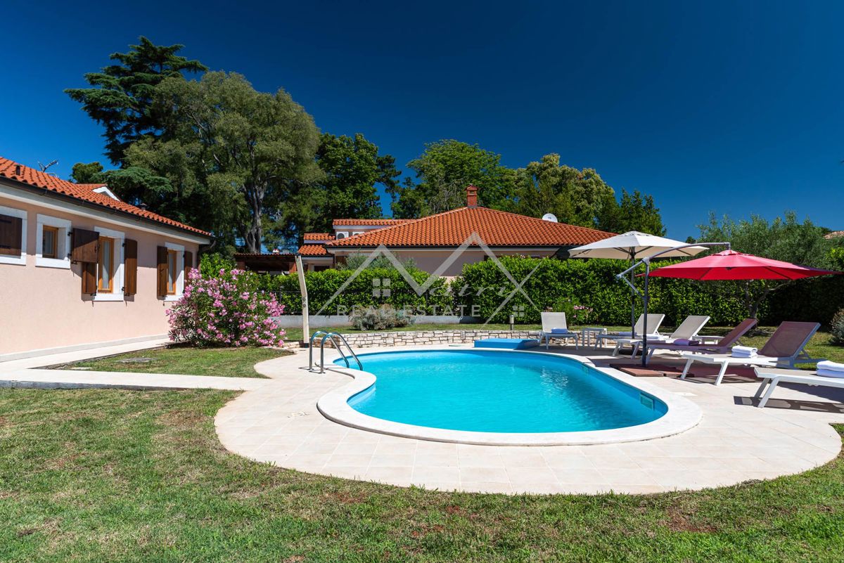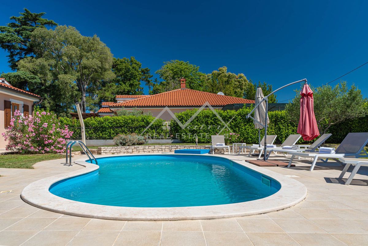 Poreč, okolica - Prekrasna prizemna kuća s bazenom na mirnoj lokaciji! Prodaje se ova prekrasna prizemnica s bazenom, potpuno opremljena i namještena kako je vidljivo na slikama, ukupne stambene površine 144 m2. Kuća se nalazi u mirnom naselju, u blizini