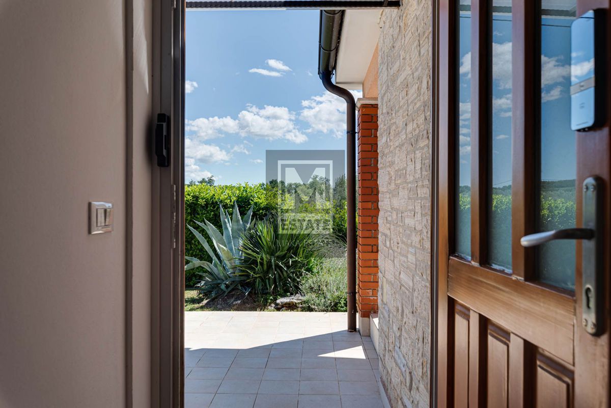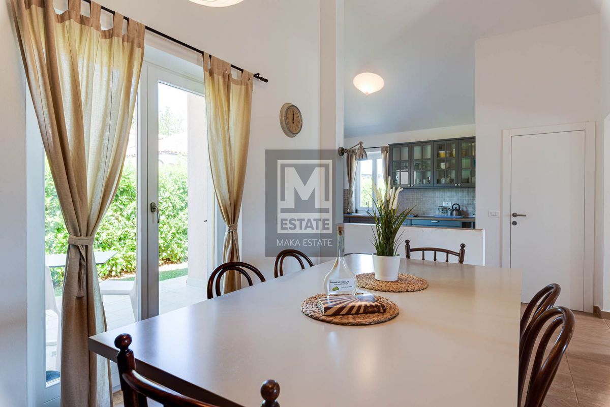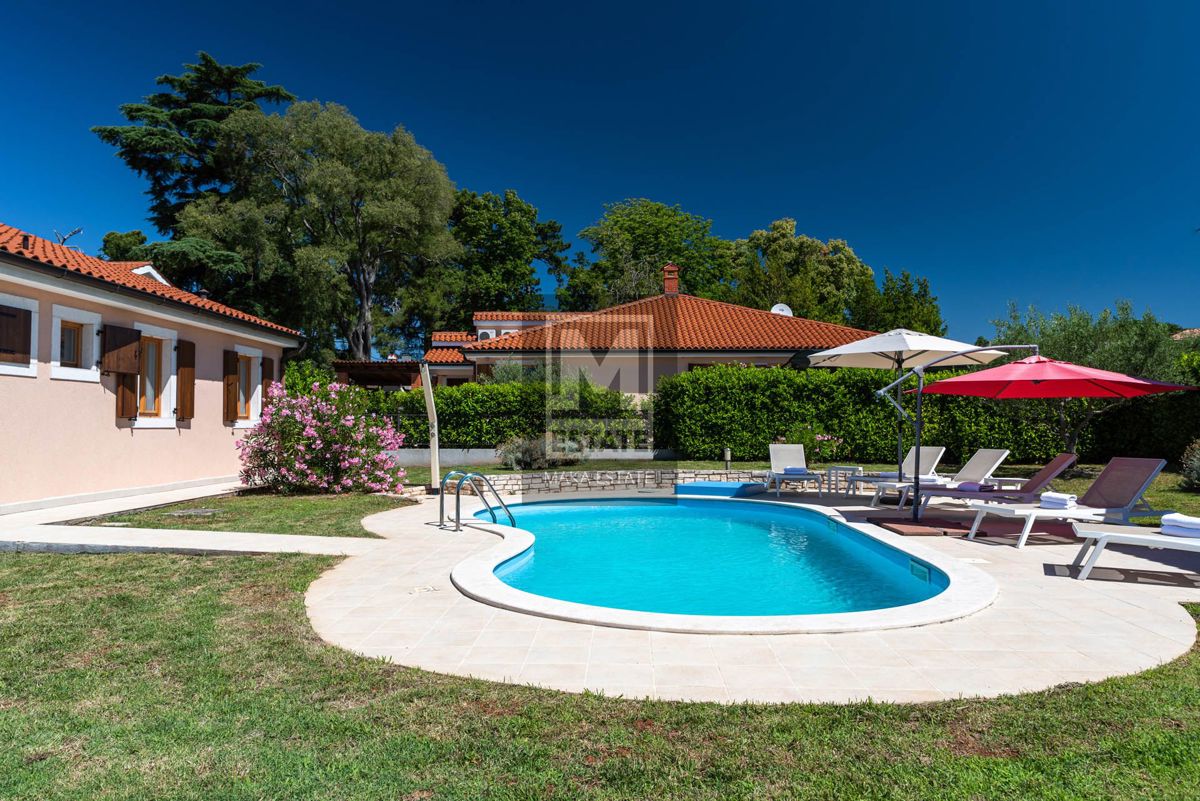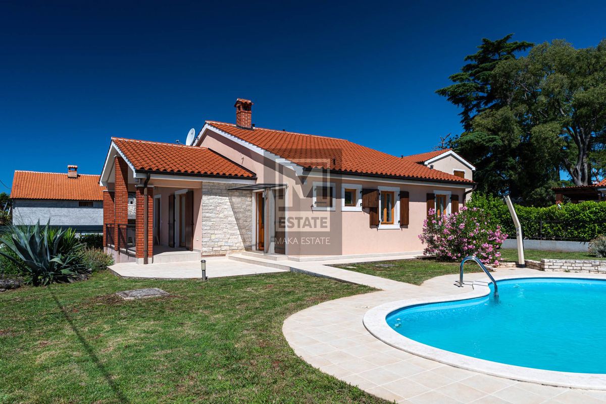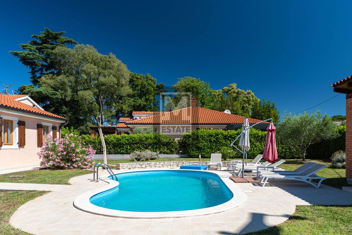 Poreč, okolica, izvrsna opremljena prizemnica sa bazenom Prodaje se prekrasna prizemna kuća s bazenom u okolici Poreča, smještena na mirnoj lokaciji. Ova potpuno opremljena i namještena kuća, stambene površine 144 m2, pruža savršen spoj luksuza i udobnos