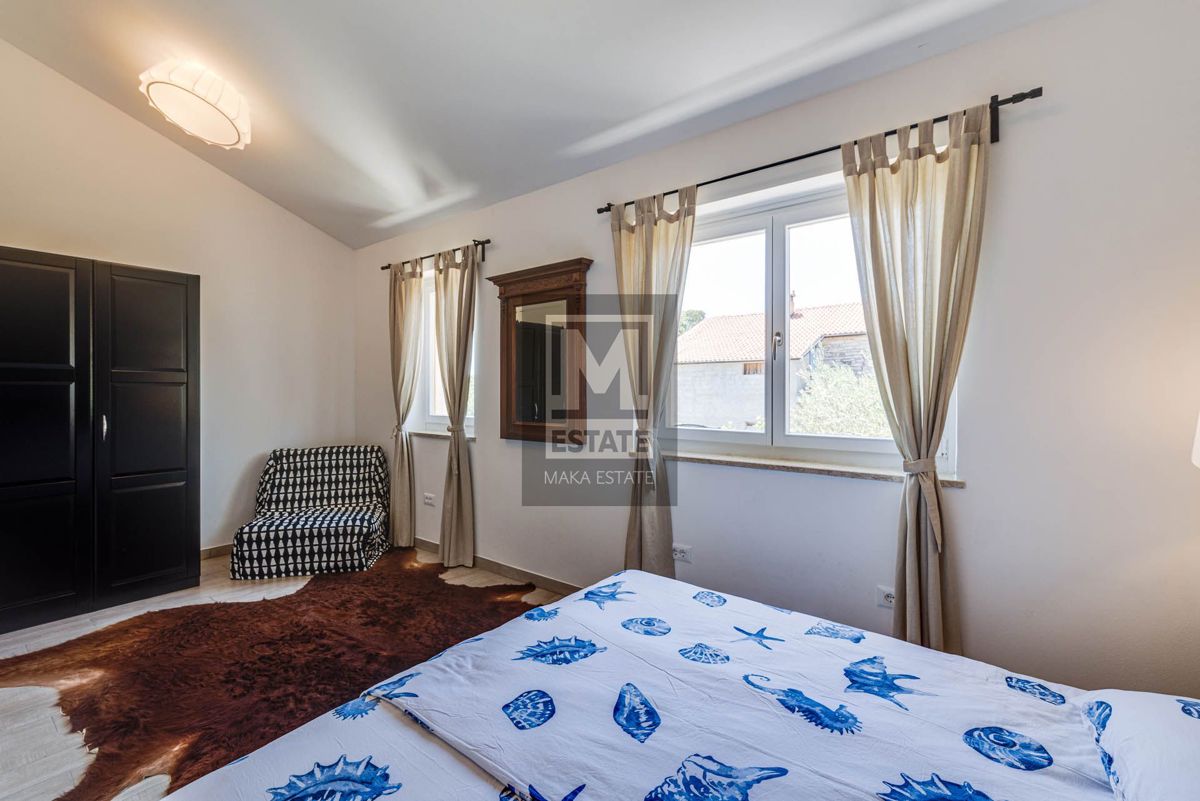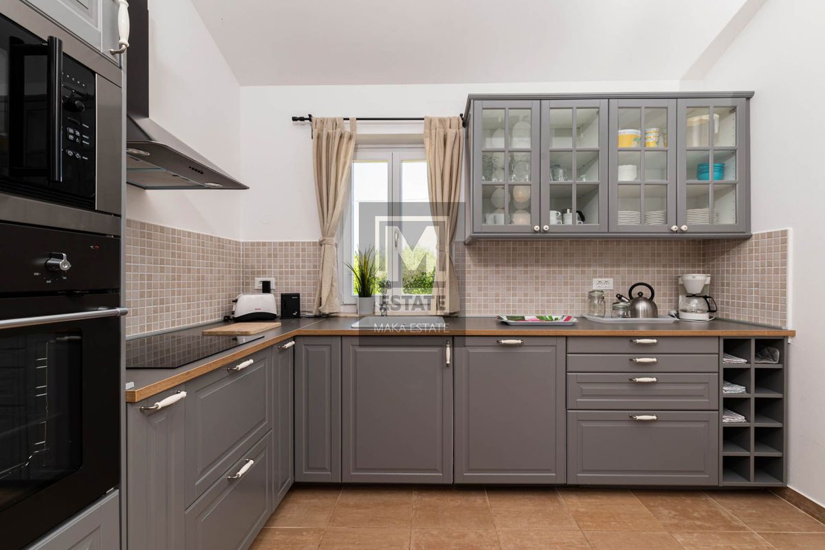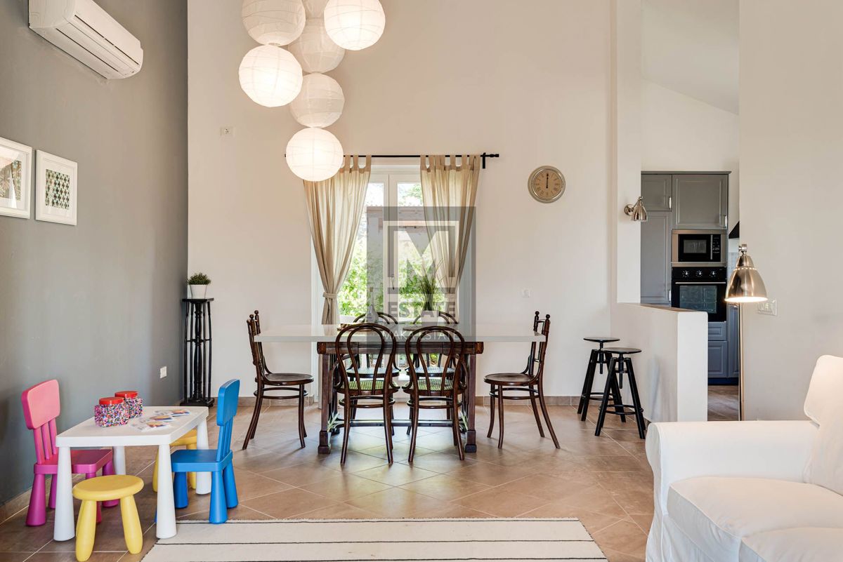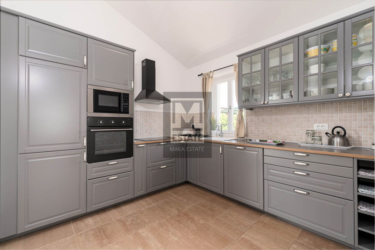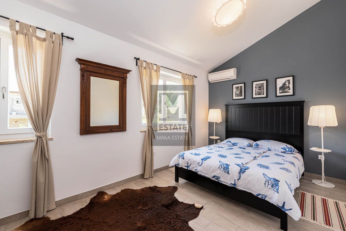 Poreč, okolica, izvrsna opremljena prizemnica sa bazenom Prodaje se prekrasna prizemna kuća s bazenom u okolici Poreča, smještena na mirnoj lokaciji. Ova potpuno opremljena i namještena kuća, stambene površine 144 m2, pruža savršen spoj luksuza i udobnos