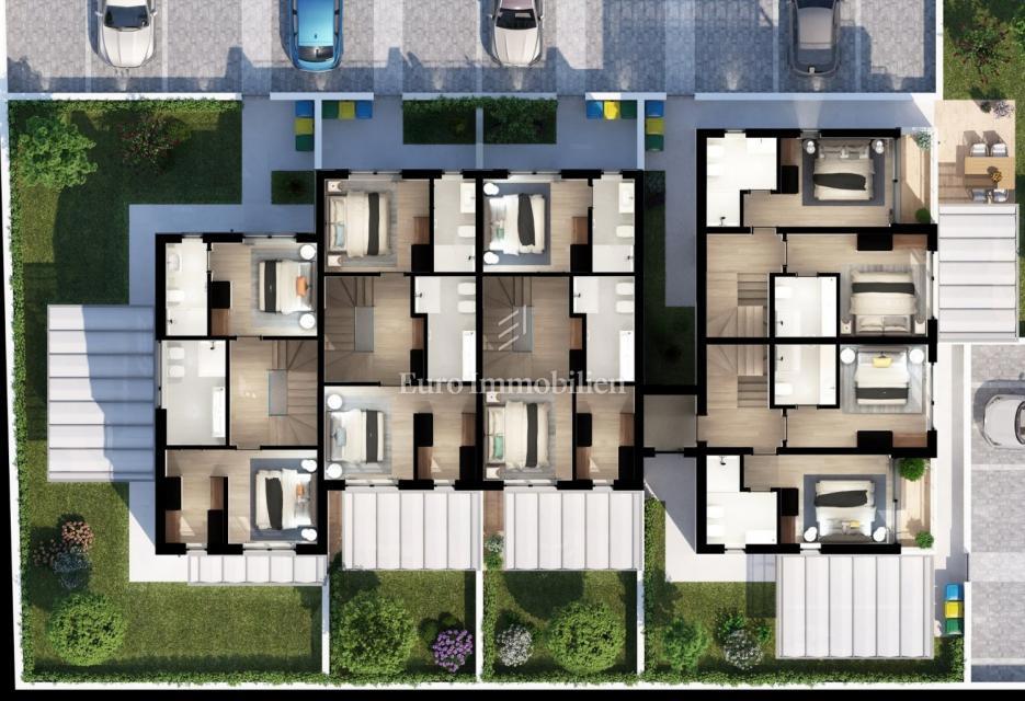 Prodaje se moderna kuća u nizu oko 1000 m udaljena od Poreča i oko 2000 m od mora. Kuća površine 128,31 m2 se proteže na tri etaže. U prizemlju je dnevni boravak s kuhinjom i blagovaonicom, WC, praonica i tehnička soba, te natkrivena terasa. Na katu su dv