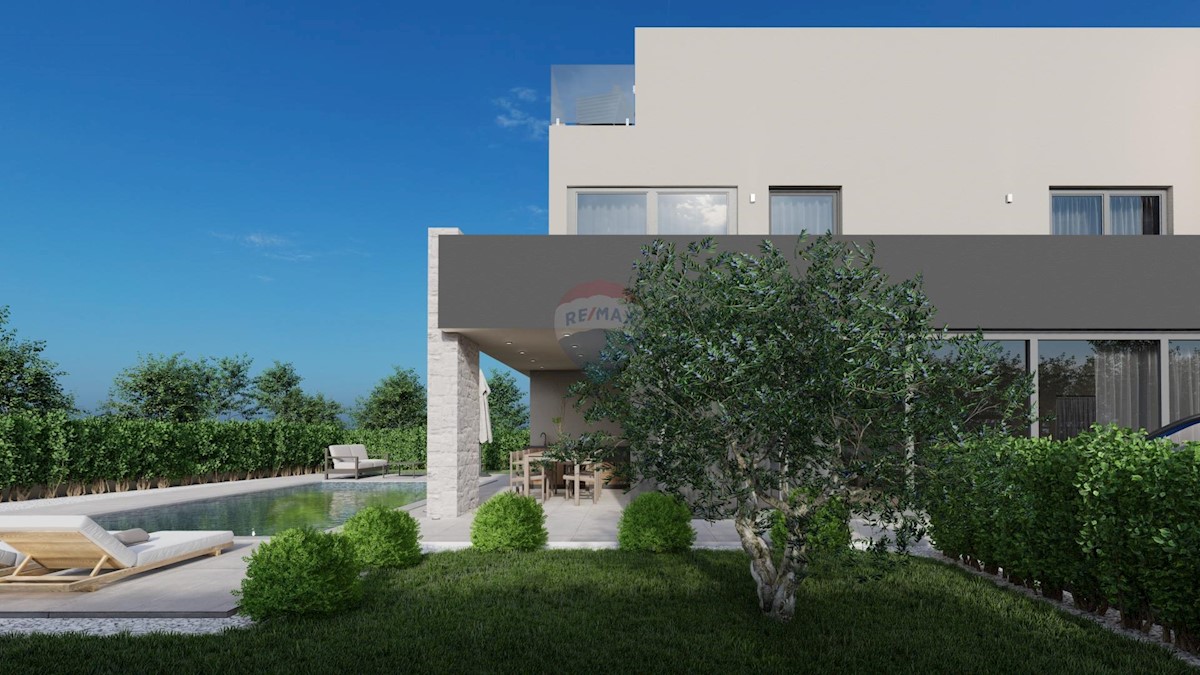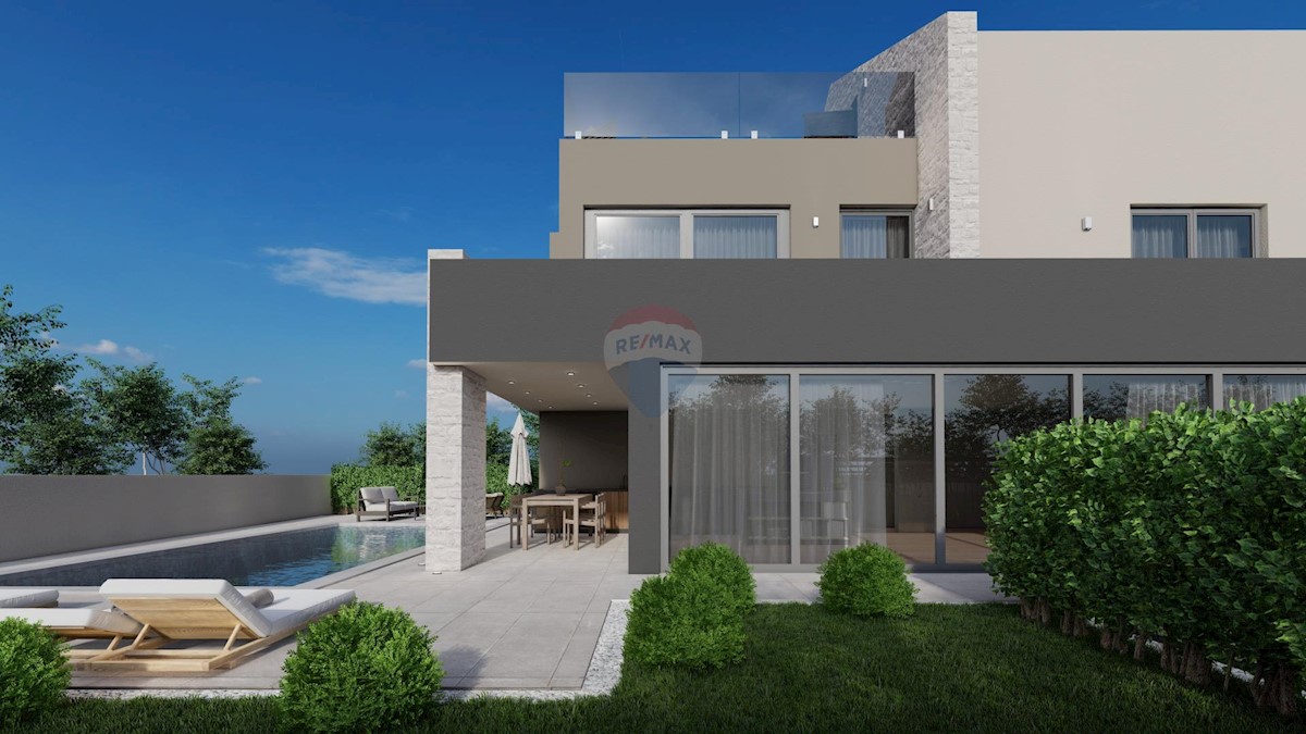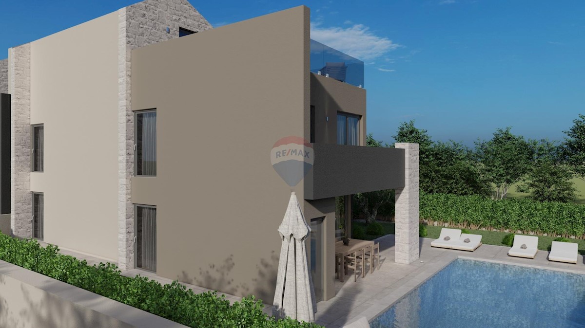 Prodaje se ova predivna moderna vila u novogradnji, smještena na udaljenost od 500 m do mora. Kuća je samostojeća, ukupne bruto površine 273 m2. U prizemlju je smješten prostrani dnevni boravak s open space kuhinjom i blagovaonom, kupatilo, vešeraj i tri