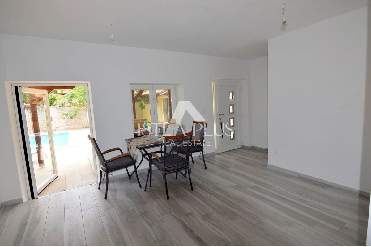 K219 Dvije renovirane kamene kuće sa bazenom u okolici Tinjana. Prva kuća površine 51 m2 sadrži kuhinju s blagovaonicom i dnevnim boravkom, kupaonicu i prostranu terasu. Prvi kat kuće sastoji se od ulaznog hodnika i dvije spavaće sobe. Druga kuća od 29