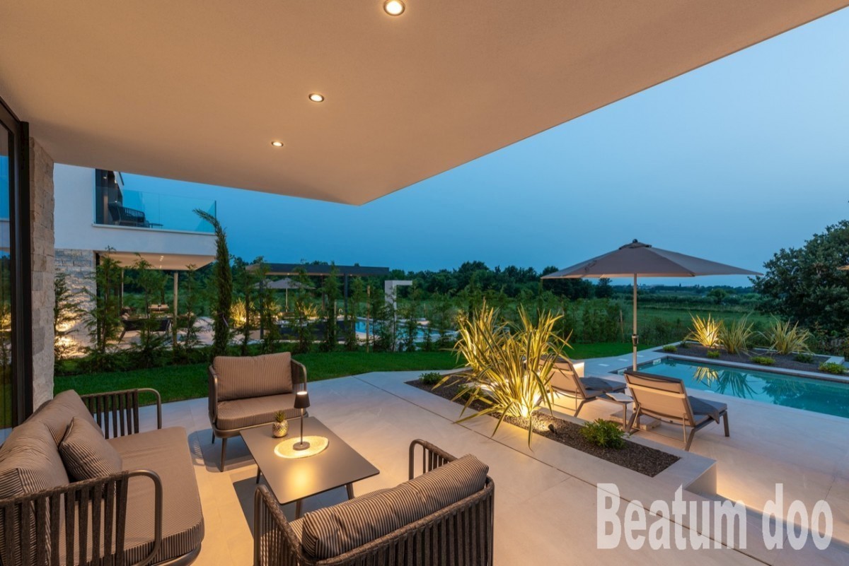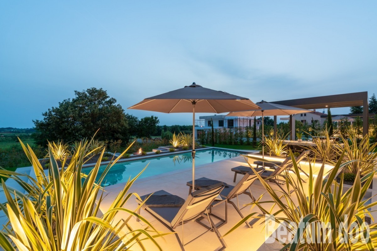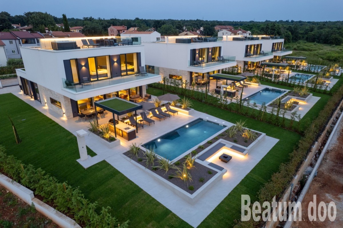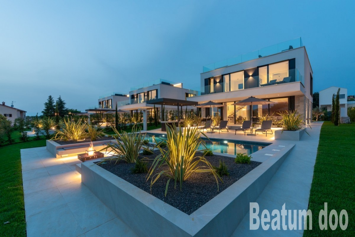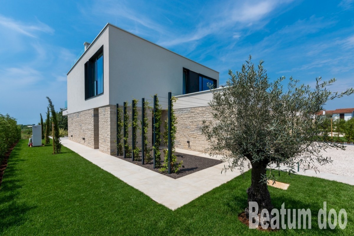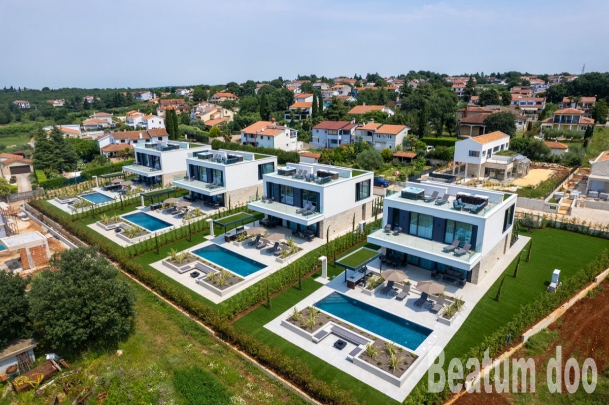 Villa Parenzo One Projekt info Mjesto Kukci kod Poreča, posljednja ulica naselja, parcela s pogledom na more. Vila se nalazi na svojoj parceli u sklopu kompleksa vila ukupne površine 3730 m2. Sastoji se od 4 samostojeća potpuno namještena i opremljena ob