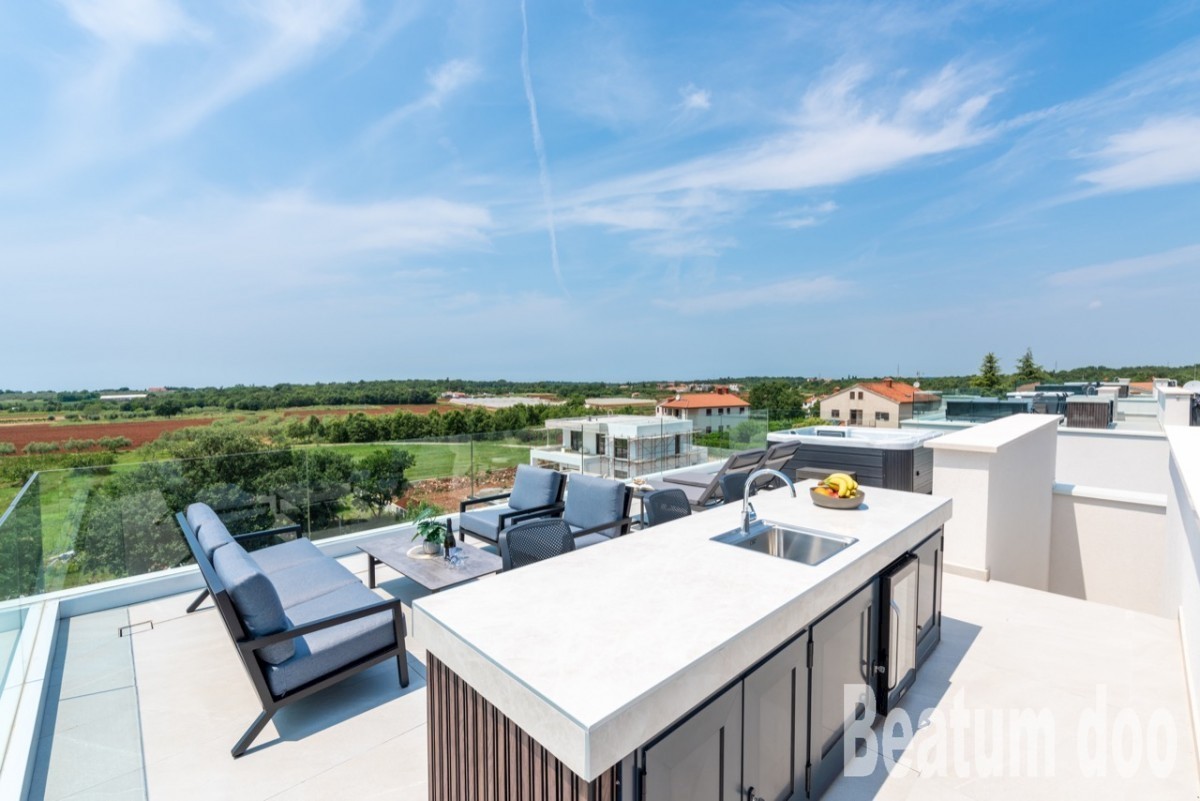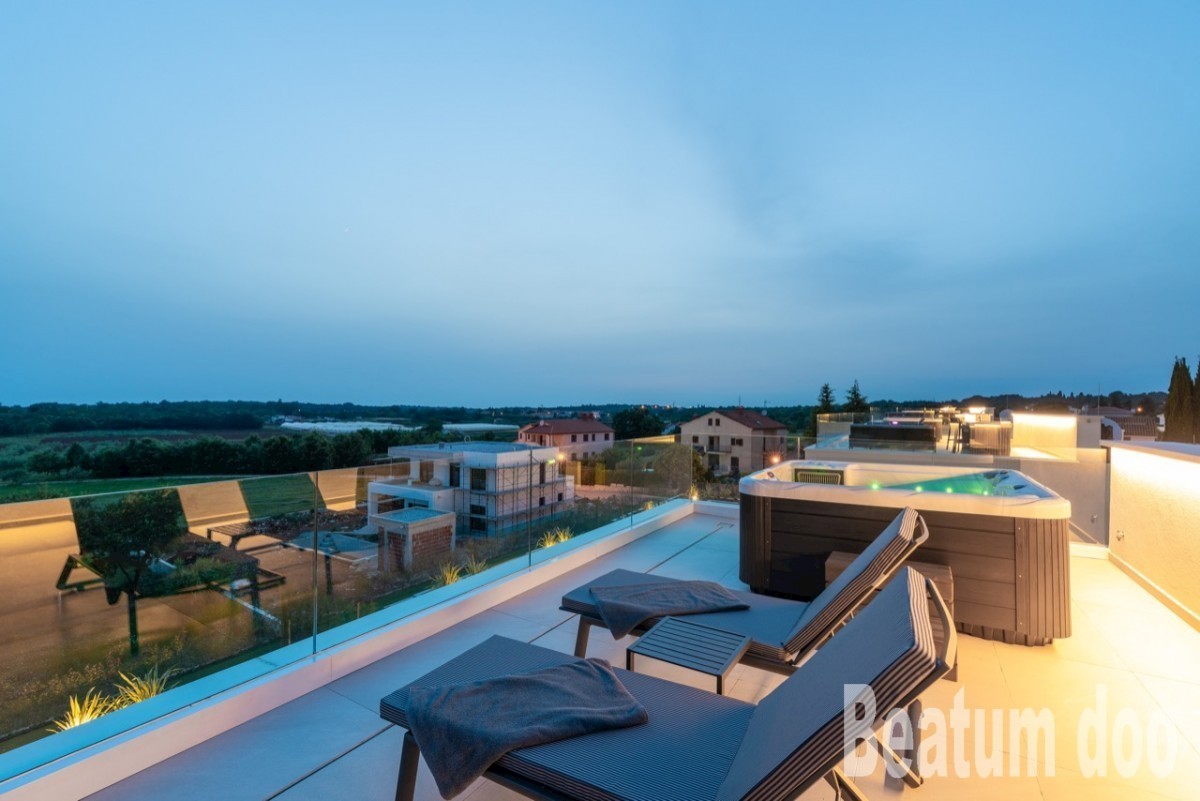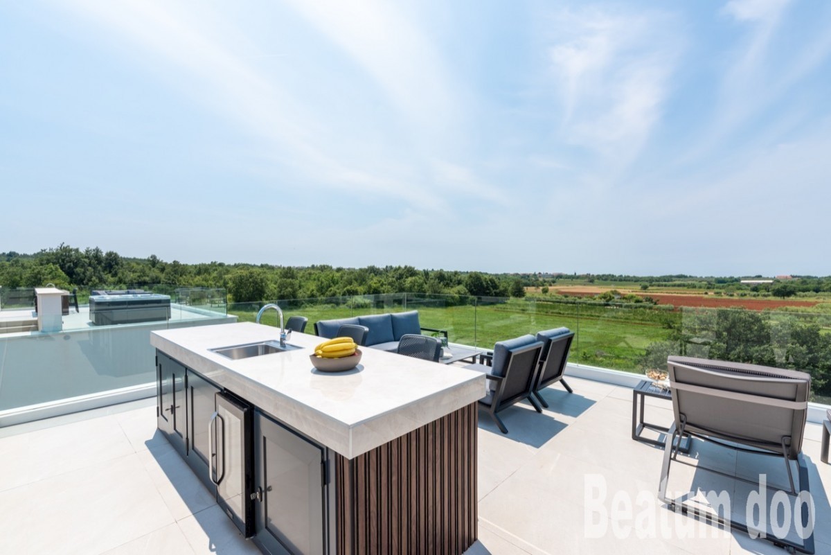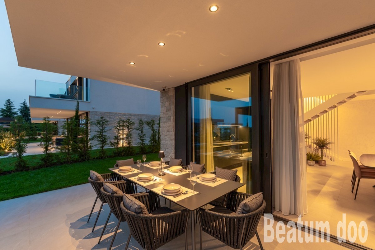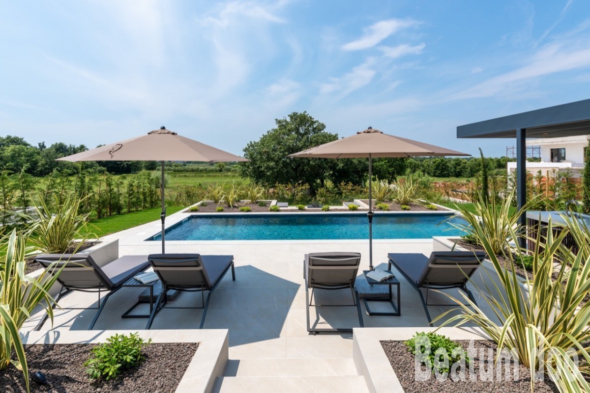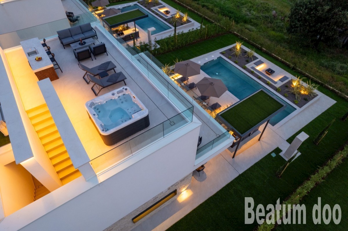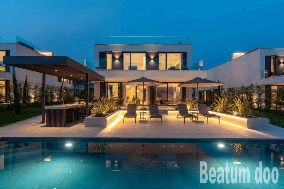 Villa Parenzo One Projekt info Mjesto Kukci kod Poreča, posljednja ulica naselja, parcela s pogledom na more. Vila se nalazi na svojoj parceli u sklopu kompleksa vila ukupne površine 3730 m2. Sastoji se od 4 samostojeća potpuno namještena i opremljena ob