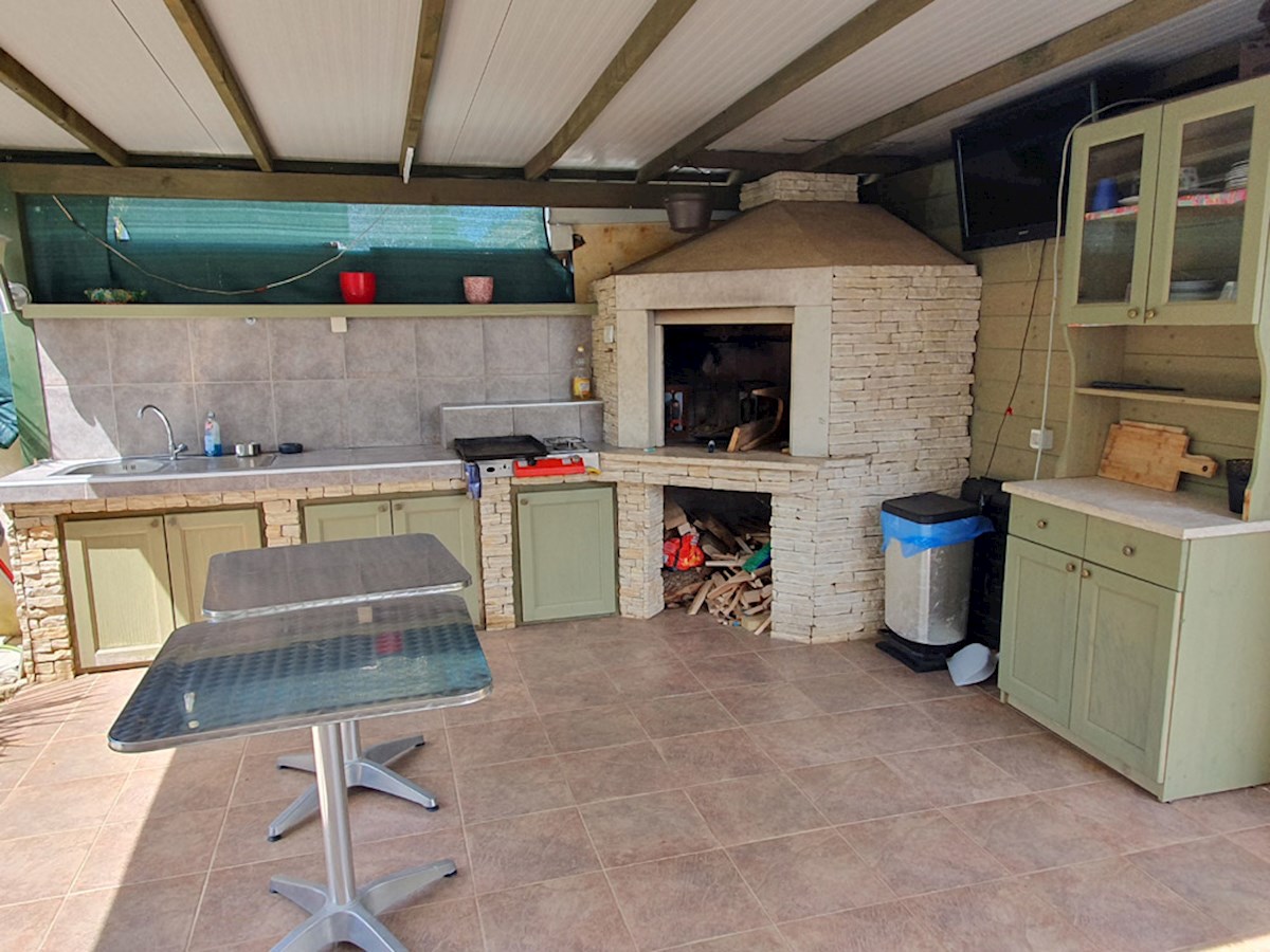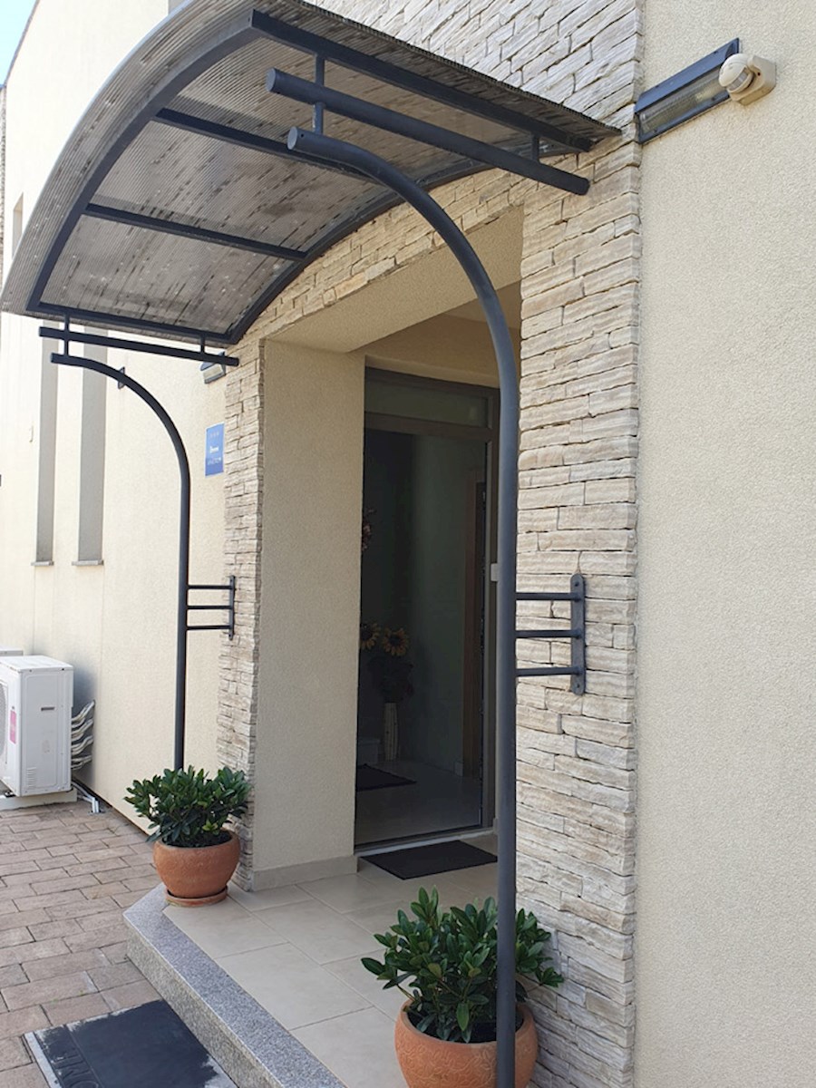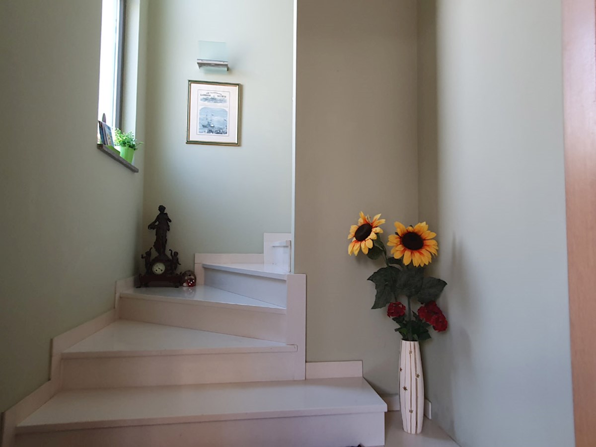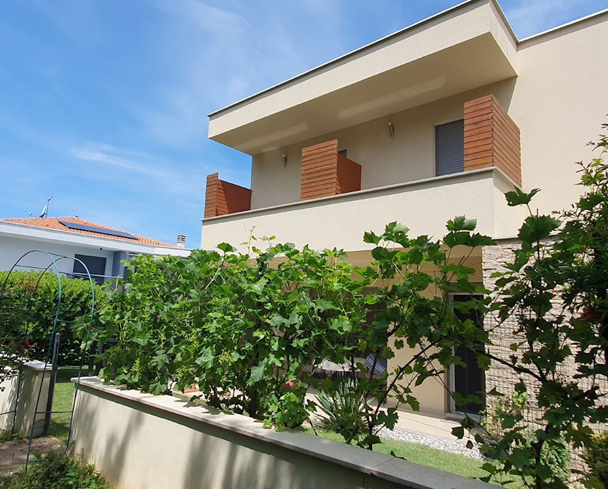 Poreč, širi centar , oko 500 m od mora , novija dvojna kuća na dvije etaže ukupne bruto površine 158 m2 ( Prizemlje: spremište – vešeraj, ulaz, hodnik i stubište, spavaća soba, kupatilo , trpezarija , kuhinja sa izladom na terasu, dnevni boravak sa kami