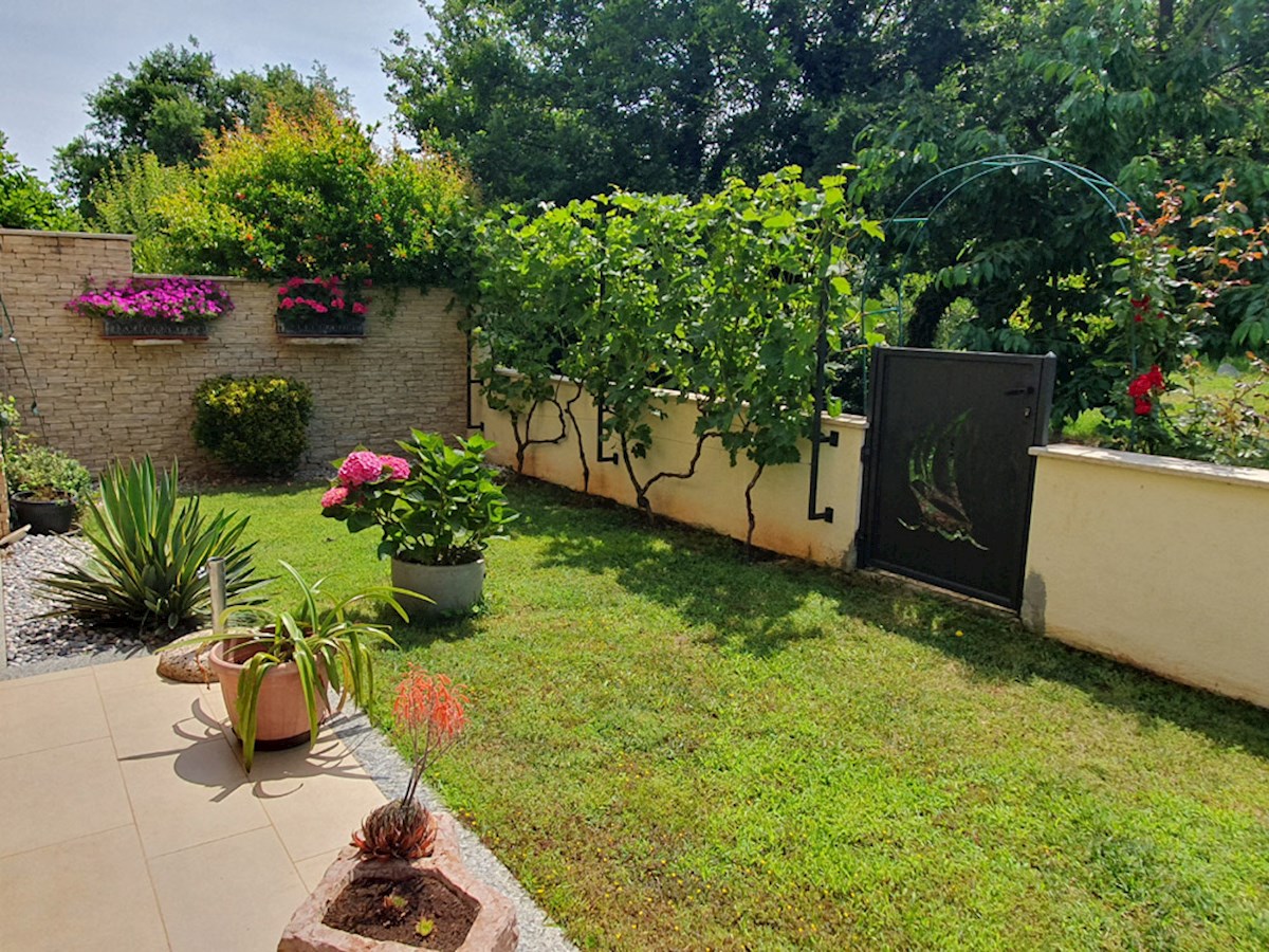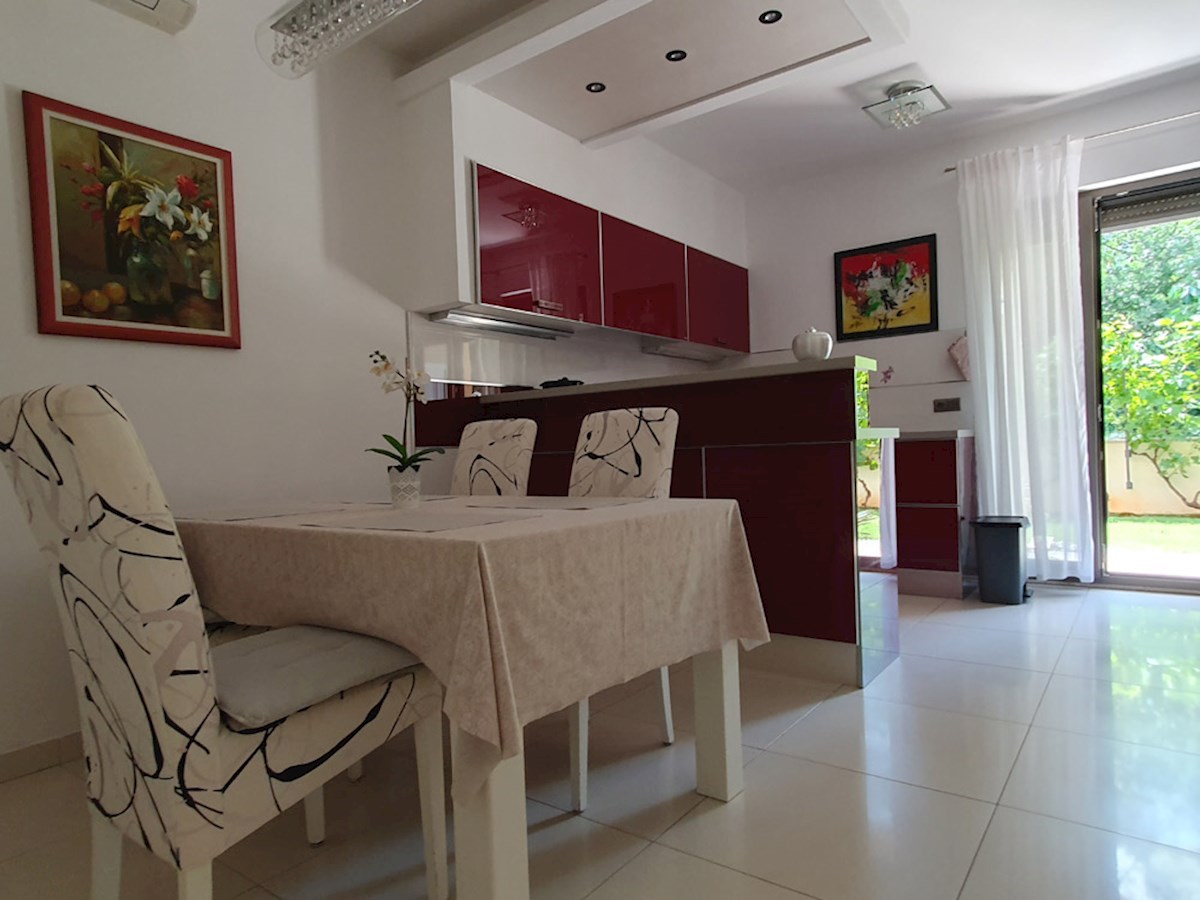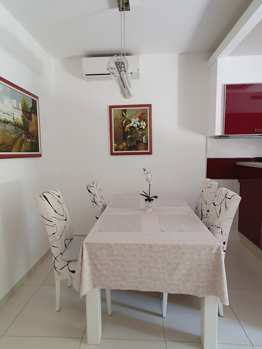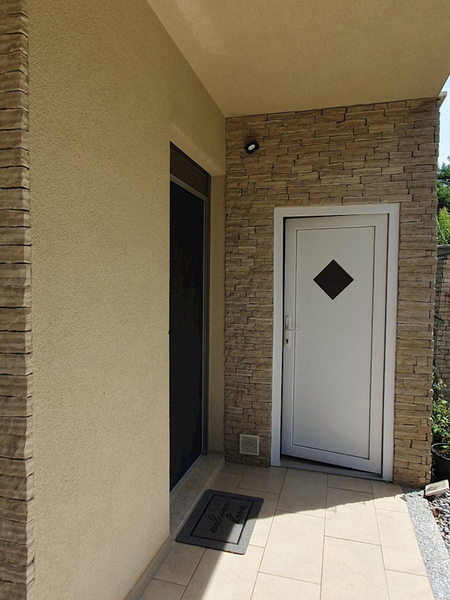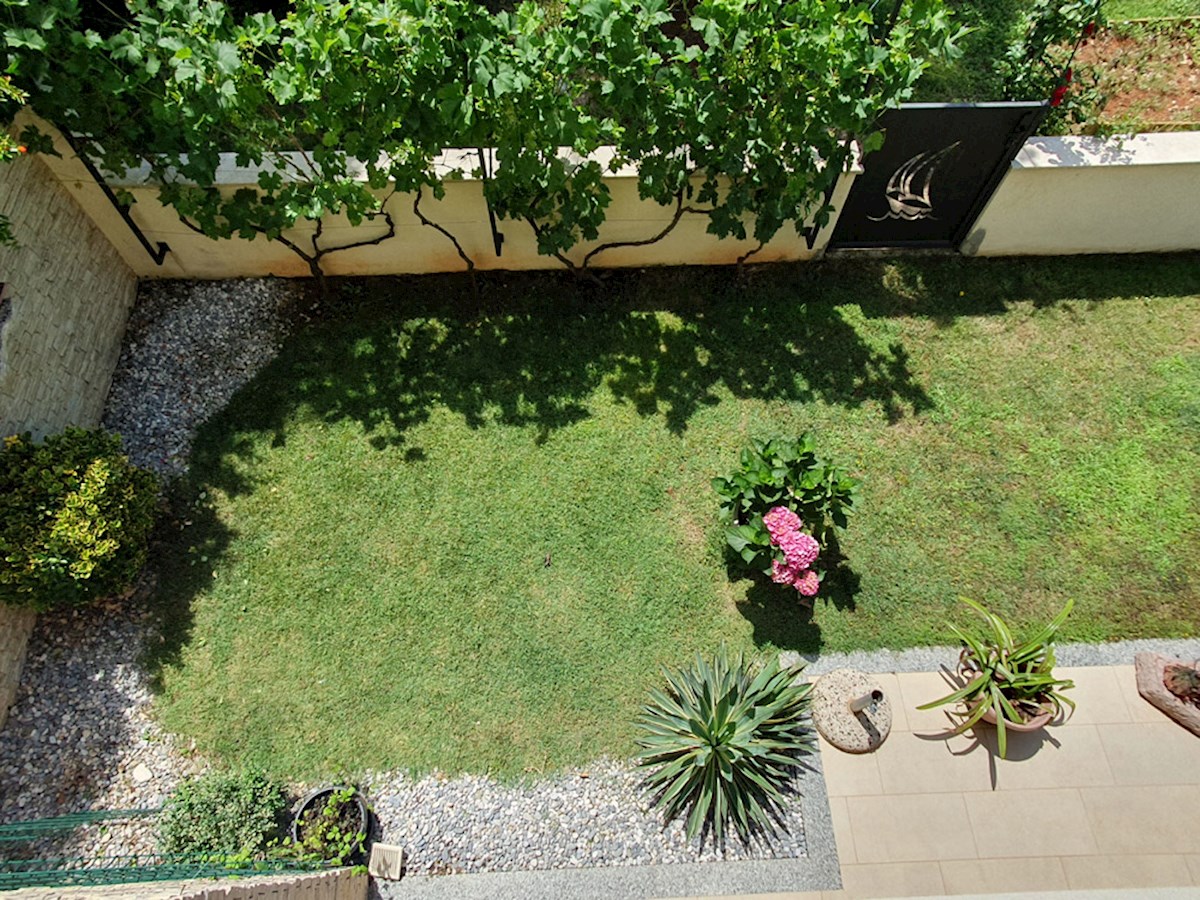 Poreč, širi centar , oko 500 m od mora , novija dvojna kuća na dvije etaže ukupne bruto površine 158 m2 ( Prizemlje: spremište – vešeraj, ulaz, hodnik i stubište, spavaća soba, kupatilo , trpezarija , kuhinja sa izladom na terasu, dnevni boravak sa kami