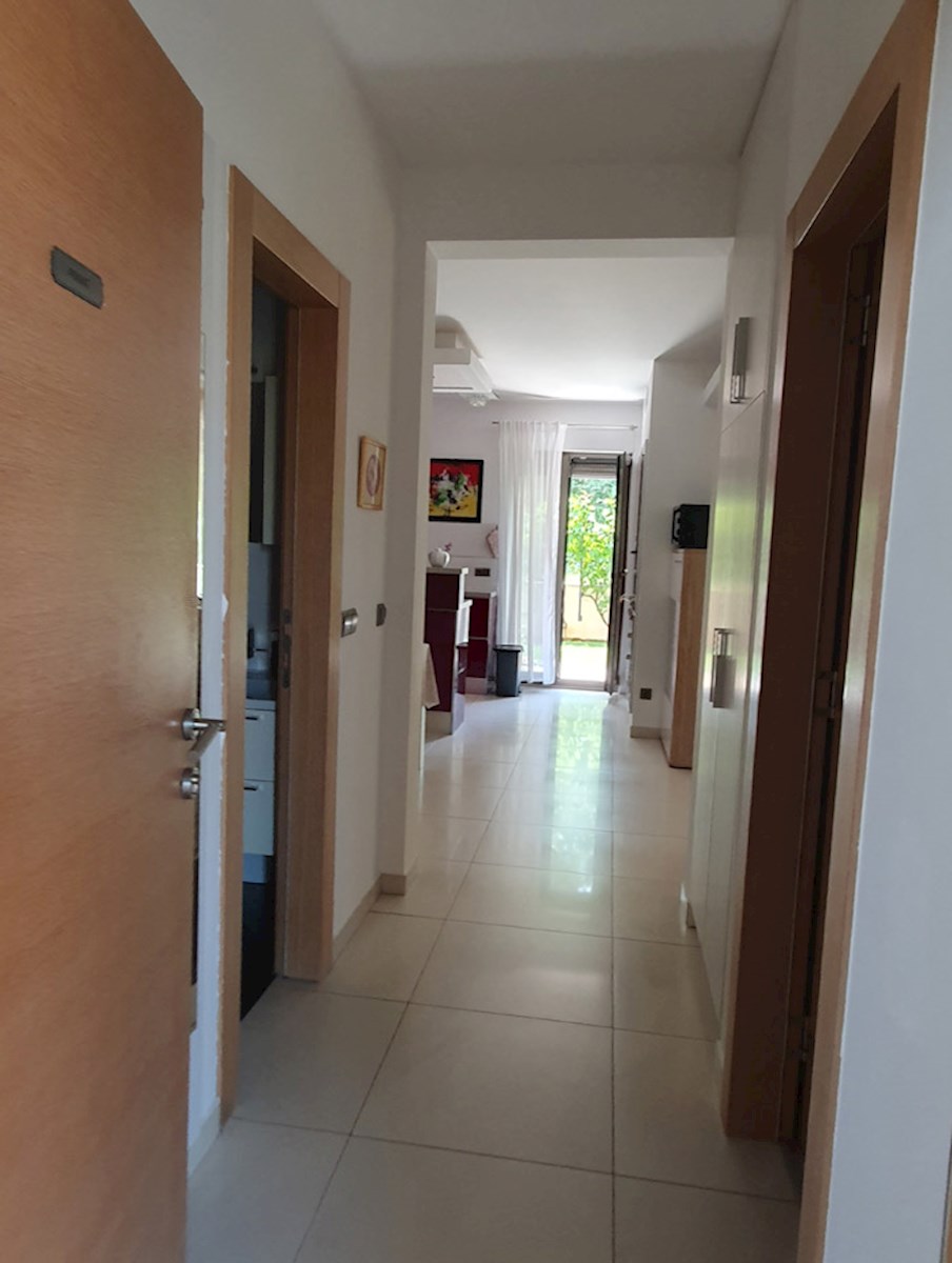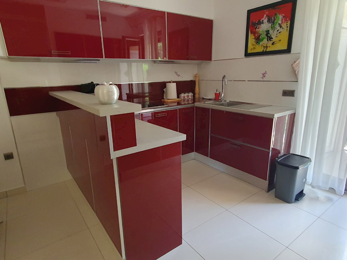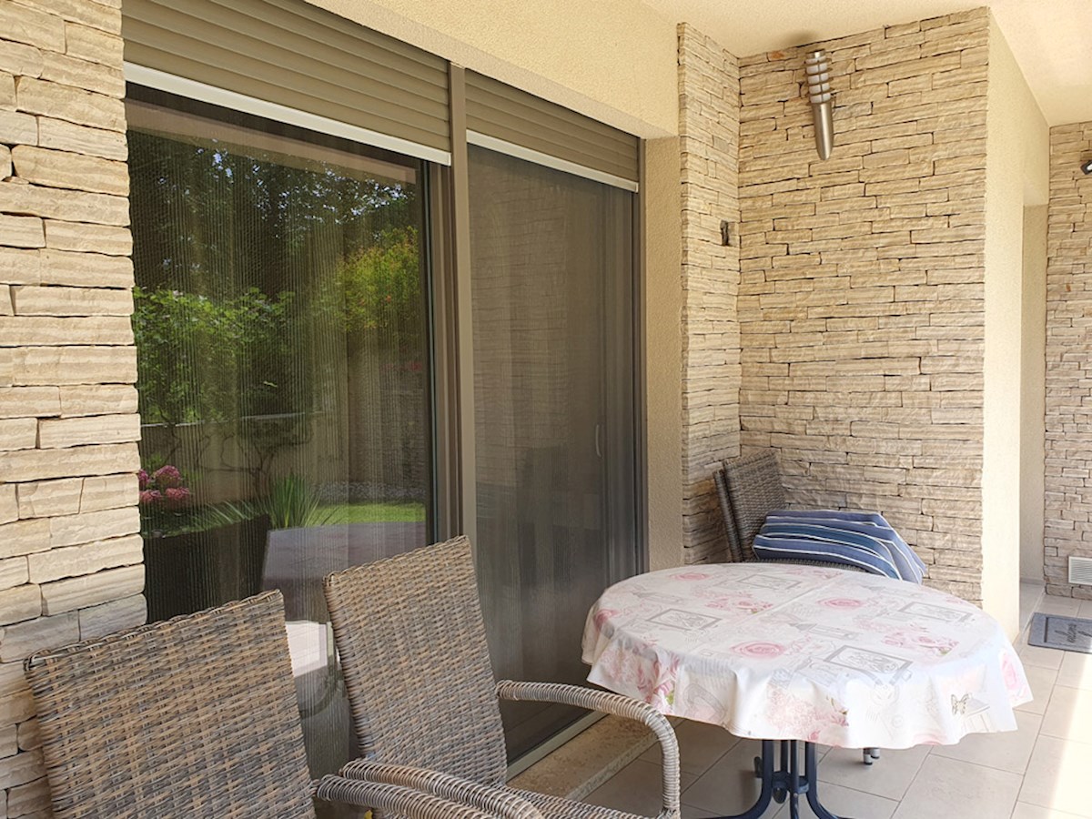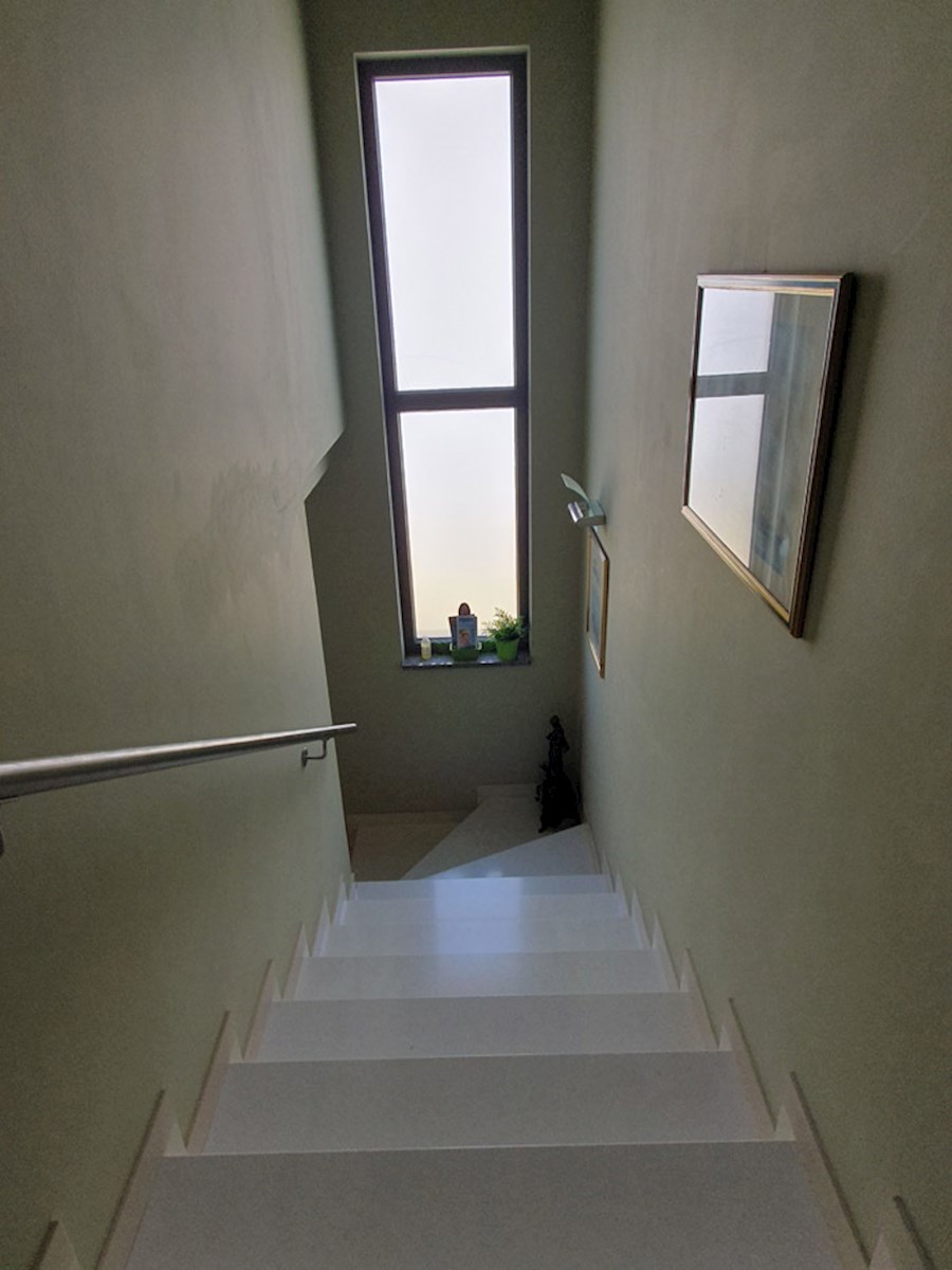 Poreč, širi centar , oko 500 m od mora , novija dvojna kuća na dvije etaže ukupne bruto površine 158 m2 ( Prizemlje: spremište – vešeraj, ulaz, hodnik i stubište, spavaća soba, kupatilo , trpezarija , kuhinja sa izladom na terasu, dnevni boravak sa kami