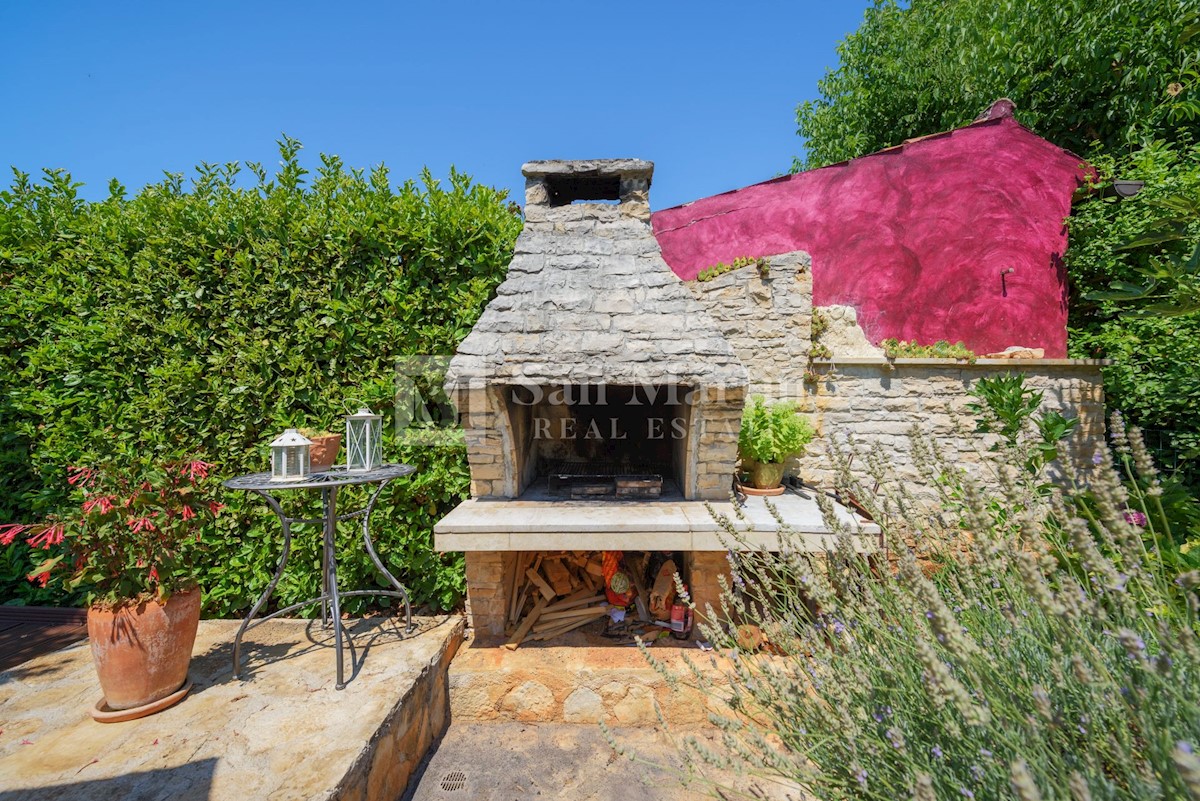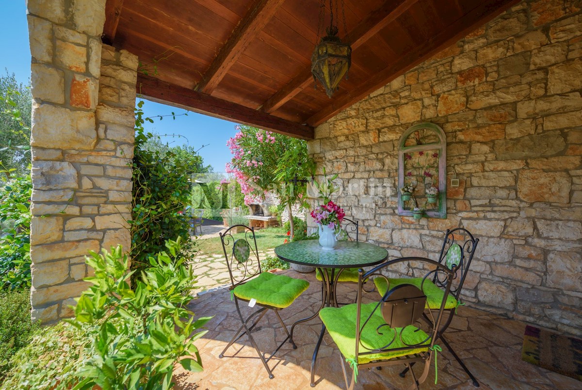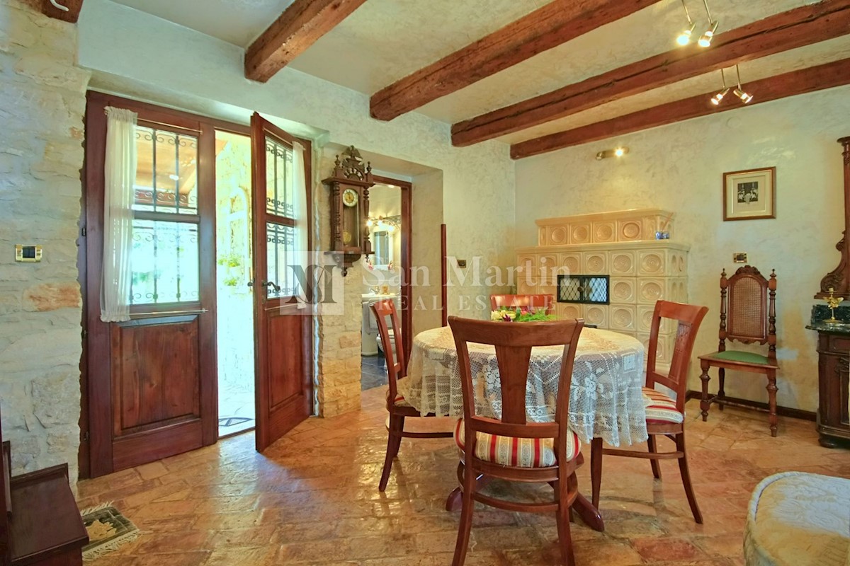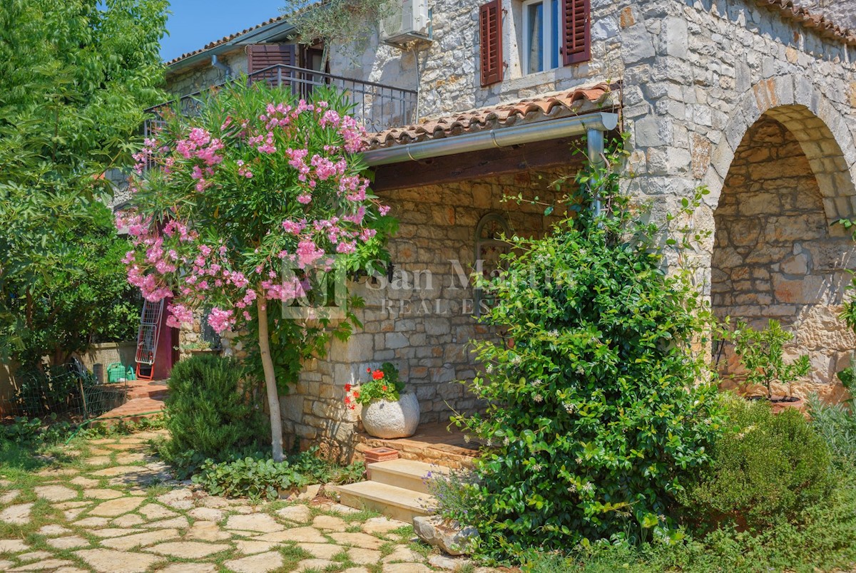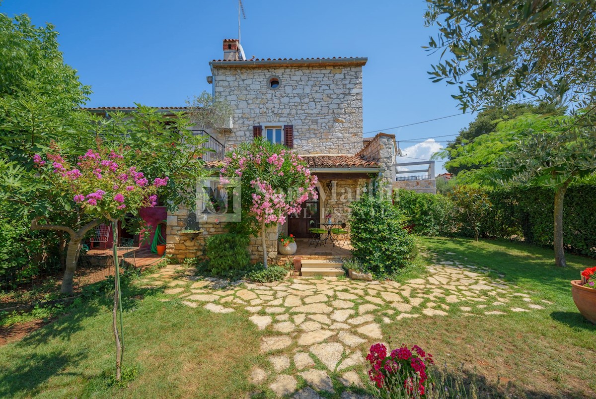Poreč, okolica - kamena kuća okružena zelenilom U mirnom mjestu, nedaleko od mora i grada na lijepo uređenoj okućnici od 516 m2 smjestila se kamena ljepotica ukupne površine 150 m2. Kuća se prostire na tri etaže. U prizemlju su se smjestili dnevni borava