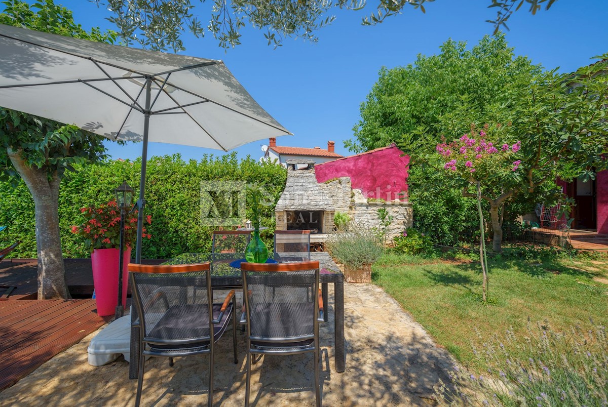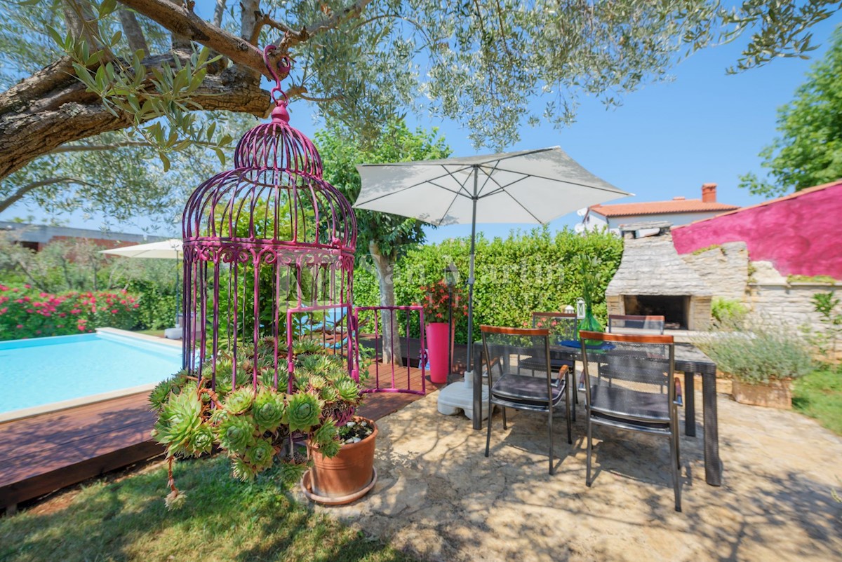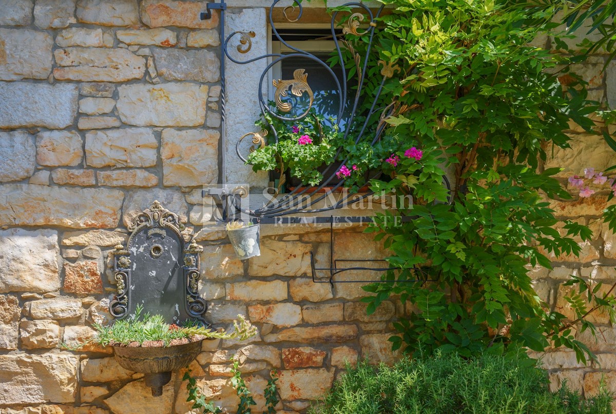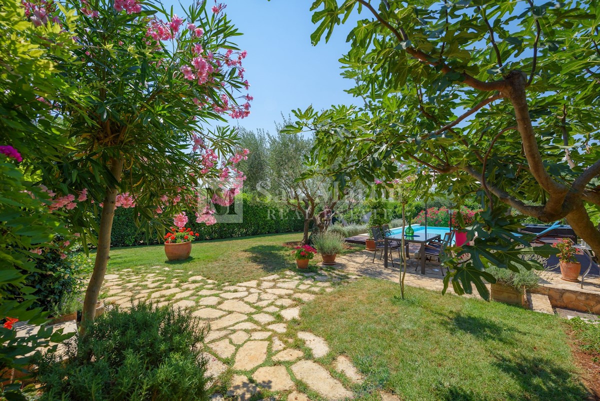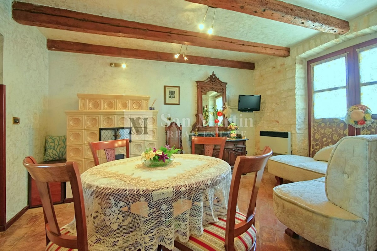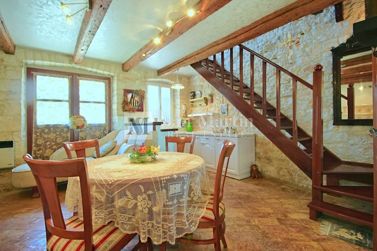 Poreč, okolica - kamena kuća okružena zelenilom U mirnom mjestu, nedaleko od mora i grada na lijepo uređenoj okućnici od 516 m2 smjestila se kamena ljepotica ukupne površine 150 m2. Kuća se prostire na tri etaže. U prizemlju su se smjestili dnevni borava