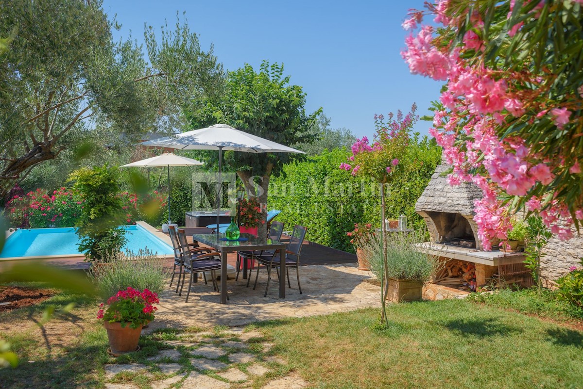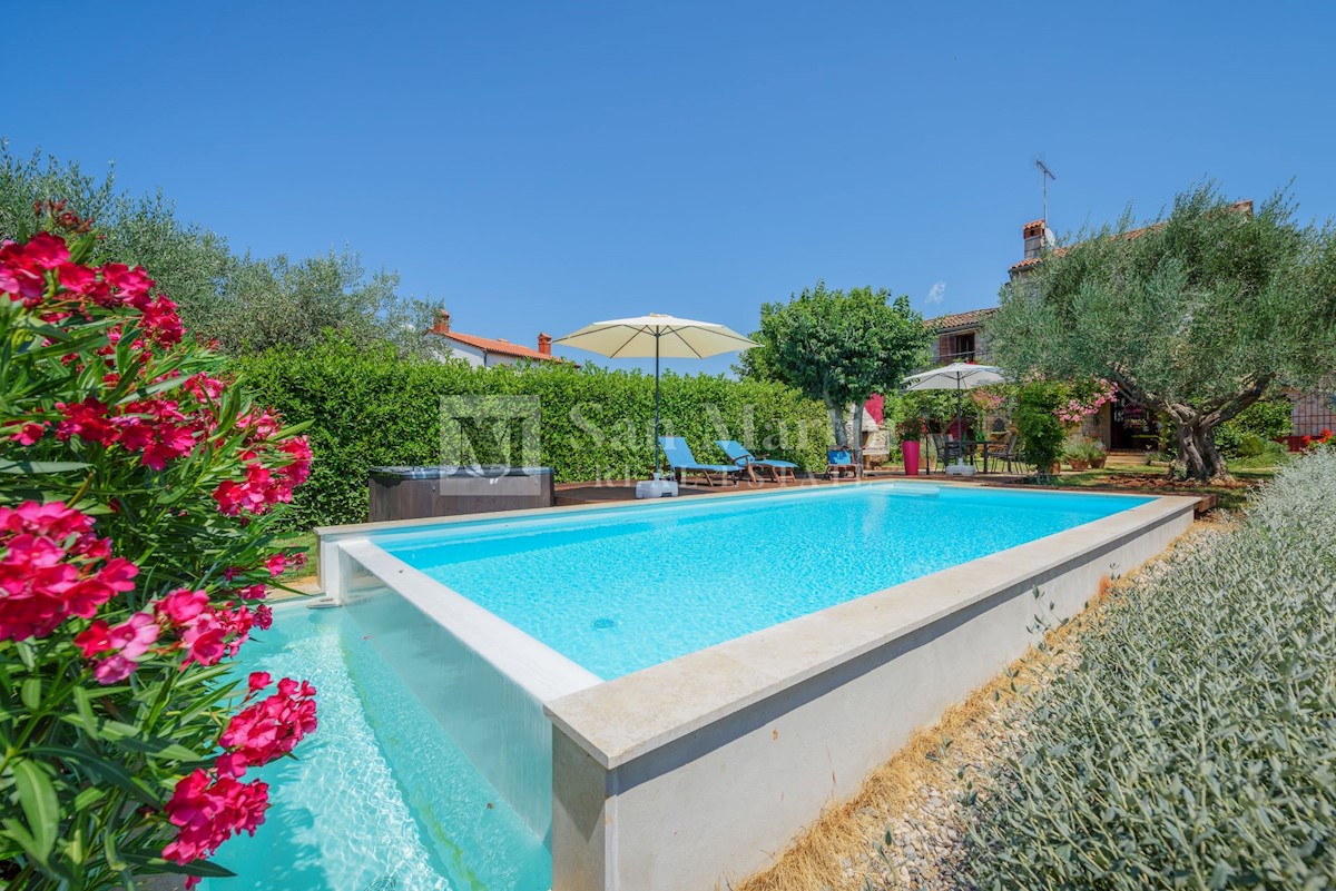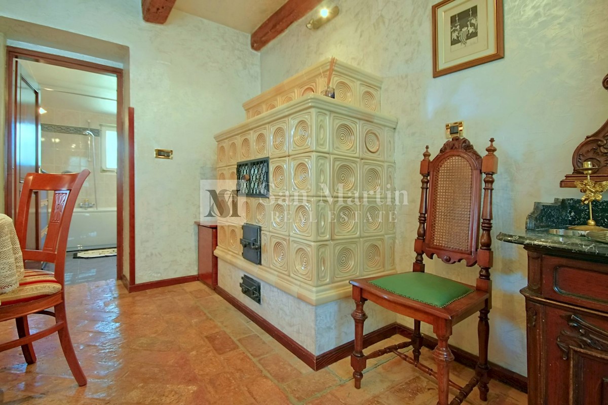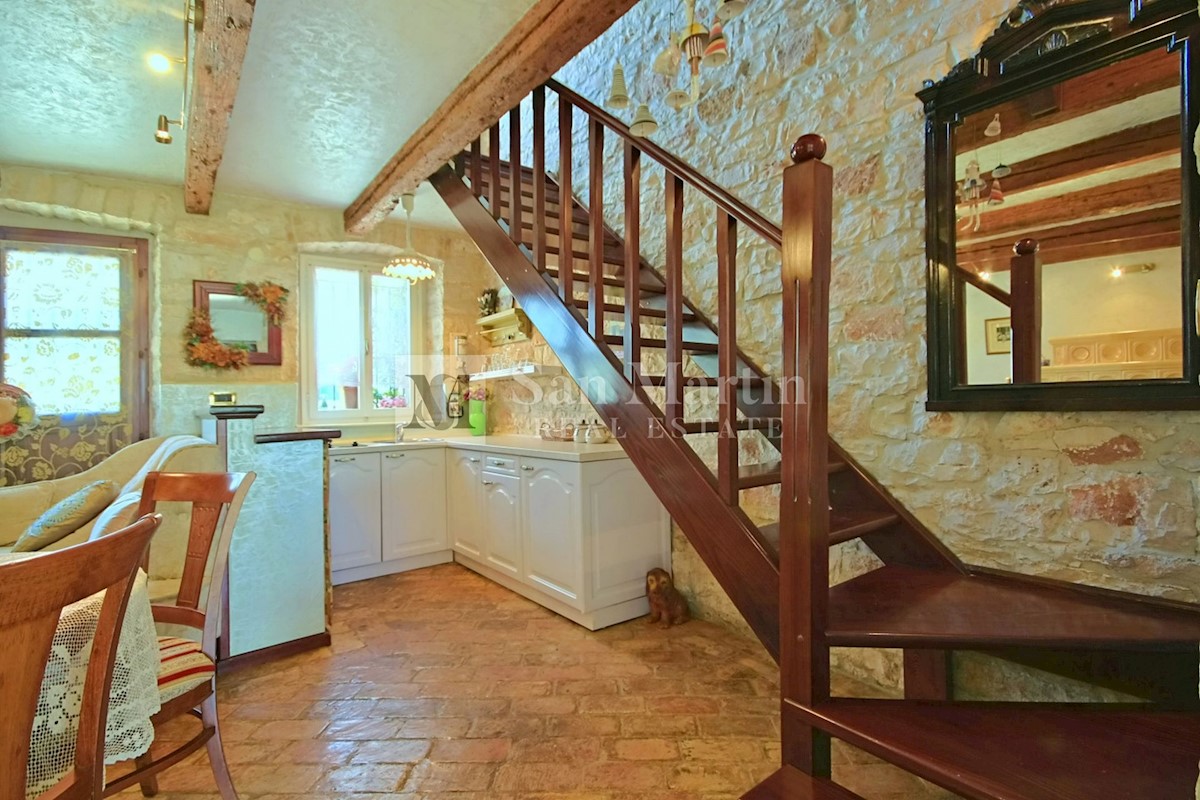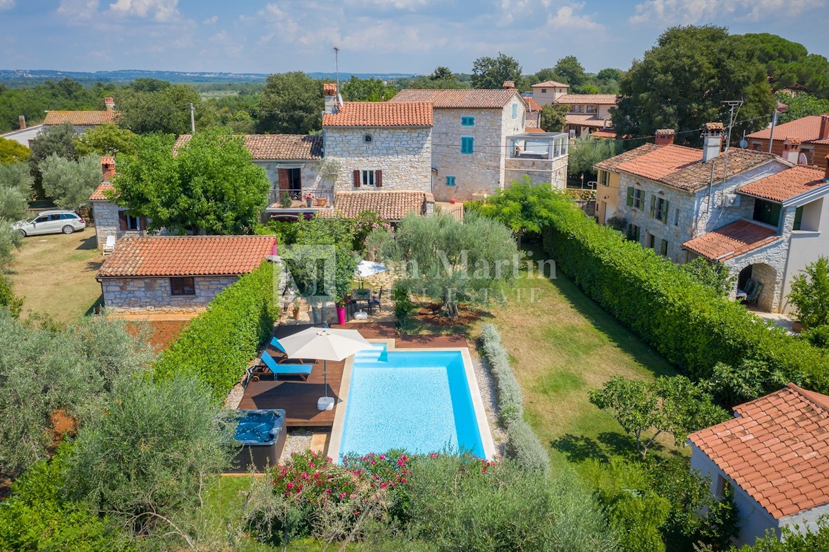 Poreč, okolica - kamena kuća okružena zelenilom U mirnom mjestu, nedaleko od mora i grada na lijepo uređenoj okućnici od 516 m2 smjestila se kamena ljepotica ukupne površine 150 m2. Kuća se prostire na tri etaže. U prizemlju su se smjestili dnevni borava