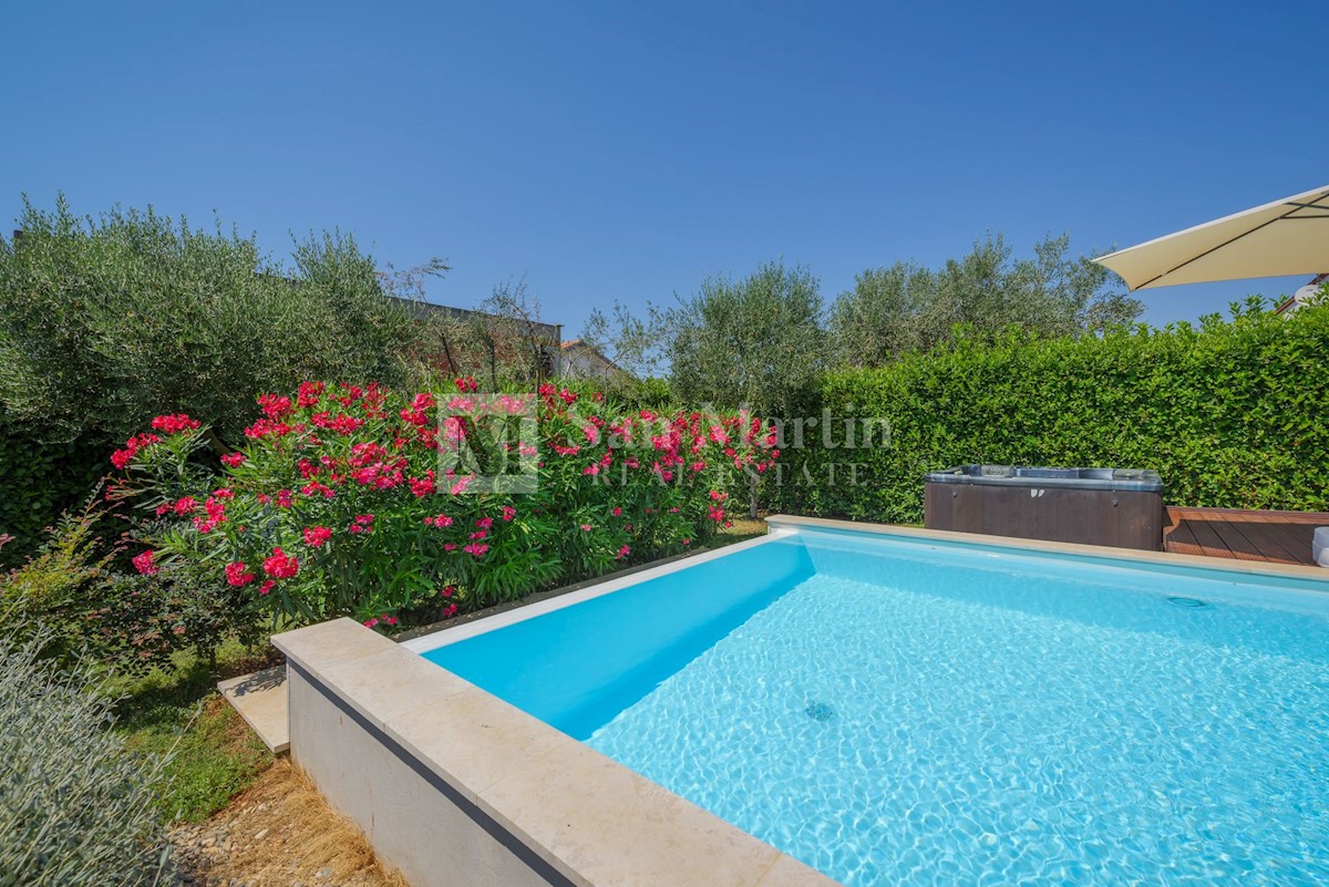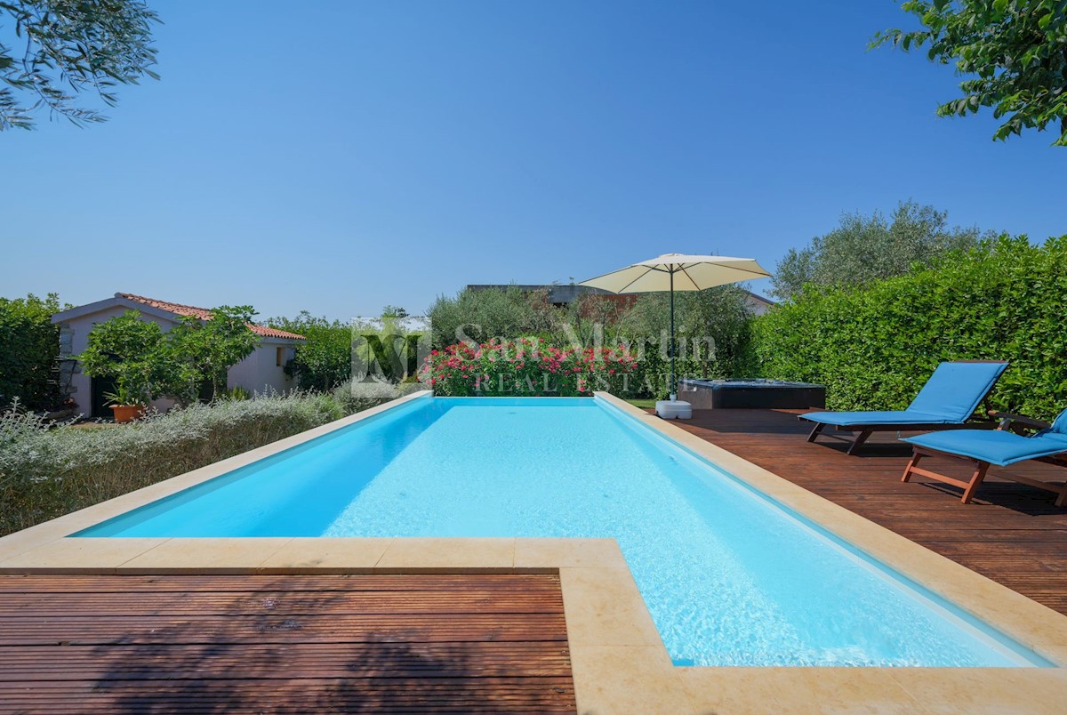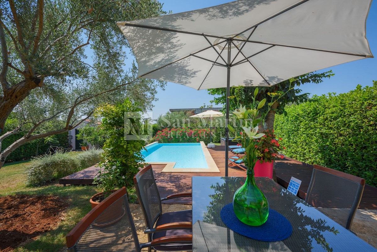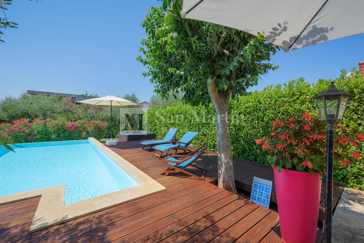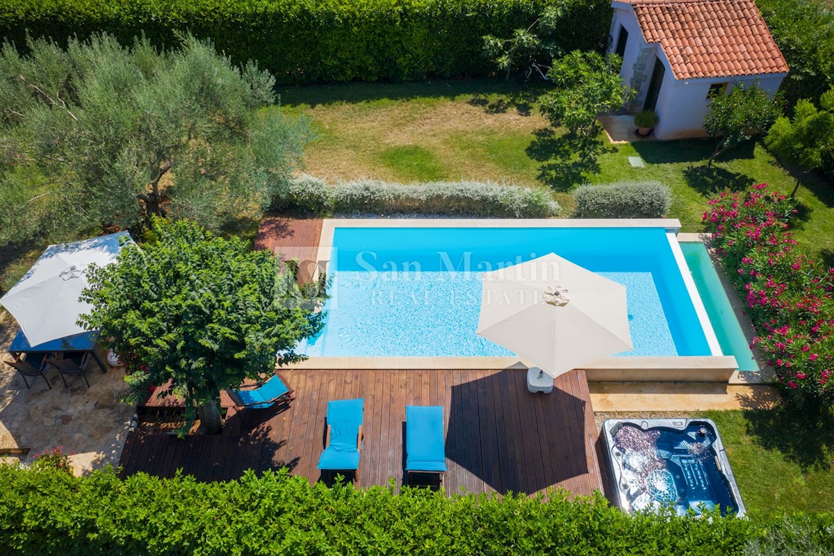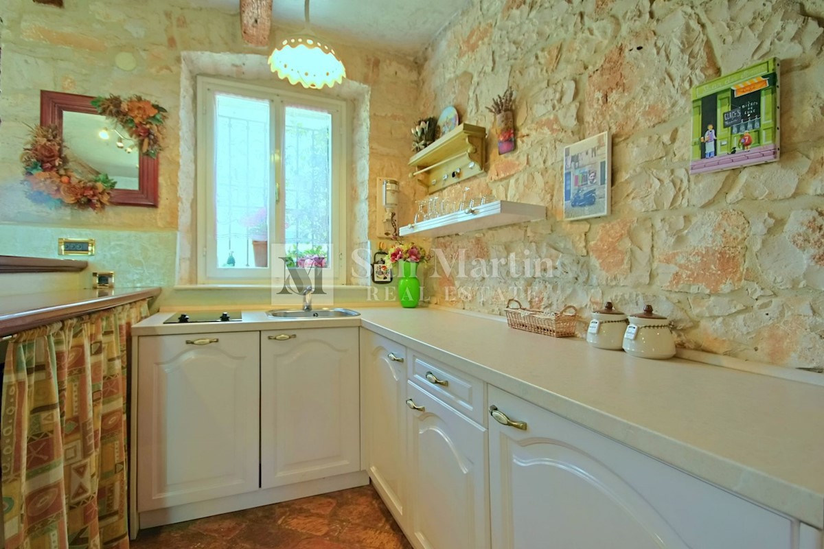 Poreč, okolica - kamena kuća okružena zelenilom U mirnom mjestu, nedaleko od mora i grada na lijepo uređenoj okućnici od 516 m2 smjestila se kamena ljepotica ukupne površine 150 m2. Kuća se prostire na tri etaže. U prizemlju su se smjestili dnevni borava