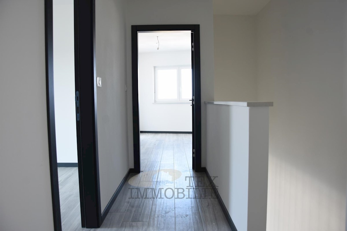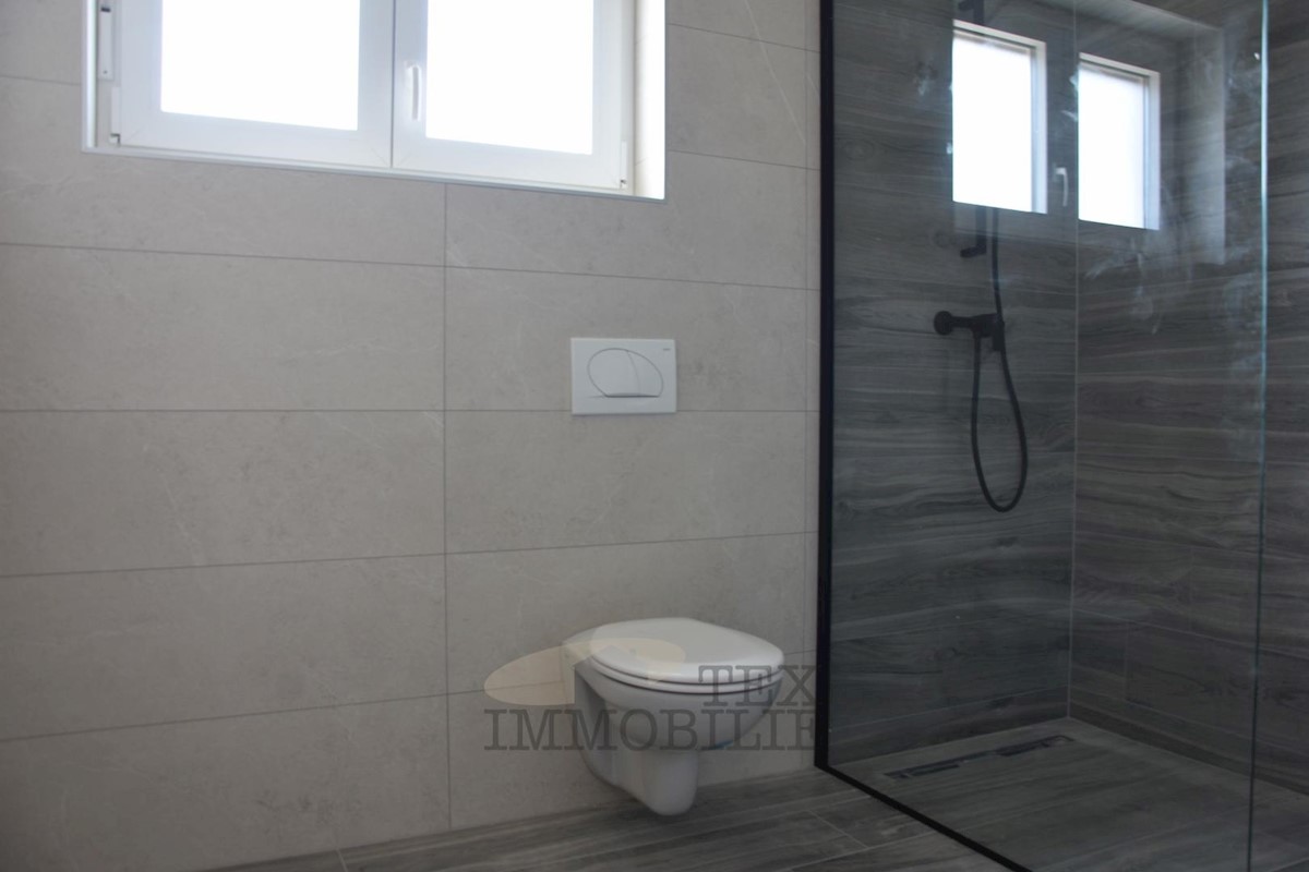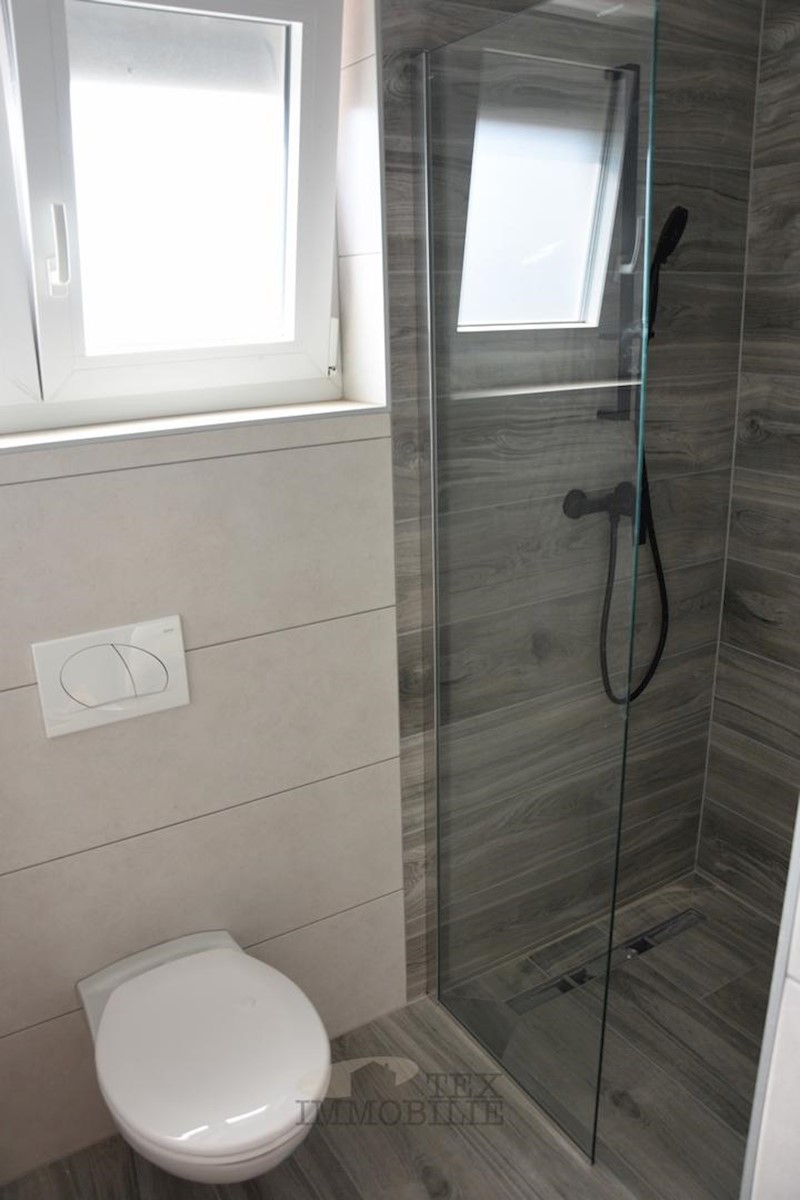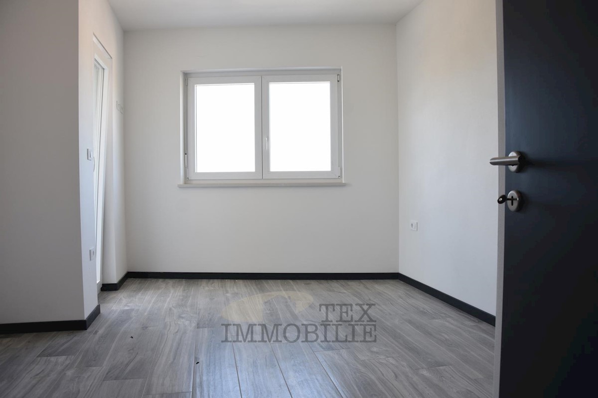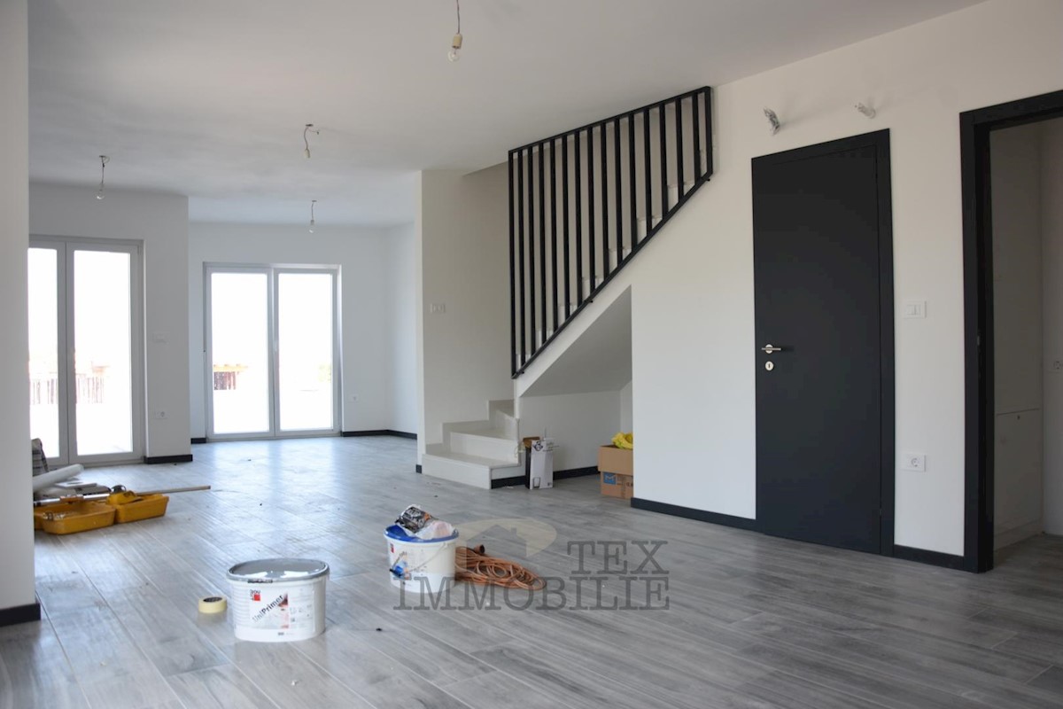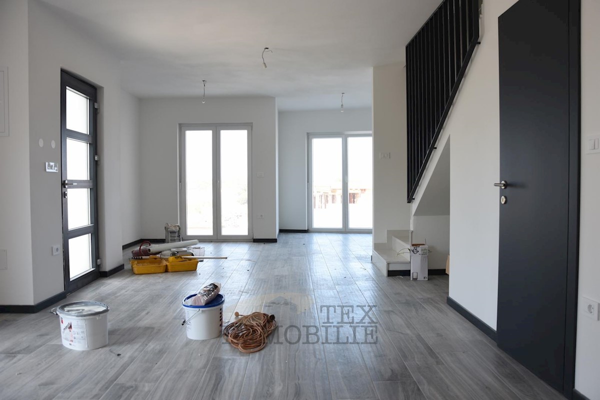 U blizini Poreča, na udaljenosti od 5500 metara od obale, nudi se moderna dvojna kuća smještena na okućnici od 250 m², s ukupnom površinom od 90 m². U prizemlju ćete pronaći otvoreni dnevni boravak koji se spaja s kuhinjom i blagovaonicom, gostinjski WC,