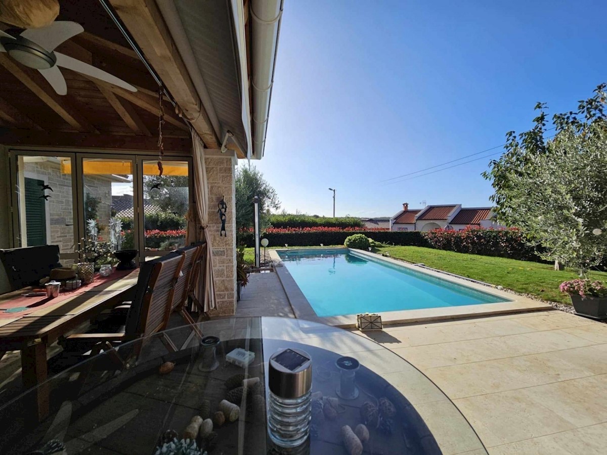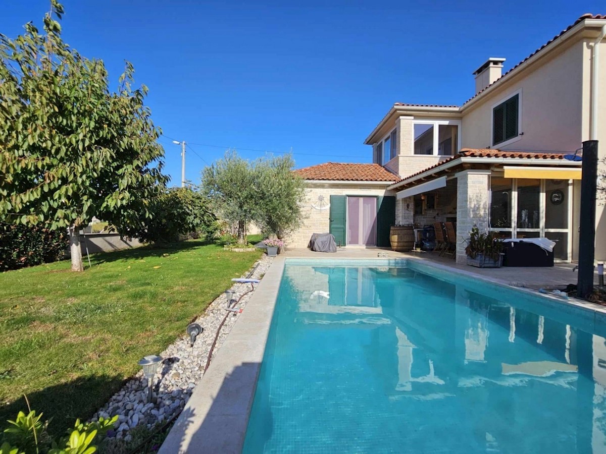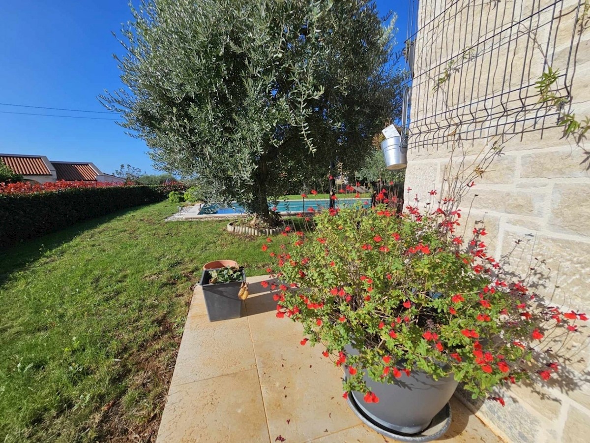 Ca 10 km od Poreča i mora prodaje se samostojeća kuća od 160 m2 na prekrasnoj parceli od 662 m2- kuća ima dnevni boravak, kuhinju i blagovaonicu, 3 spavaće sobe, 3 kupatila, wc za goste, ostavu koja se može koristiti kao spavaća soba, natkrivenu terasu i