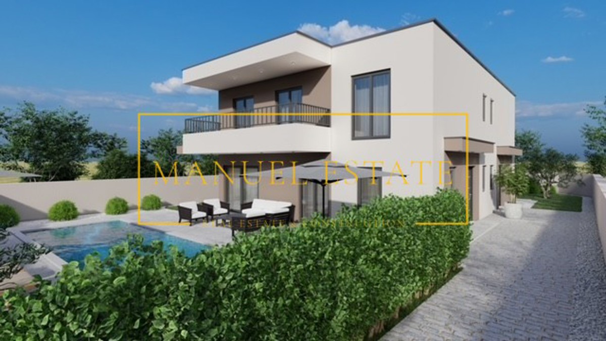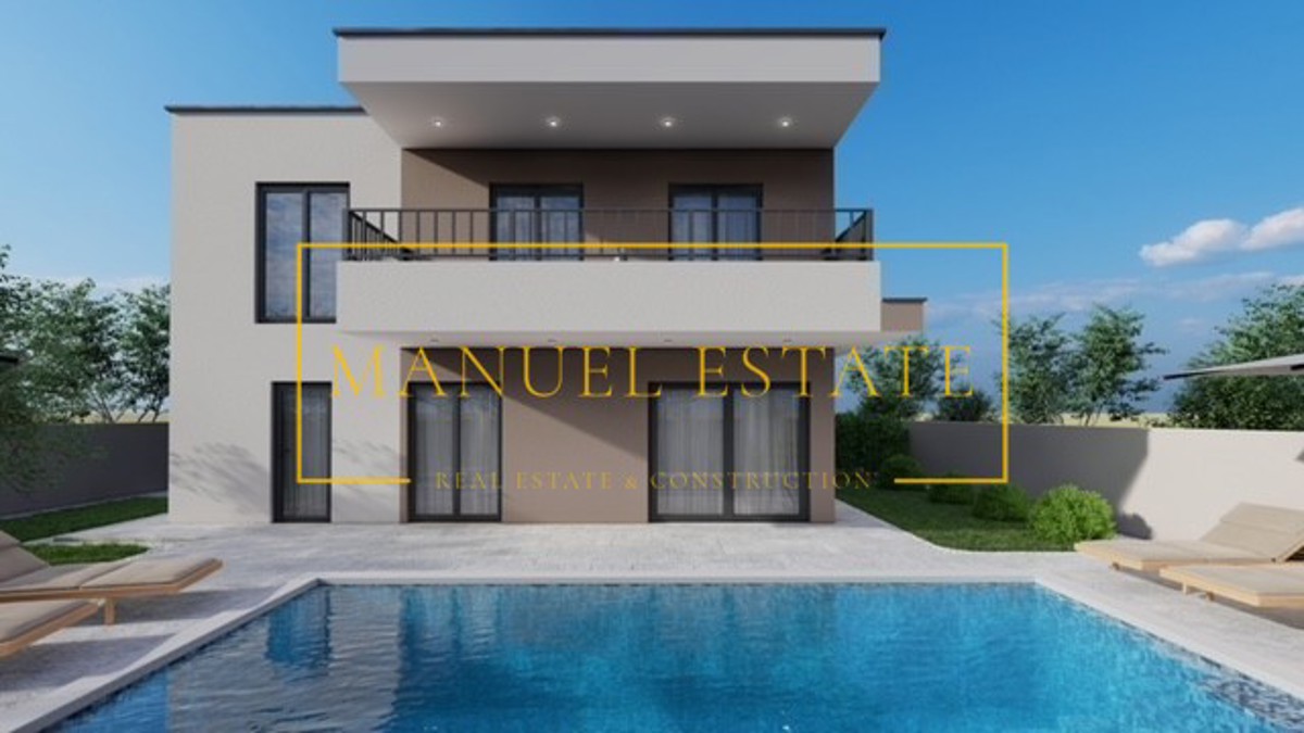 Moderna kuća u blizini Poreča, nalazi se na dobroj lokaciji, u mirnoj ulici, 4 km od centra grada i mora. Kuća površine 122 m2 na parceli od 350 m2. Dvojna kuća na dvije etaže, u prizemlju se nalazi dnevni boravak sa staklenim stijenama, kuhinja i blagov