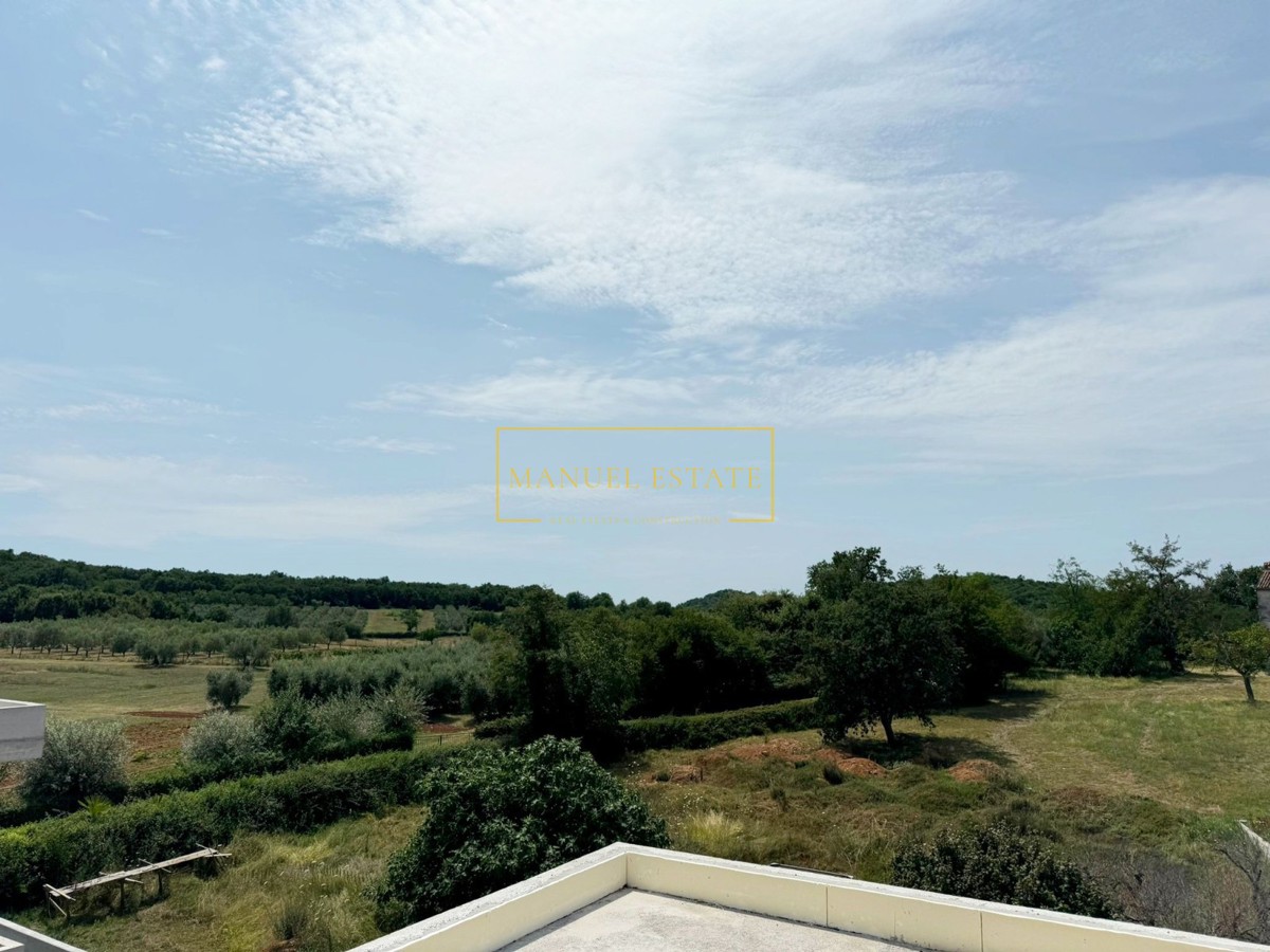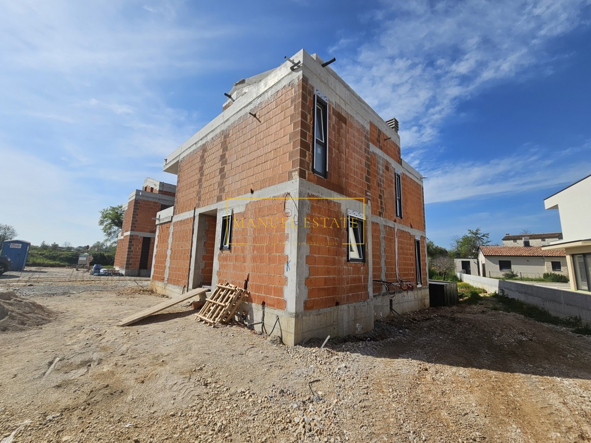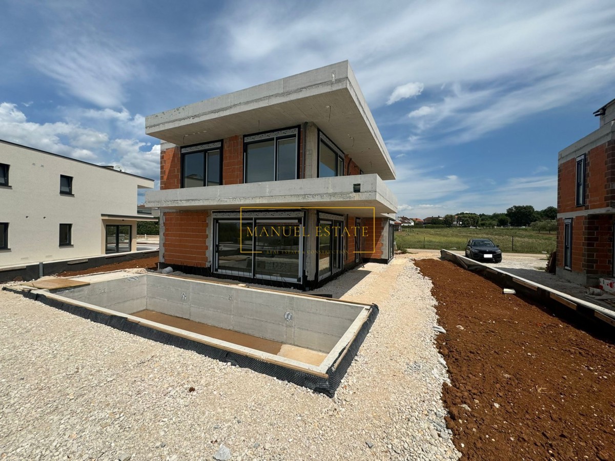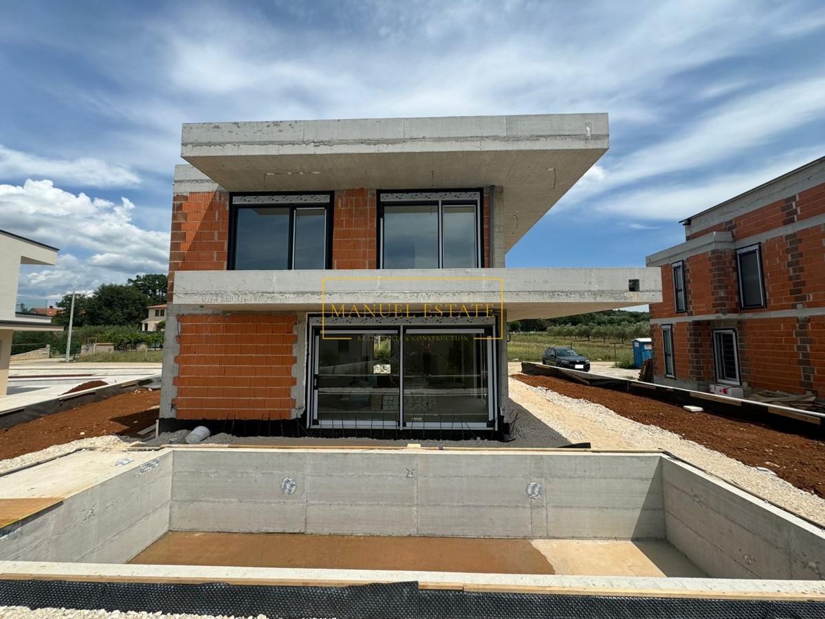 Moderna vila u blizini Poreča, 233 m2, na parceli od 571 m2. U prizemlju se nalazi spremište, wc, tehnička prostorija, wellness zona i open space dnevni boravak s kuhinjom i blagovaonicom s izlazom na natkrivenu terasu. Na prvom katu biti će smještene tri