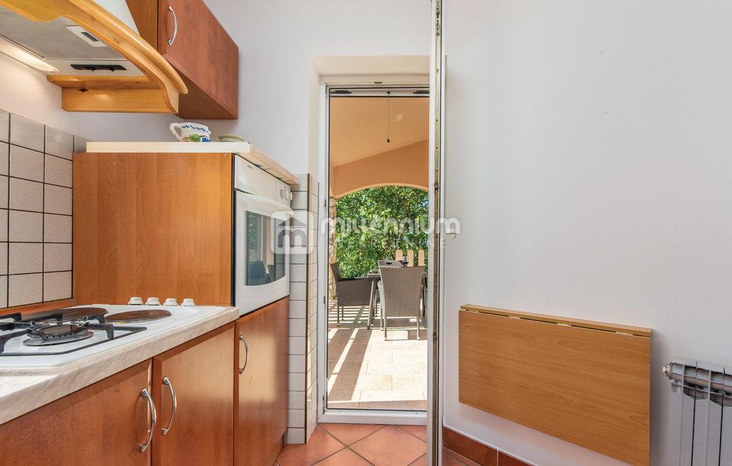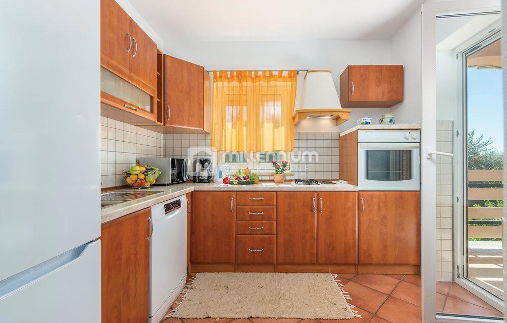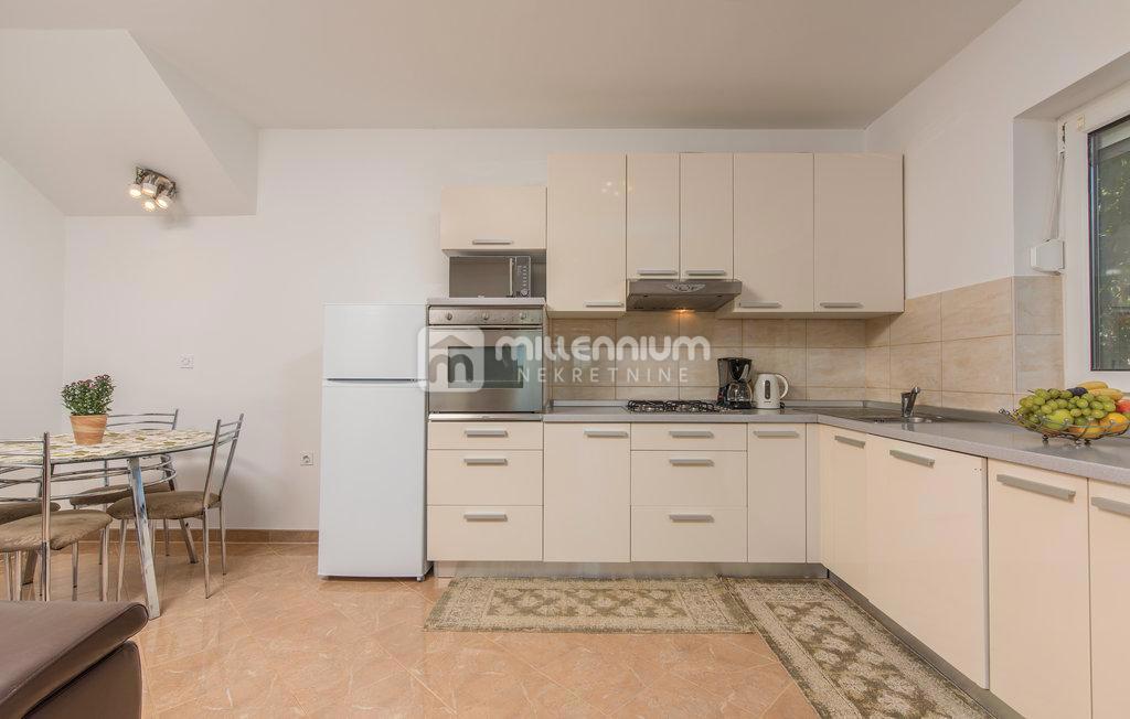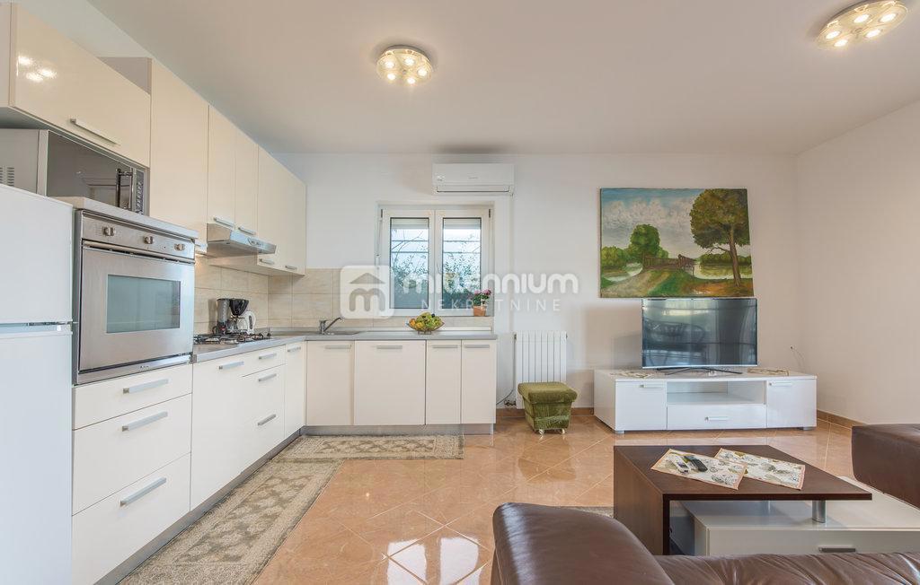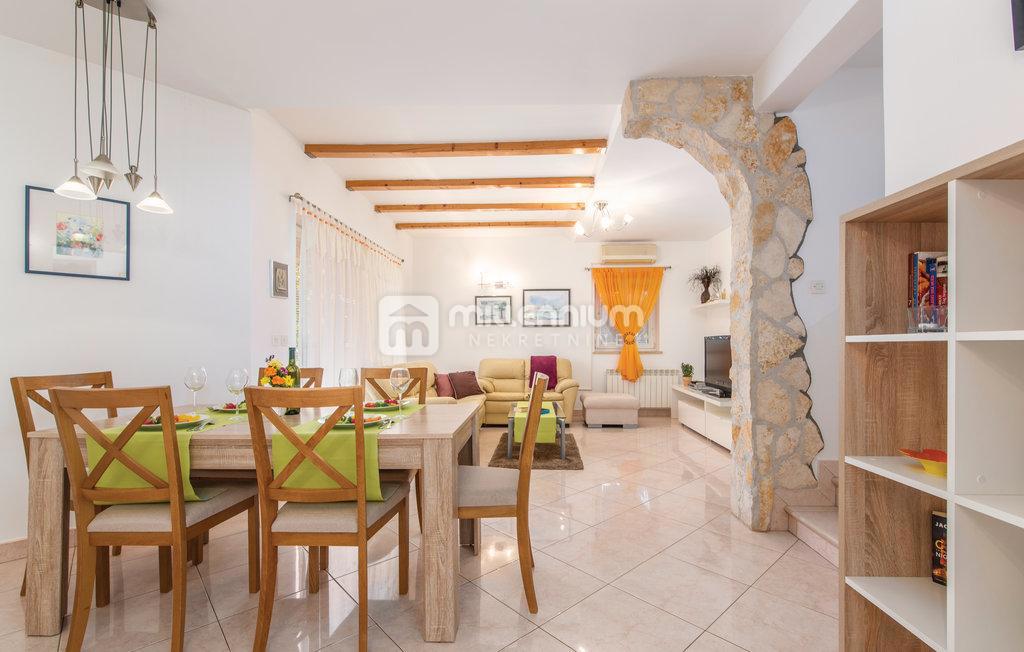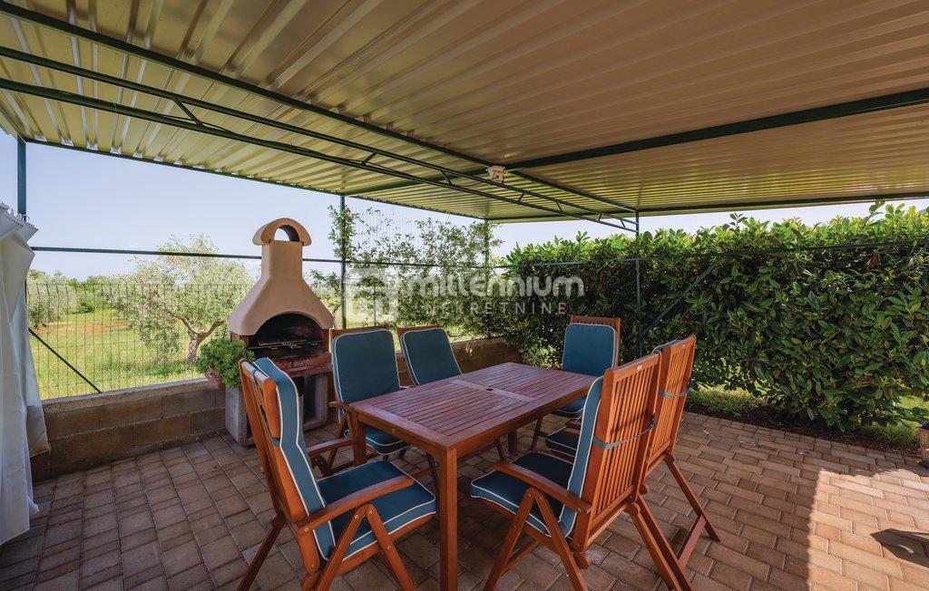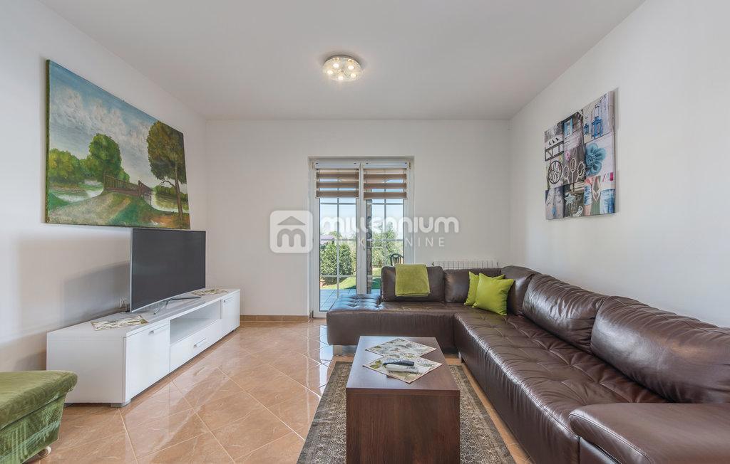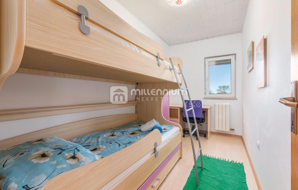 Prodaje se samostojeća kuća s bazenom u malom mjestu nedaleko Poreča. Nalazi se u mirnoj ulici uz zeleni pojas. Razvedena je na prizemlje i kat ukupne površine 190m2. Manji stan od 55m2 smješten je u prizemlju dok se veći, dvoetažni stan površine 105m2 p