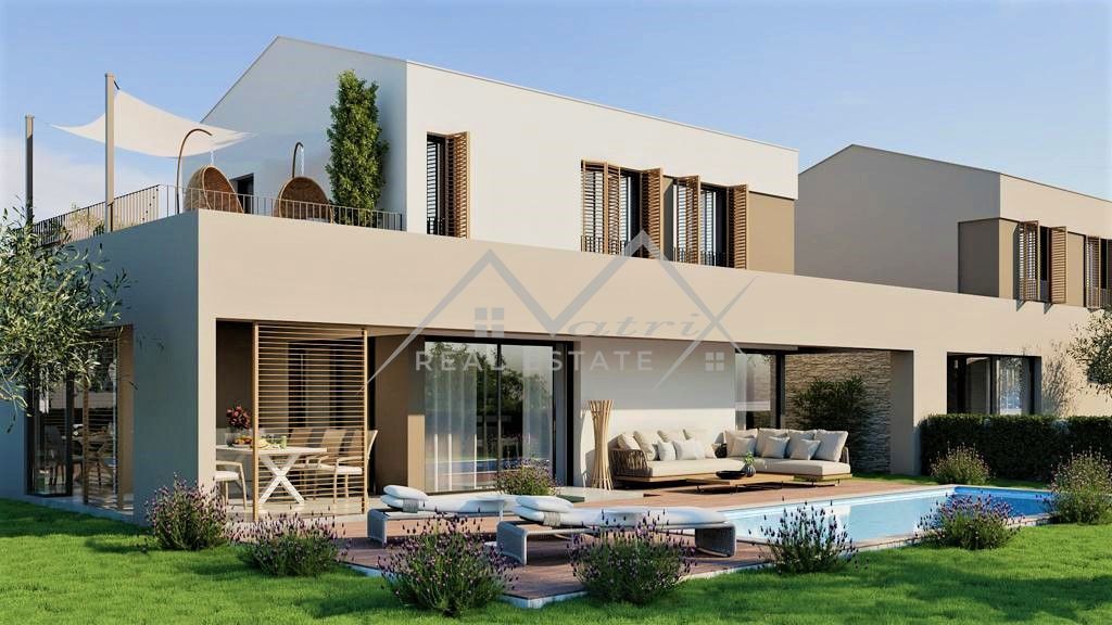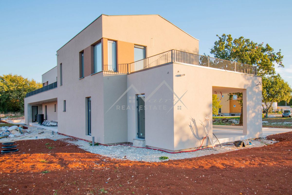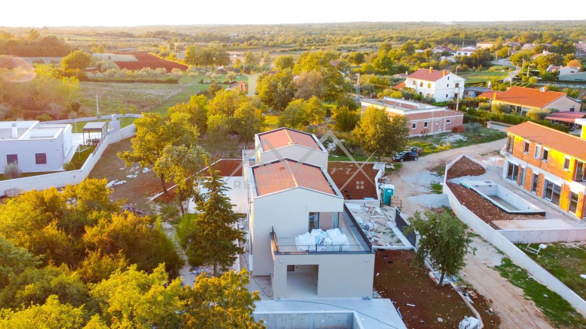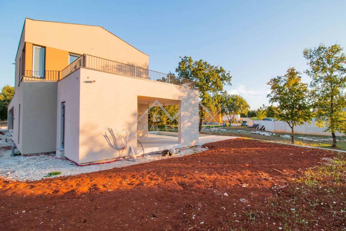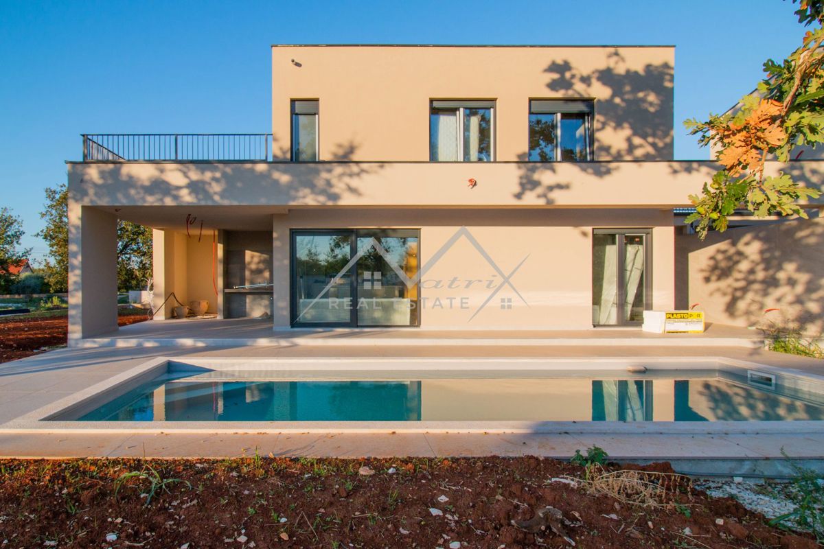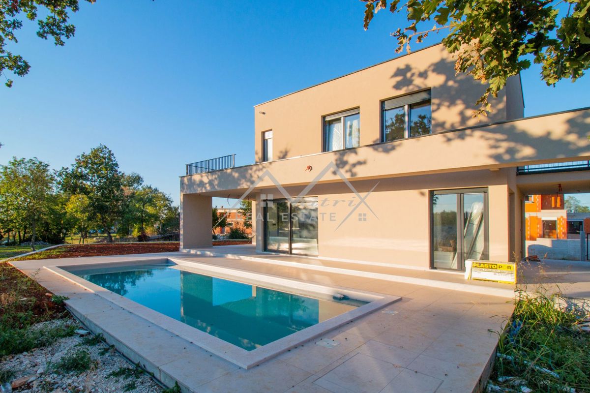 Poreč okolica - Moderno opremljena montažna vila s bazenom i jacuzzijem, na odličnoj lokaciji! Smještena u mirnom naselju, udaljenom samo 7 km od mora i centra Poreča, ova luksuzna vila s bazenom pruža priliku za kupnju idealnog doma. Vila se proteže na