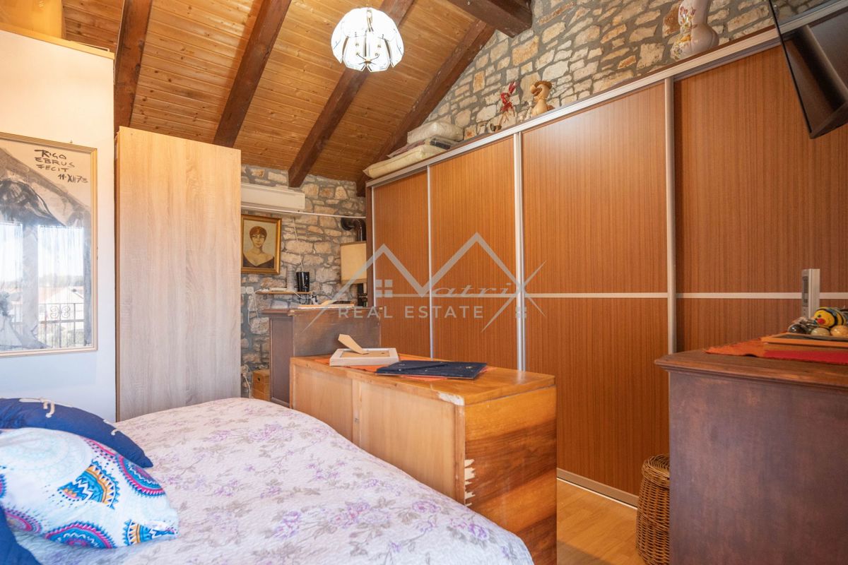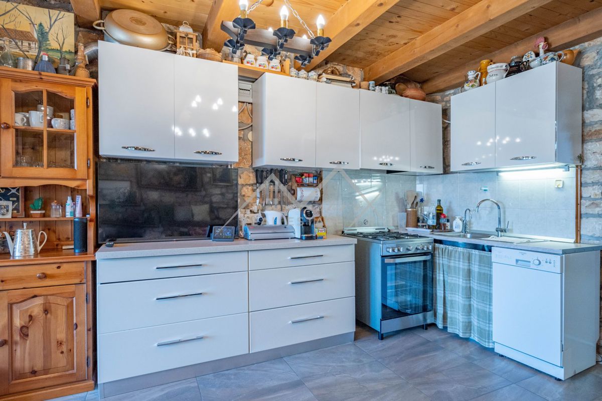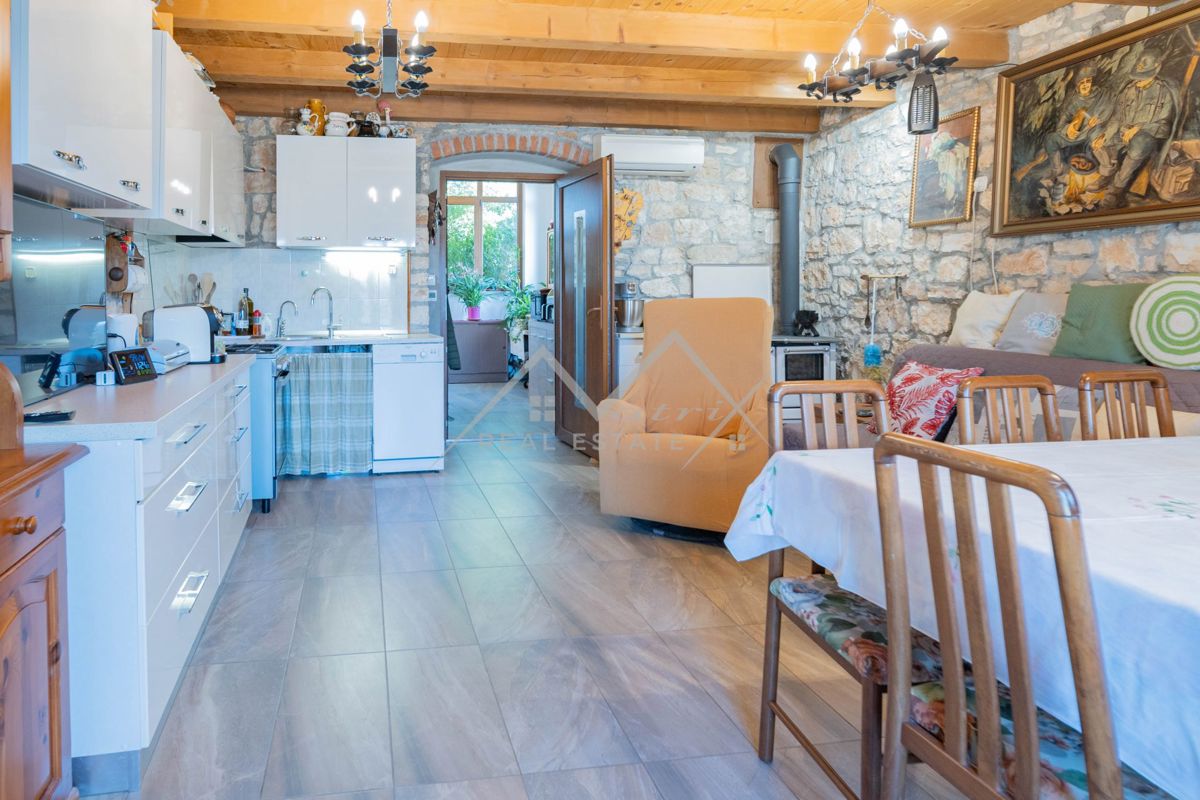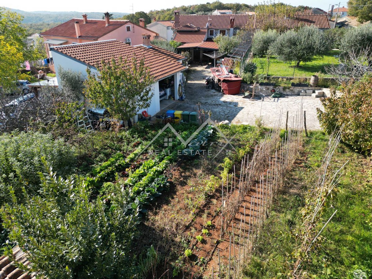 Poreč okolica, kamena kuća sa prostranim dvorištem i vrtom Prodaje se šarmantna kamena kuća u mirnom naselju, samo 15 km od Poreča i plaža te 12 km od Vrsara. Ova obnovljena kuća površine 70 m² smještena je na prostranoj parceli od 623 m². Kuća se prosti