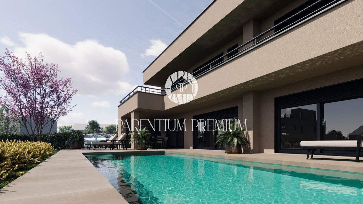 Istra, Poreč - okolica U mjestu sa svim sadržajima smjestila se ova kvalitetna moderna vila sa bazenom ukupne površine od 213m2 sa velikom krovnom terasom površine od 87,4m2. Kuća je podijeljena na 3 etaže. U prizemlju se nalazi otvoreni dnevni boravak