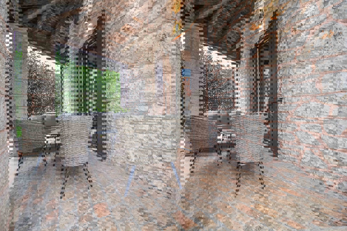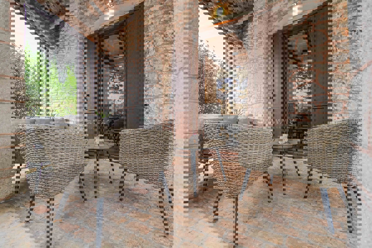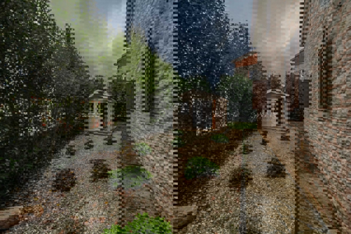 OKOLICA POREČA, ISTRA Ova prekrasna kamena kuća s bazenom nalazi se na mirnoj lokaciji na rubu građevinske zone, pružajući dodatnu privatnost i mir. Kuća je potpuno ograđena te nudi siguran prostor za opuštanje i uživanje na otvorenom. U prizemlju kuće na
