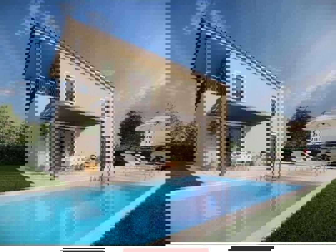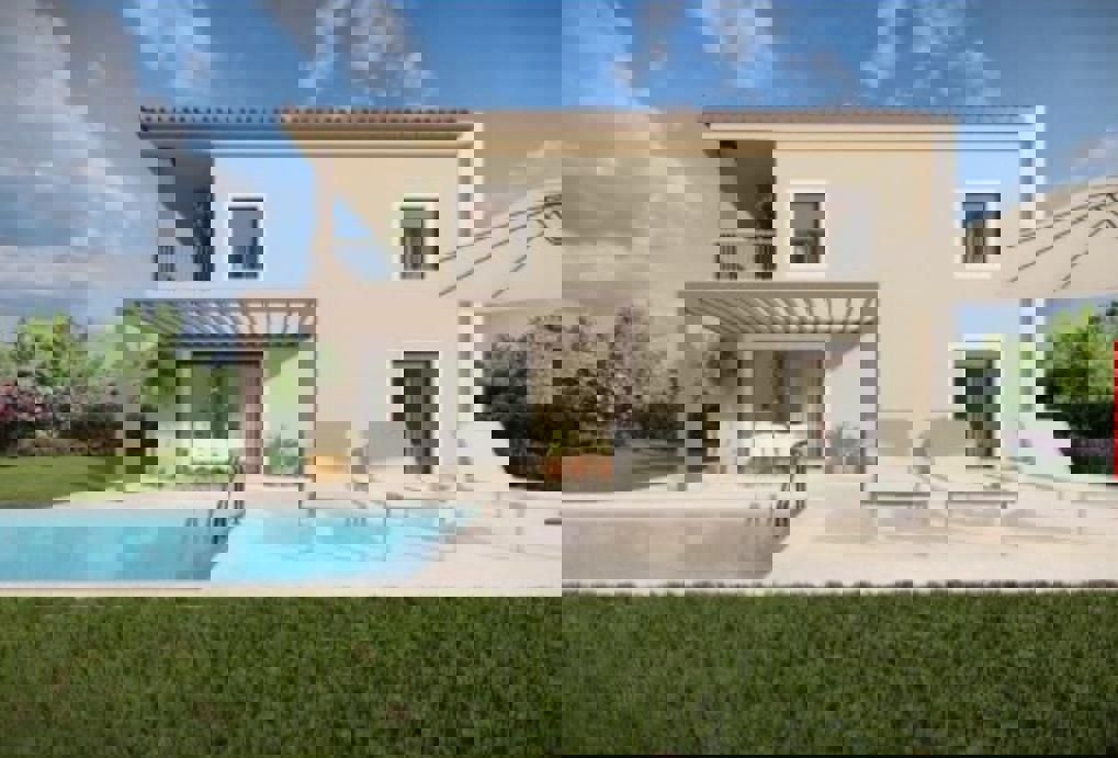 U okolici Baderne prodajem kuću od 132 m2 u roh bau fazi na parceli od 651 m2 i bazenom od 32 m2. Gotova kuća ključ u ruke je 520.000 eura