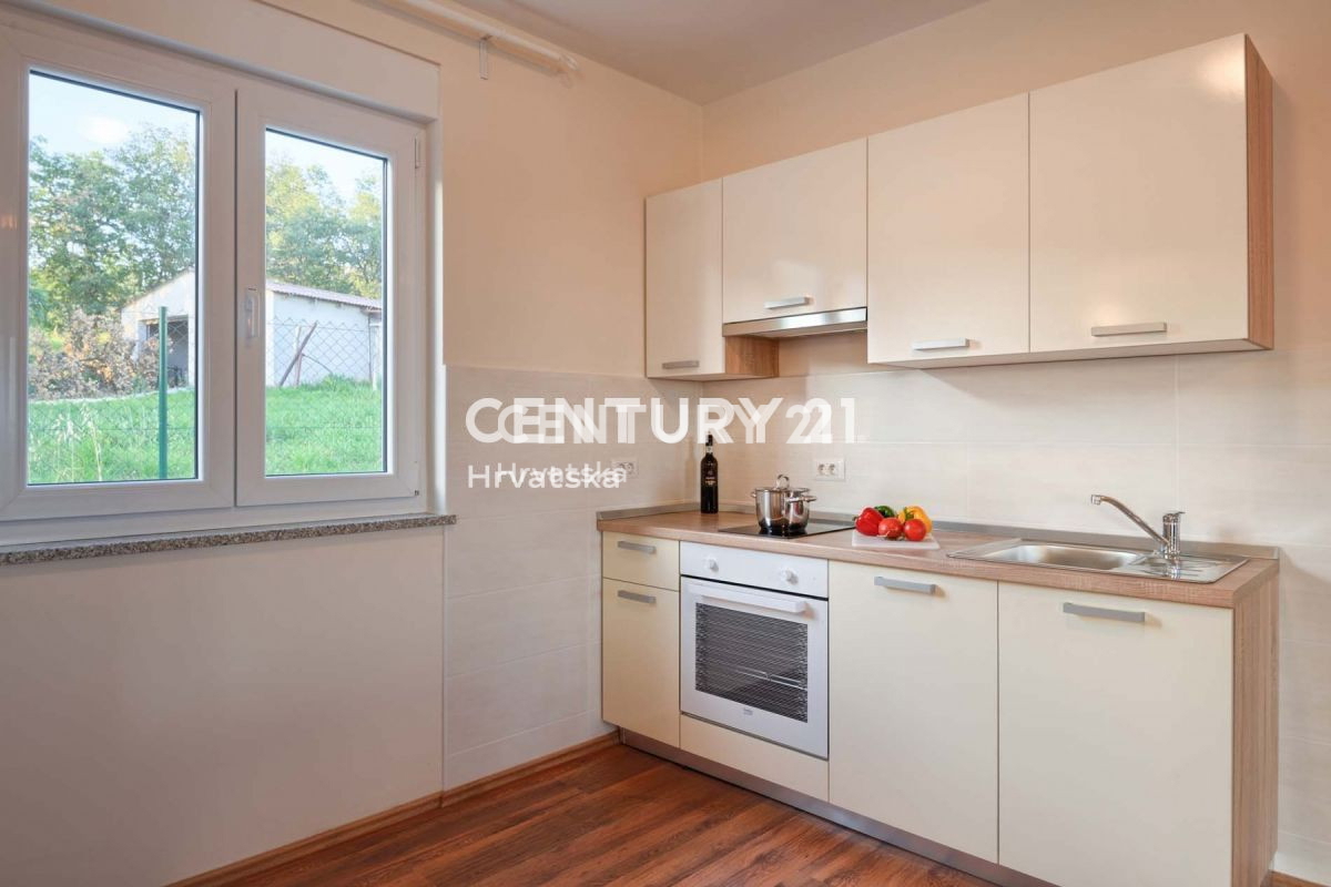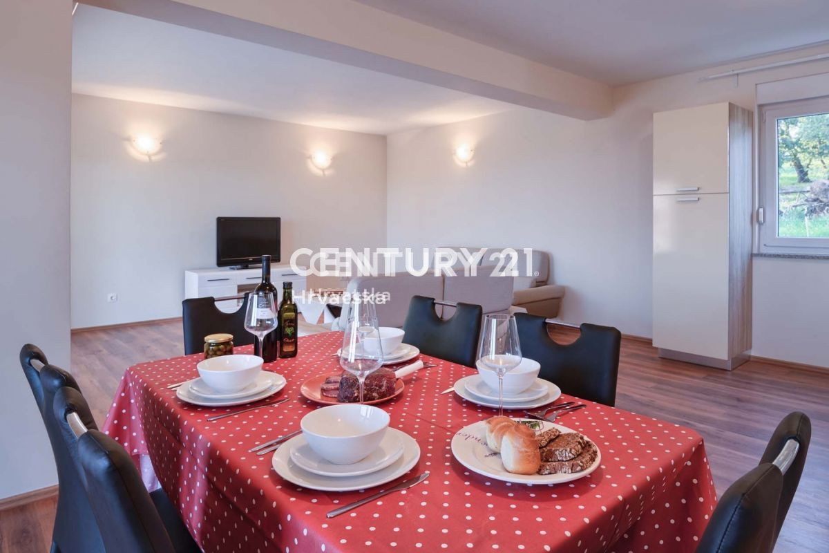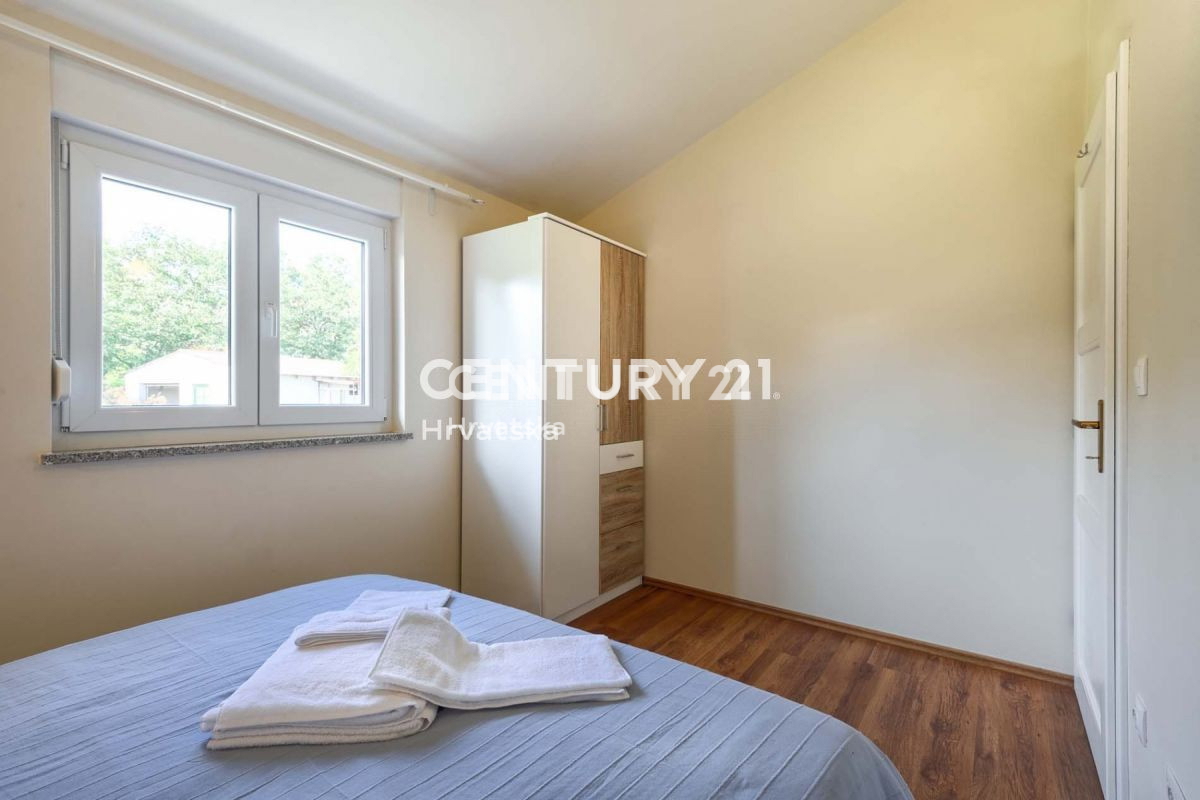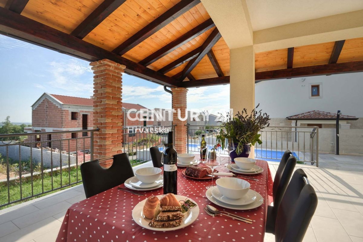 U mirnom naselju udaljenom 11km od Poreča i 7,5km od mora smjestila se ova villa klasičnog dizajna, s bazenom. Villa je izgrađena na parceli od 440m2, na kojoj se nalazi i 2 parking mjesta, kao i bazen veličine 20m2. Pokraj bazena nalazi se i natkriven