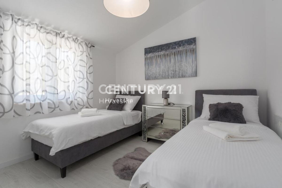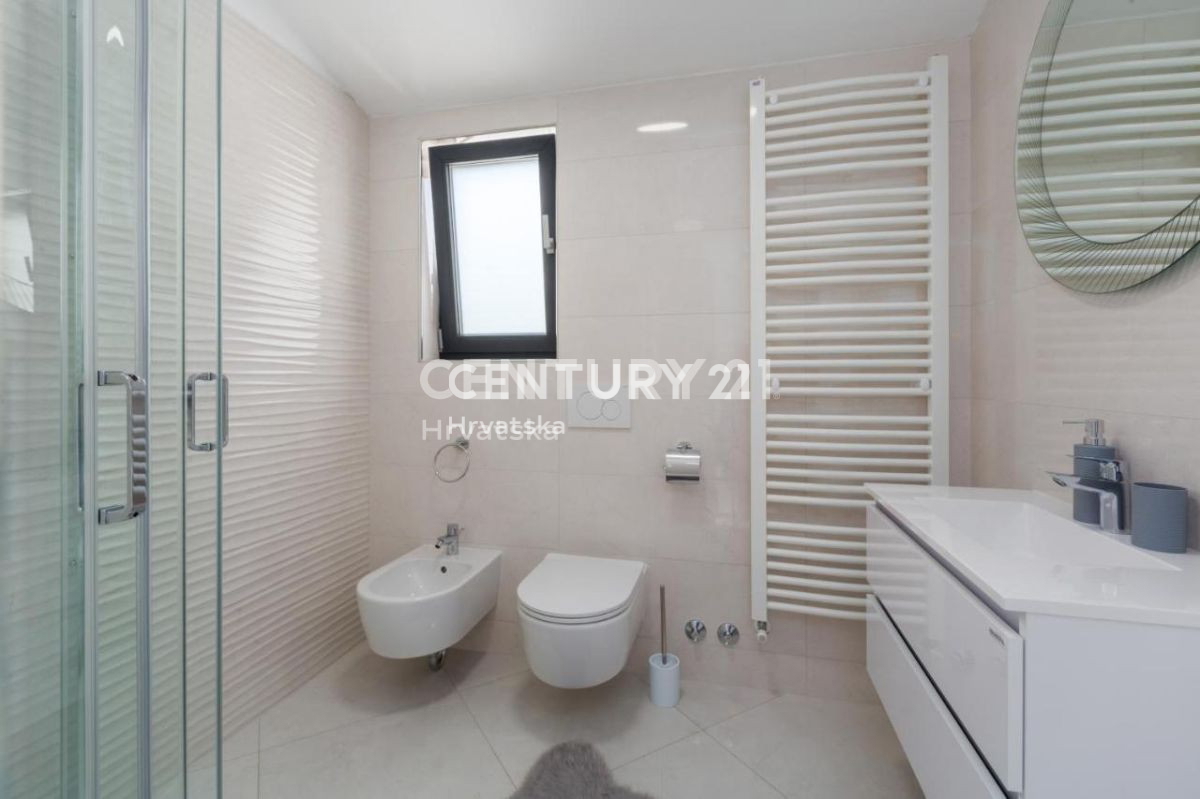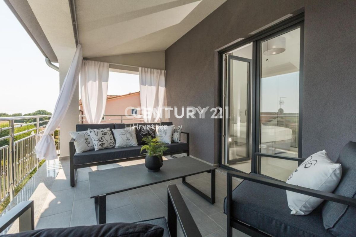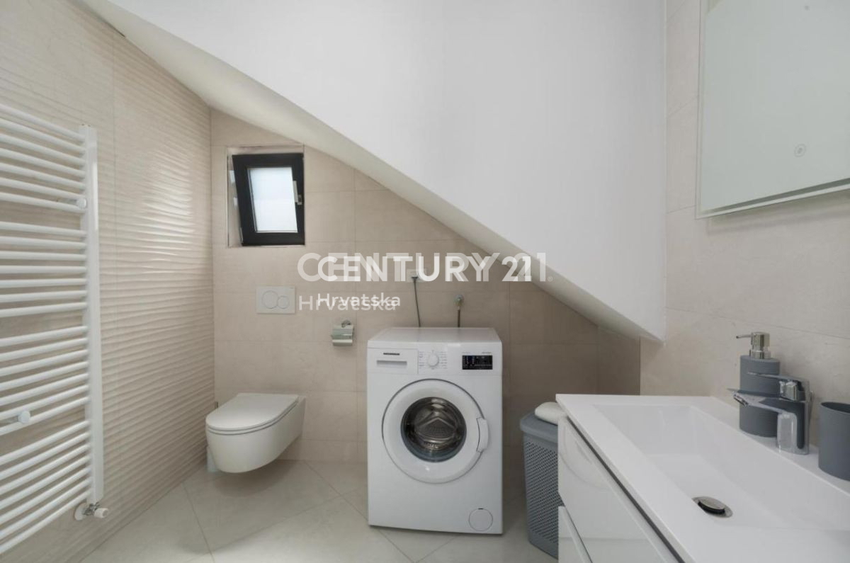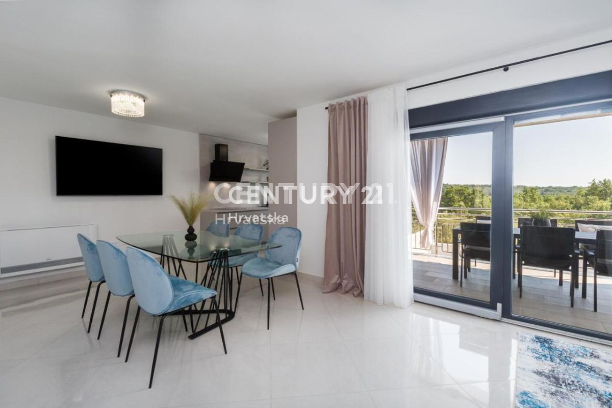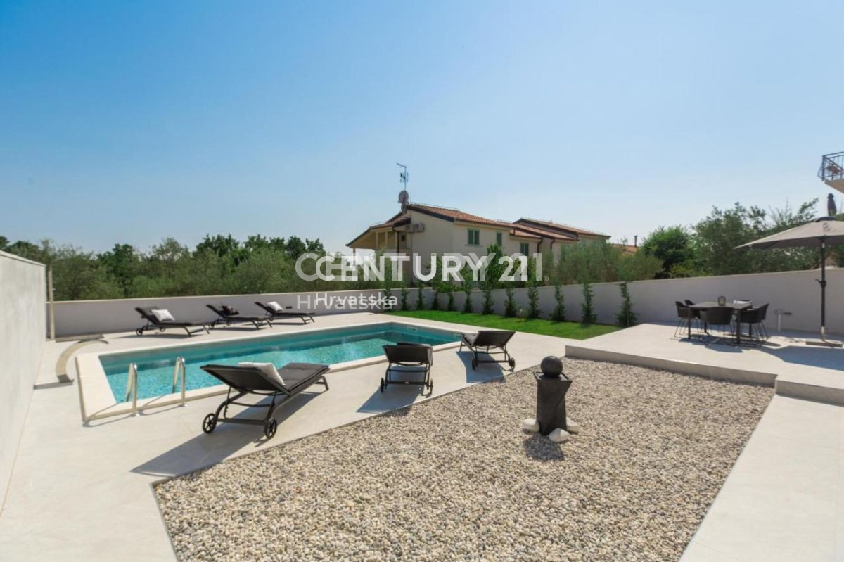 Ova lijepa moderna dvojna kuća nalazi se 7km od Poreča i mora, u mirnom naselju, s pogledom na prirodu i šume. U suterenskom dijelu nalazi se otvorena prostorija s puno mogućnosti uređenja (konoba, soba i sl.). U prizemlju se nalaze dnevni boravak,