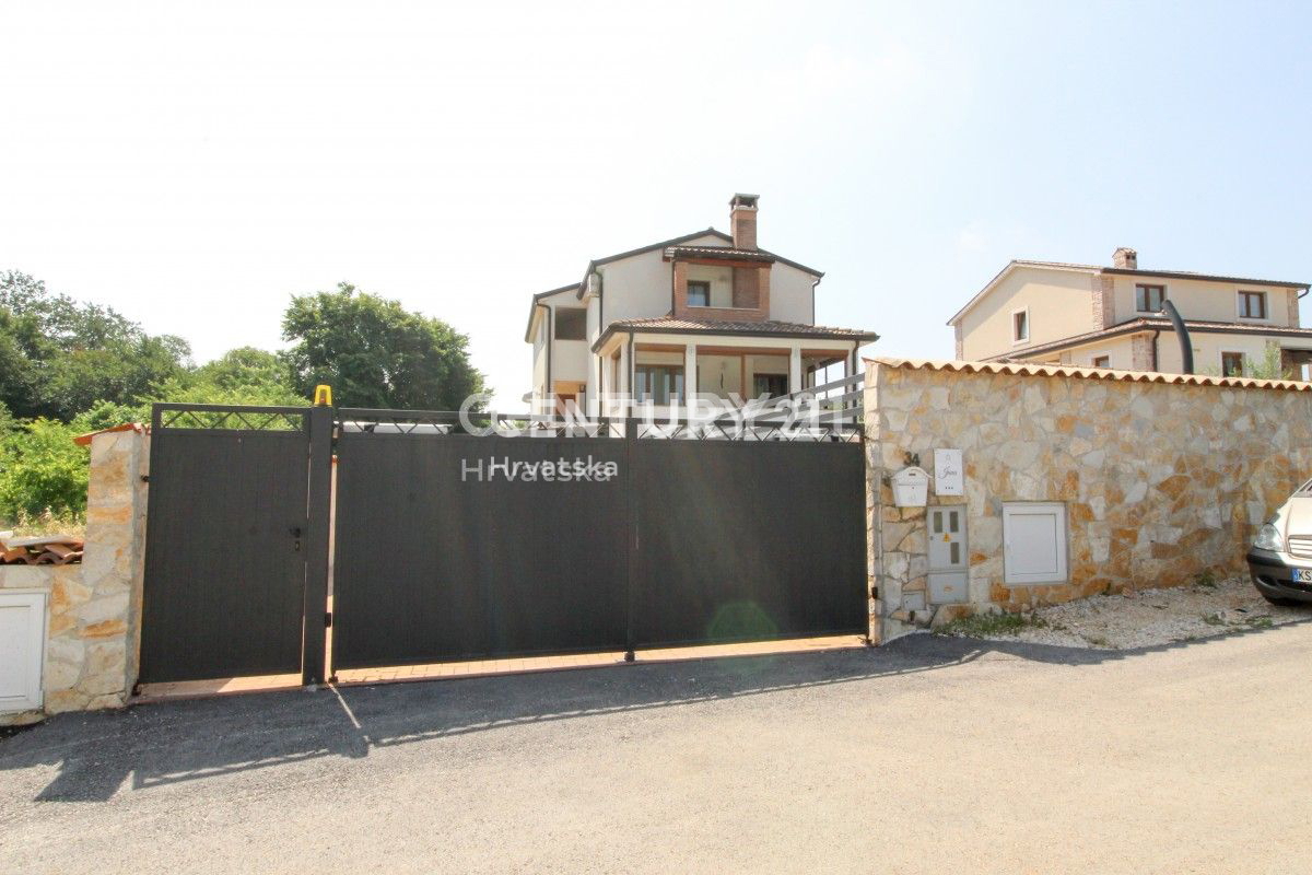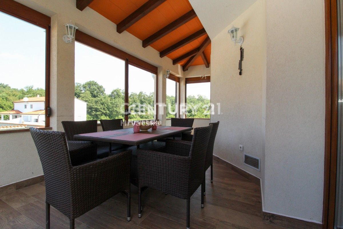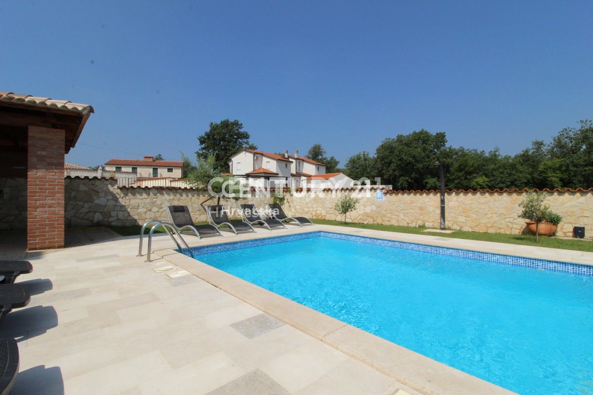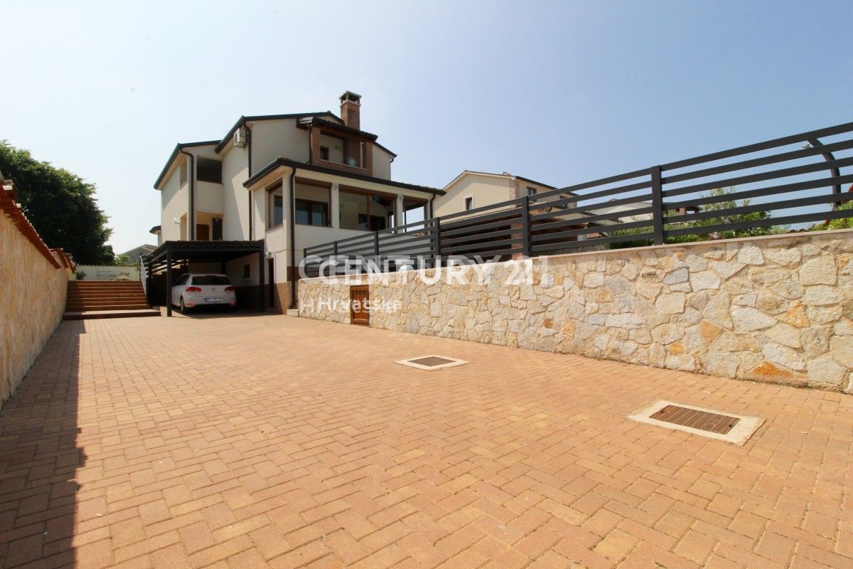 POREČ, 8KM, APARTMANSKA KUĆA S BAZENOM Ova velika kuća s tri stambene jedinice i velikim bazenom nalazi se u mirnom naselju, 8km od Poreča. Ulaskom kroz velika metalna vrata nailazu se na prostrani parking s mjestom za više auta, uz dodatna dva natkri