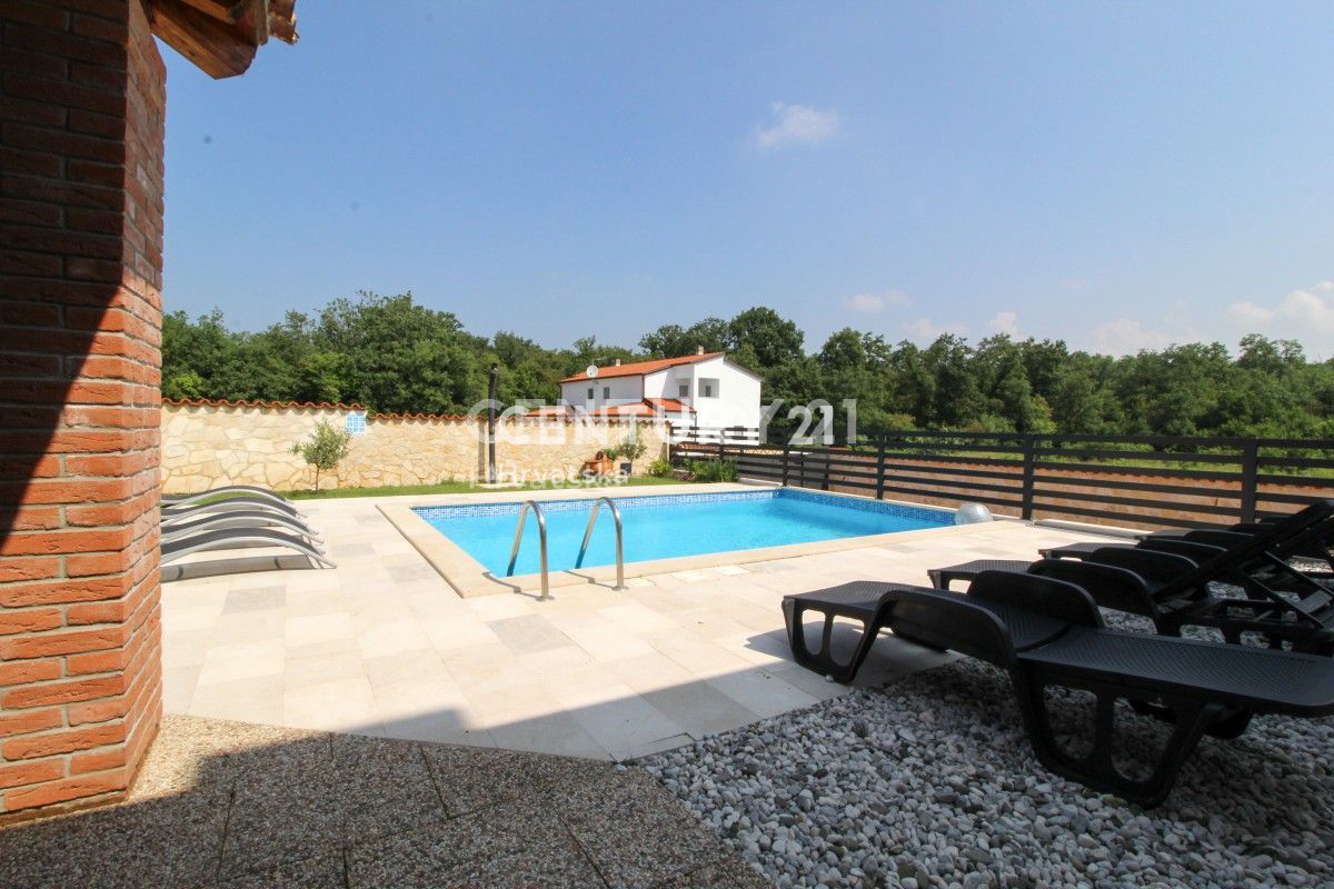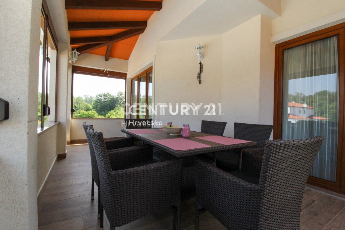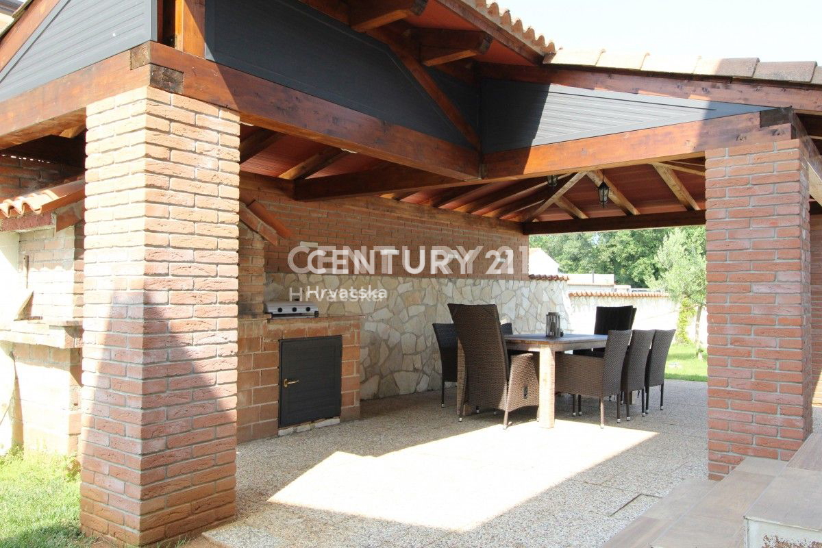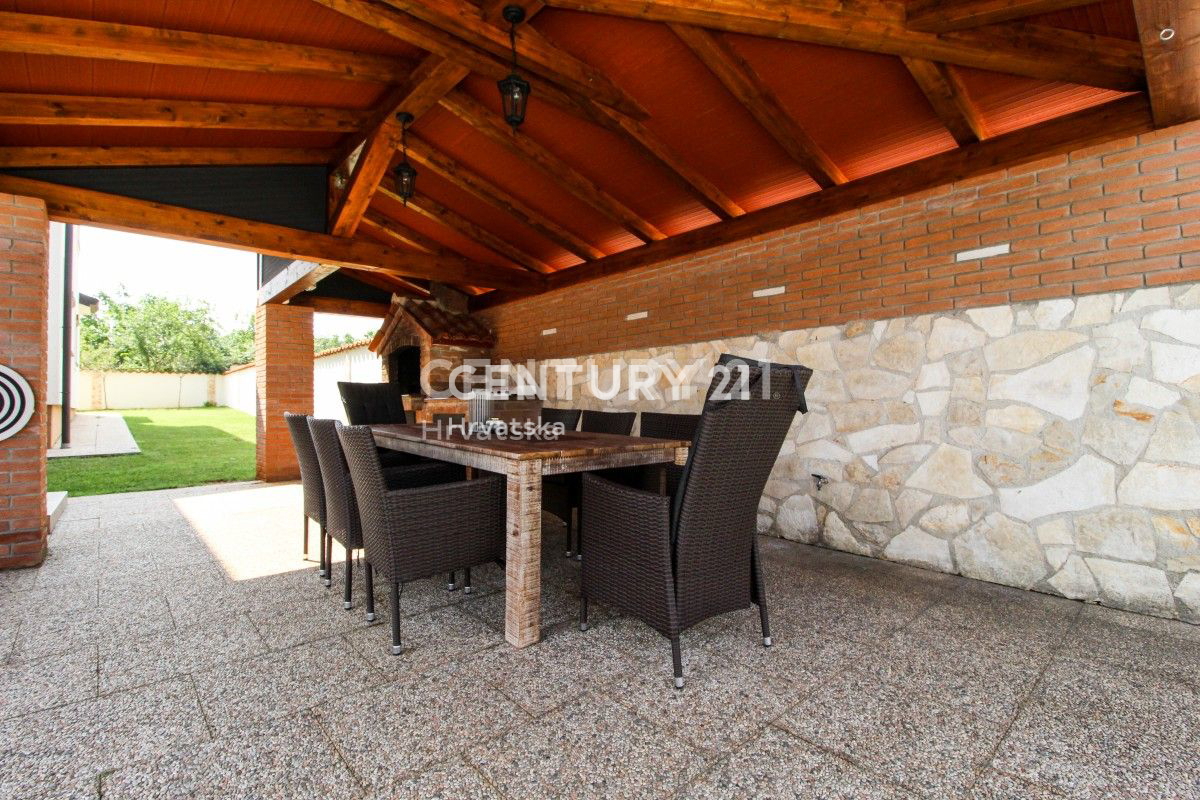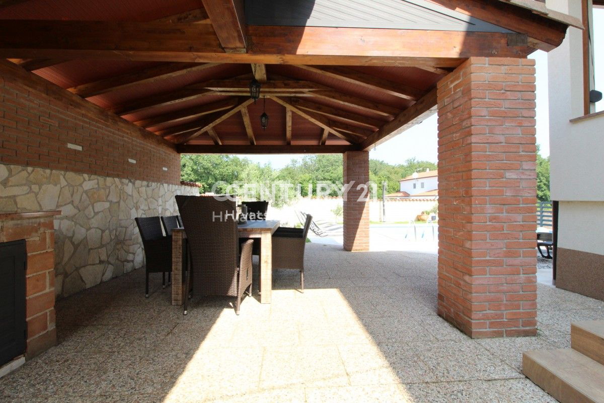 POREČ, 8KM, APARTMANSKA KUĆA S BAZENOM Ova velika kuća s tri stambene jedinice i velikim bazenom nalazi se u mirnom naselju, 8km od Poreča. Ulaskom kroz velika metalna vrata nailazu se na prostrani parking s mjestom za više auta, uz dodatna dva natkri