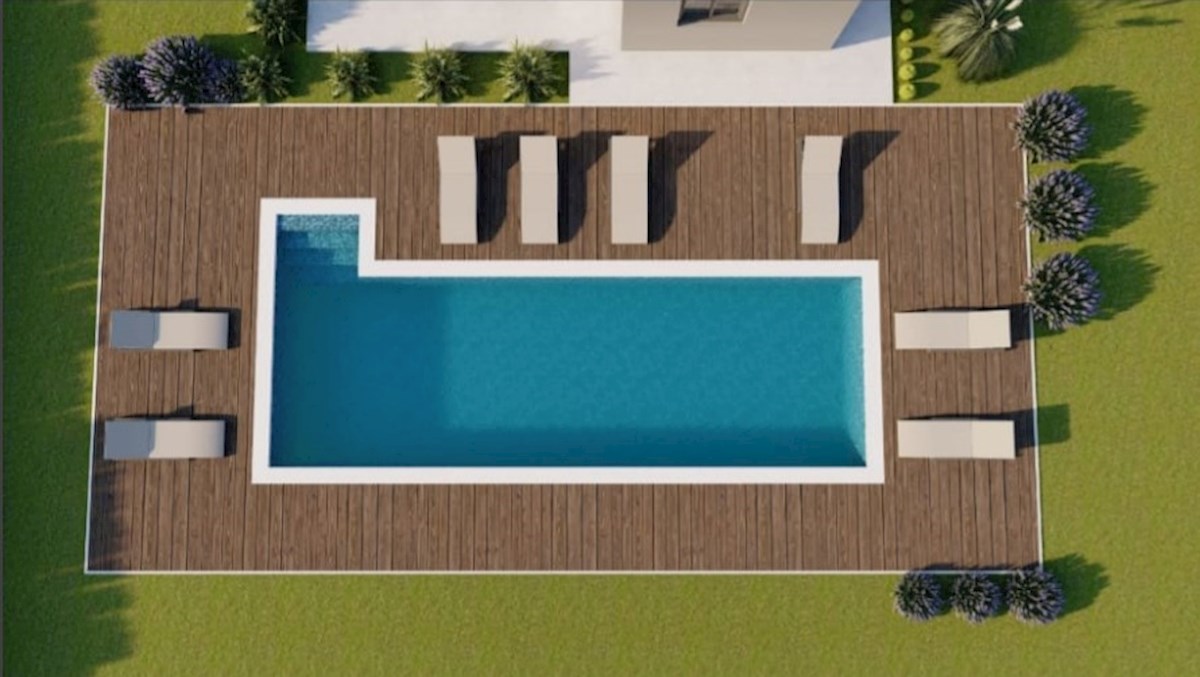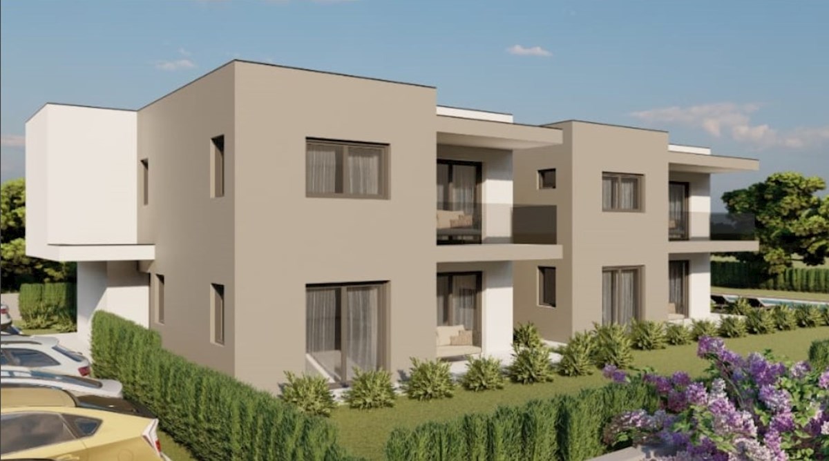 Poreč, okolica, Stan u prizemlju s vrtom i zajedničkim bazenom ID 2234 Prodajemo stan u modernoj zgradi u izgradnji, koja se sastoji od ukupno pet stambenih jedinica – tri smještene u prizemlju i dvije na katu. Zgrada nudi zajednički bazen, idealan za