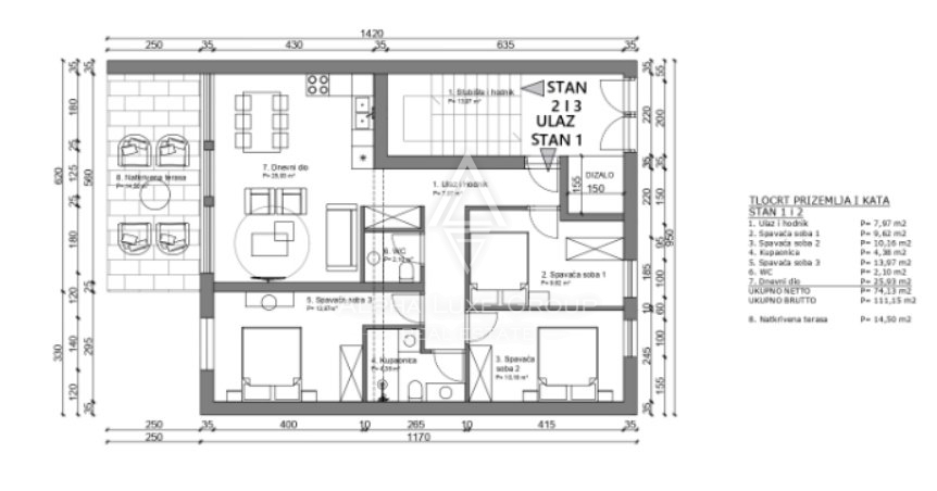 Smješten samo 800 metara od obale Jadranskog mora, ovaj moderan stan u prizemlju nudi suvremeni stil života na atraktivnoj lokaciji. Nalazi se u novogradnji i prostire se na netto površini od 82 m², uključujući natkrivenu terasu od 14 m², idealnu za uživa