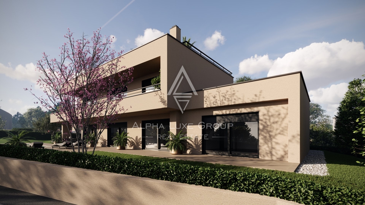 Poreč, Ekskluzivna vila s panoramskim pogledom na more Na prodaju: Moderna vila u izgradnji, smještena u mirnom okruženju nedaleko od Poreča. Ova nekretnina ima neto stambenu površinu od 320 m² i bruto površinu od 434 m², raspoređenu na tri etaže: priz