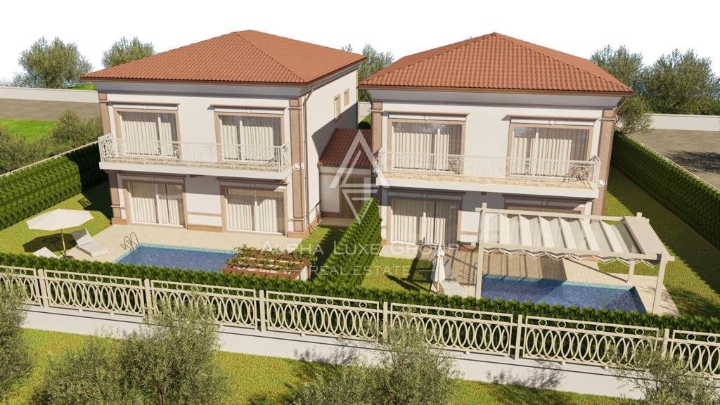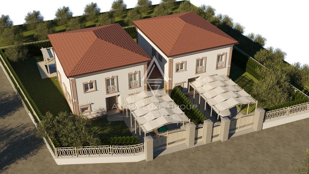 U mjestu Nova Vas, udaljeno samo 6 km od grada Poreča i mora, nalazi se dvojna kuća s pogledom na more, od koje svaka ima 240 m2 i okućnicu od 550 m2 na kojoj se nalazi bazen, 2 parkirna mjesta i kotlovnica od 19 m2. U blizini kuća nalaze se 2 trgovine,