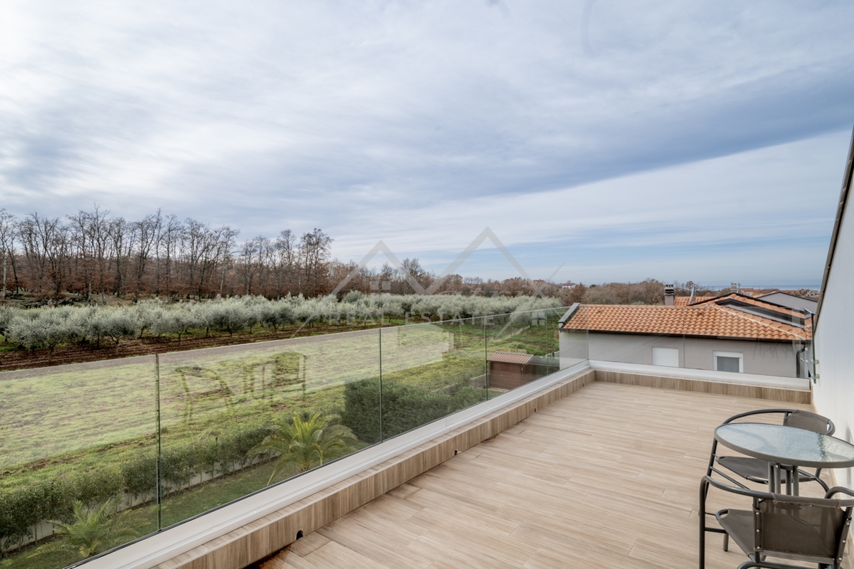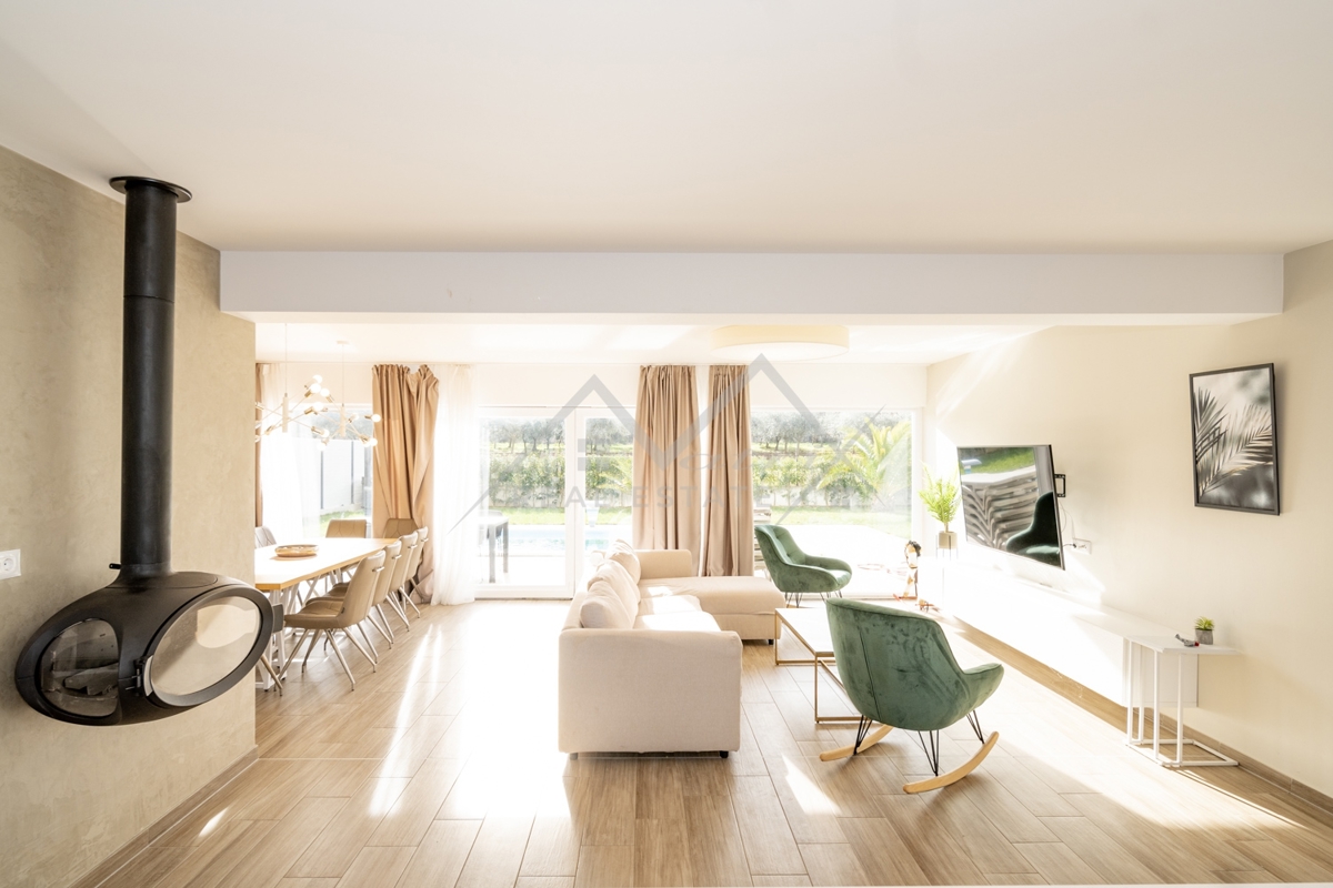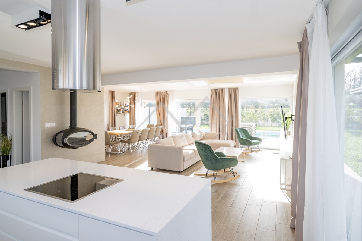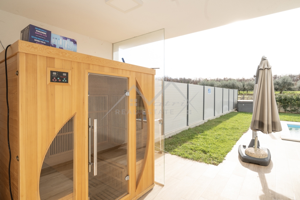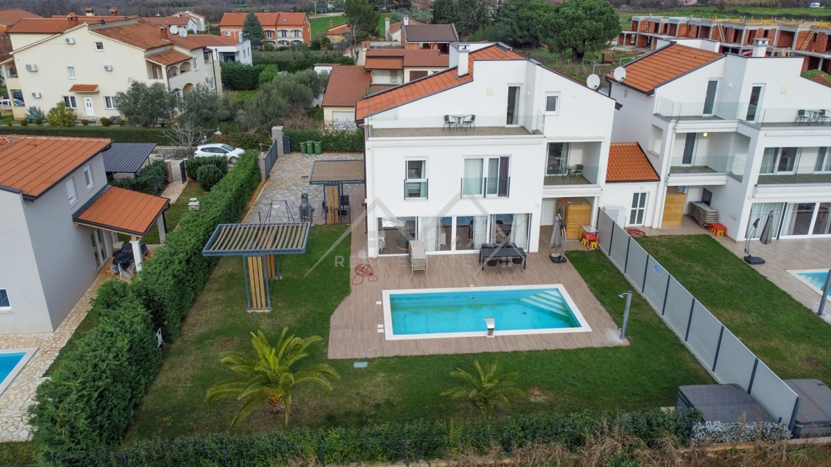 Okolica Poreča Predstavljamo vam doista jedinstvenu, moderno i luksuzno namještenu dvojnu vilu s privatnim bazenom, smještenu u mirnom predgrađu samo 5 km od živopisnog centra grada i prekrasnih plaža Poreča. Smještena na parceli od 800 m², ova nekretnin