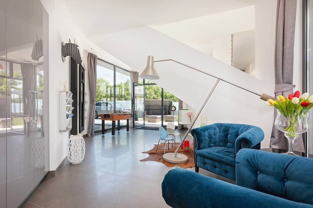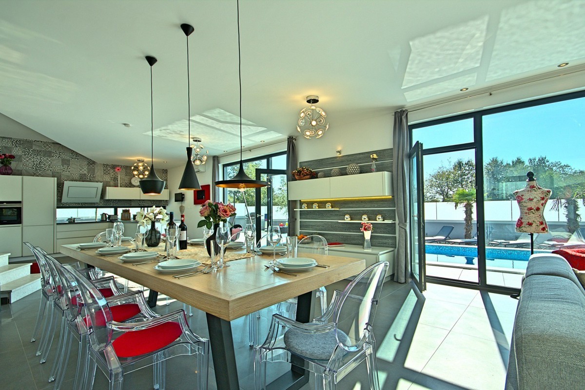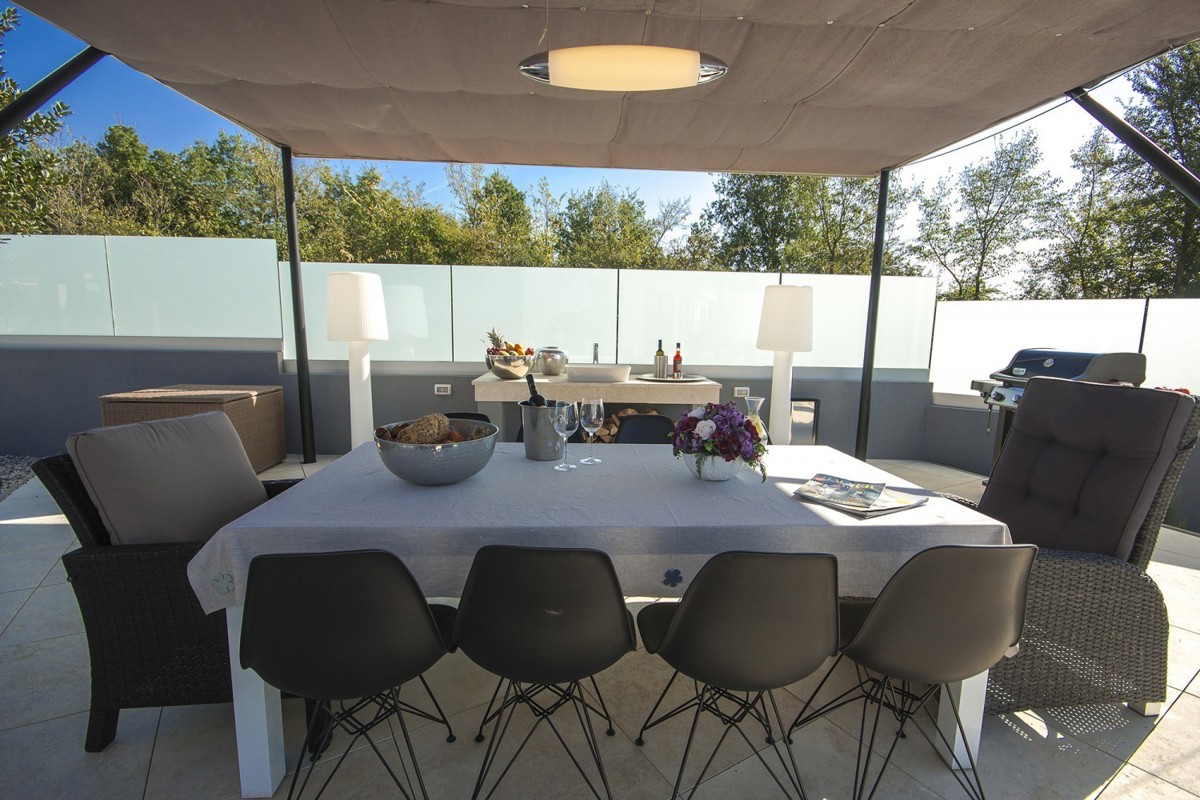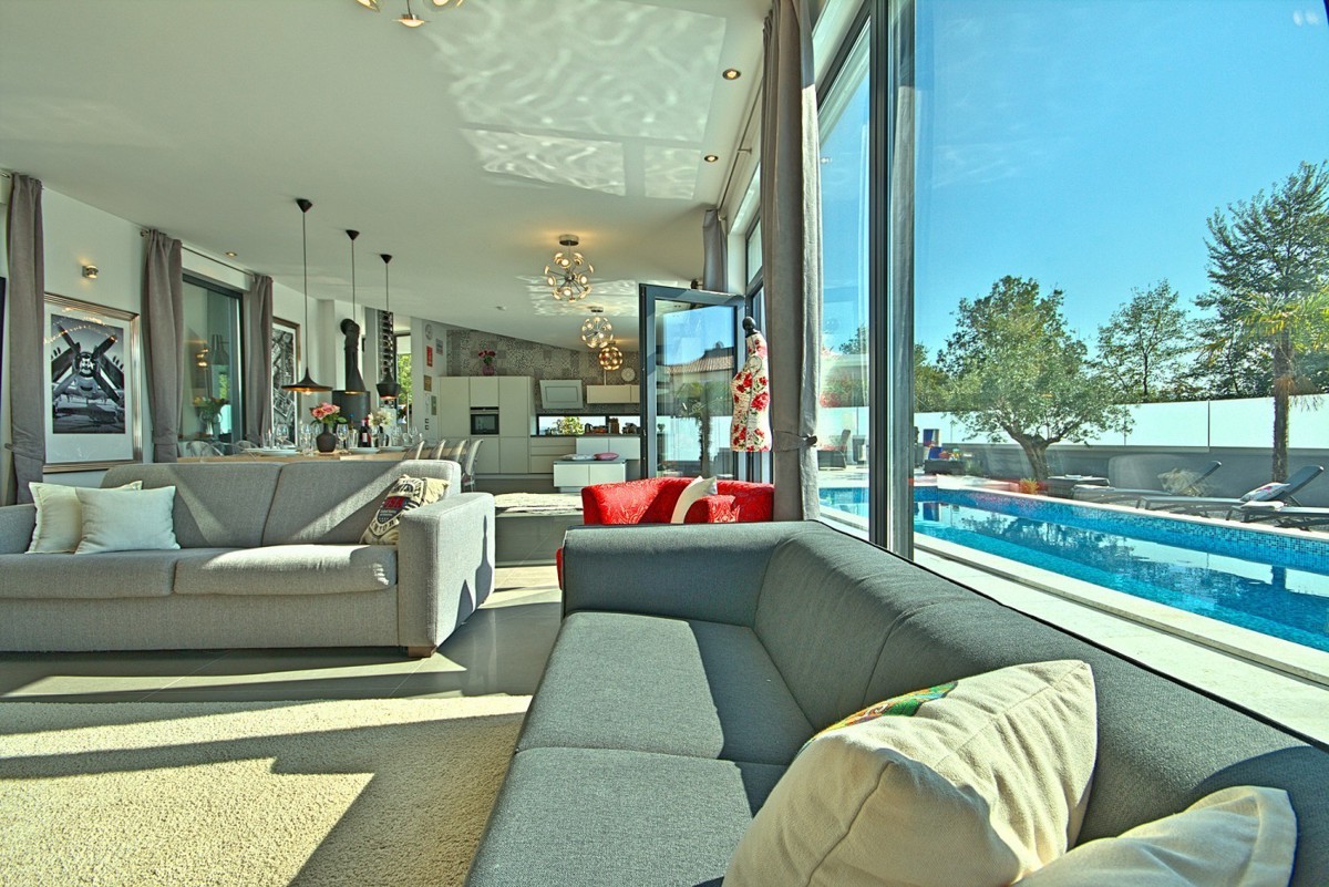 Ca 9 km od Poreča i mora, u mjestu sa odličnom infrastrukturom, prodaje se prekrasna namještena i opremljena vila od 385 m2 sa bazenom od 38 m2- prizemlje: dnevni boravak + kuhinja, 2 sobe, 2 kupaonice, wc, spremište, praonica + kotlovnica, 2 wc-a i ve