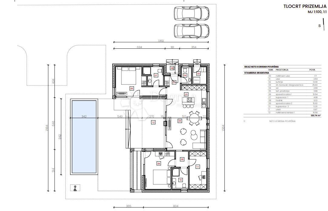 Ova luksuzna prizemnica prostire se na 120 m² stambenog prostora, smještena na parceli od 700 m². Kuća je dizajnirana kao savršen obiteljski dom, s fokusom na udobnost i moderni stil života. Centralni dio kuće čini prostrani "open space" prostor koji spaj
