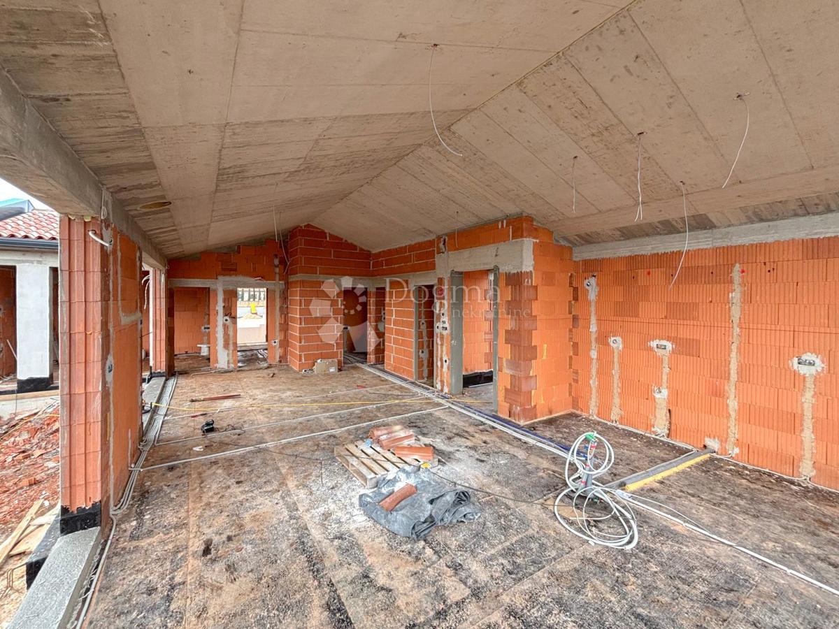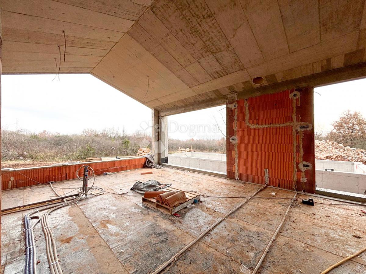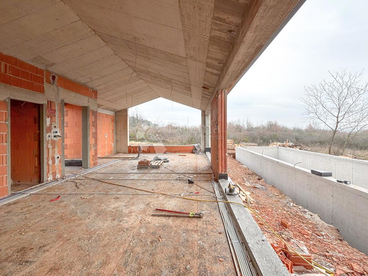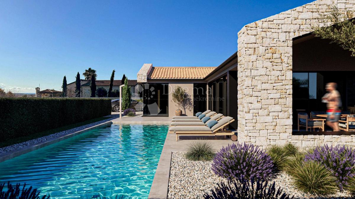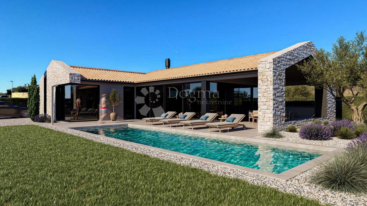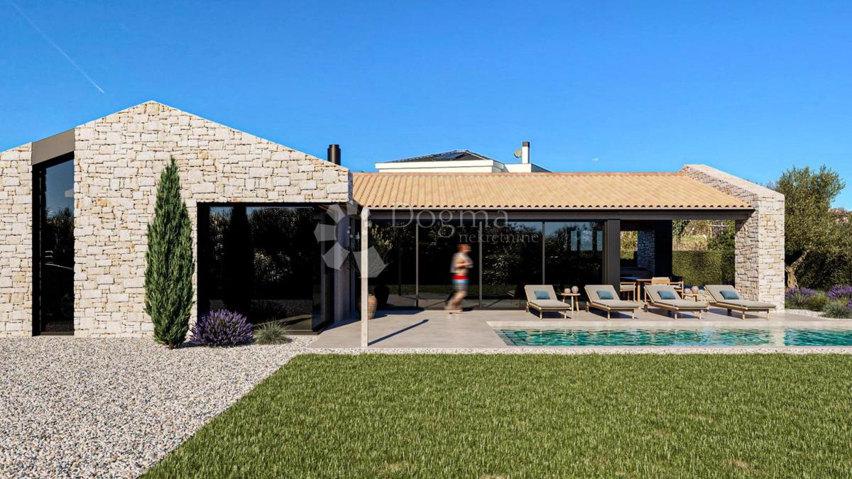 Ova moderna vila smještena u okolici Poreča, na rubu građevinske zone, prostire se na 130 m², uz okućnicu od 500 m², i nudi prekrasan pogled na netaknutu prirodu. Vila je dizajnirana kao prizemnica, a centralni dio kuće čini prostrani "open space" prostor
